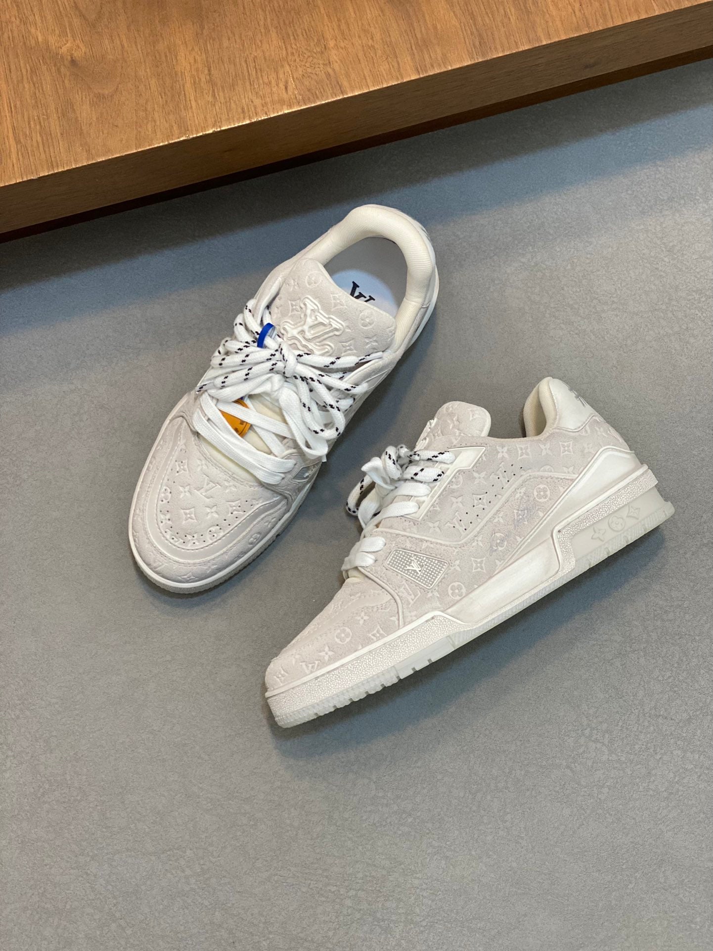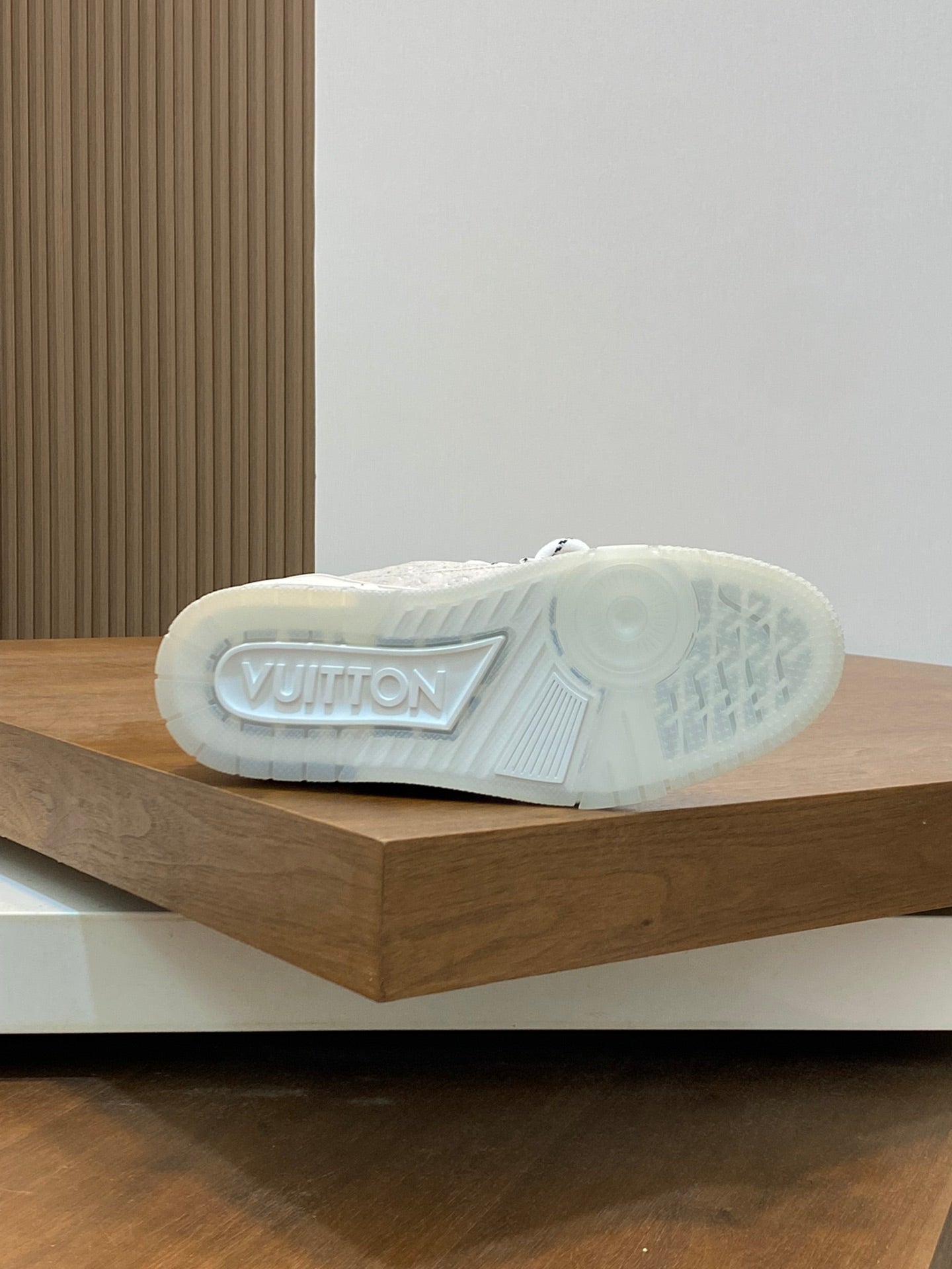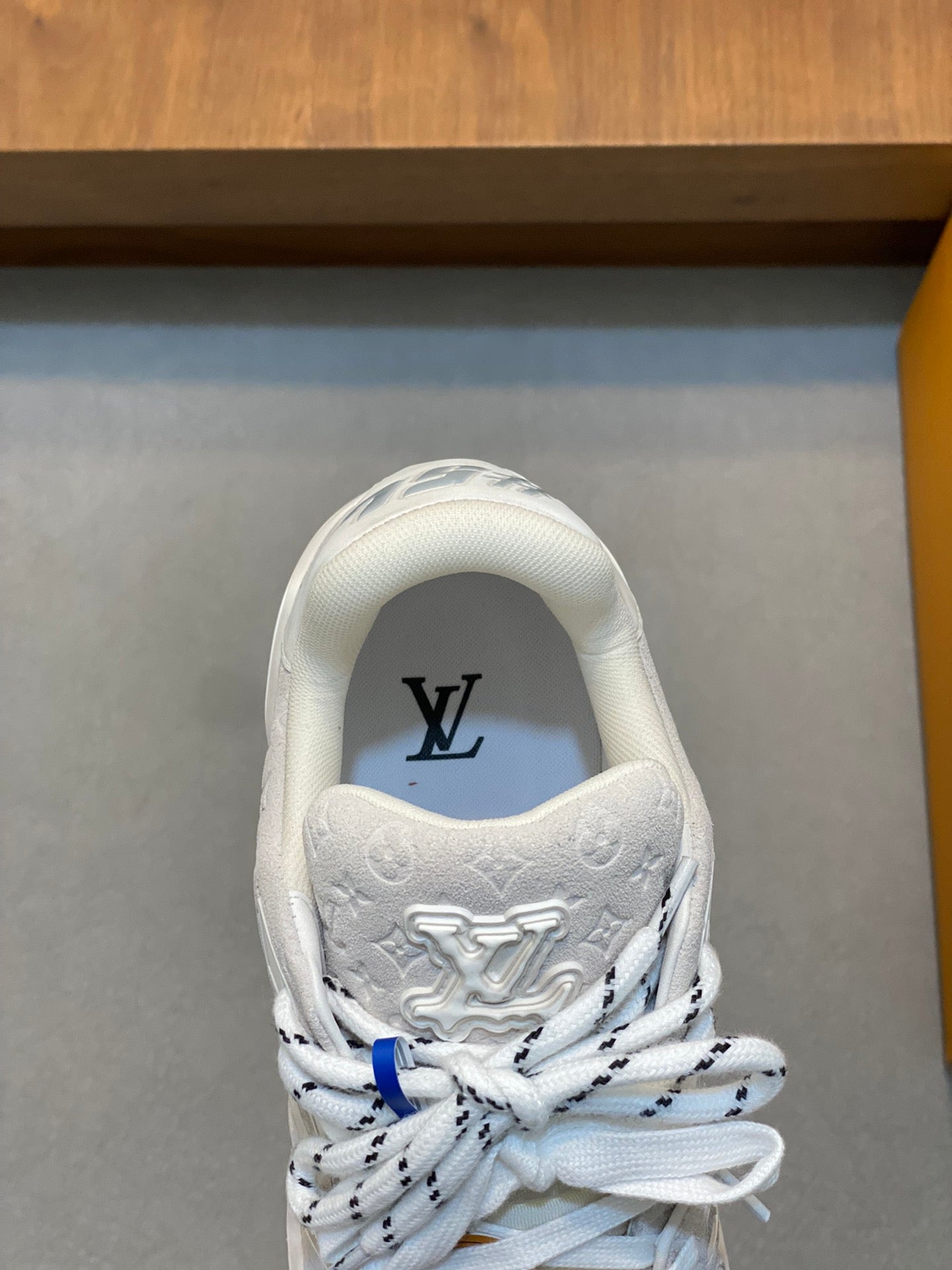 This LV Trainer Maxi is from the 2024 Early Fall collection. Made from pebbled calf leather with vibrant Damier patterns, it reinterprets Virgil Abloh’s original design with a bold, wide silhouette. Thick yet lightweight EVA rubber outsole completes the structure. Rubber LV logo accents on the tongue, sides, and heel, with wide fabric laces decorated with Louis Vuitton bead logos.