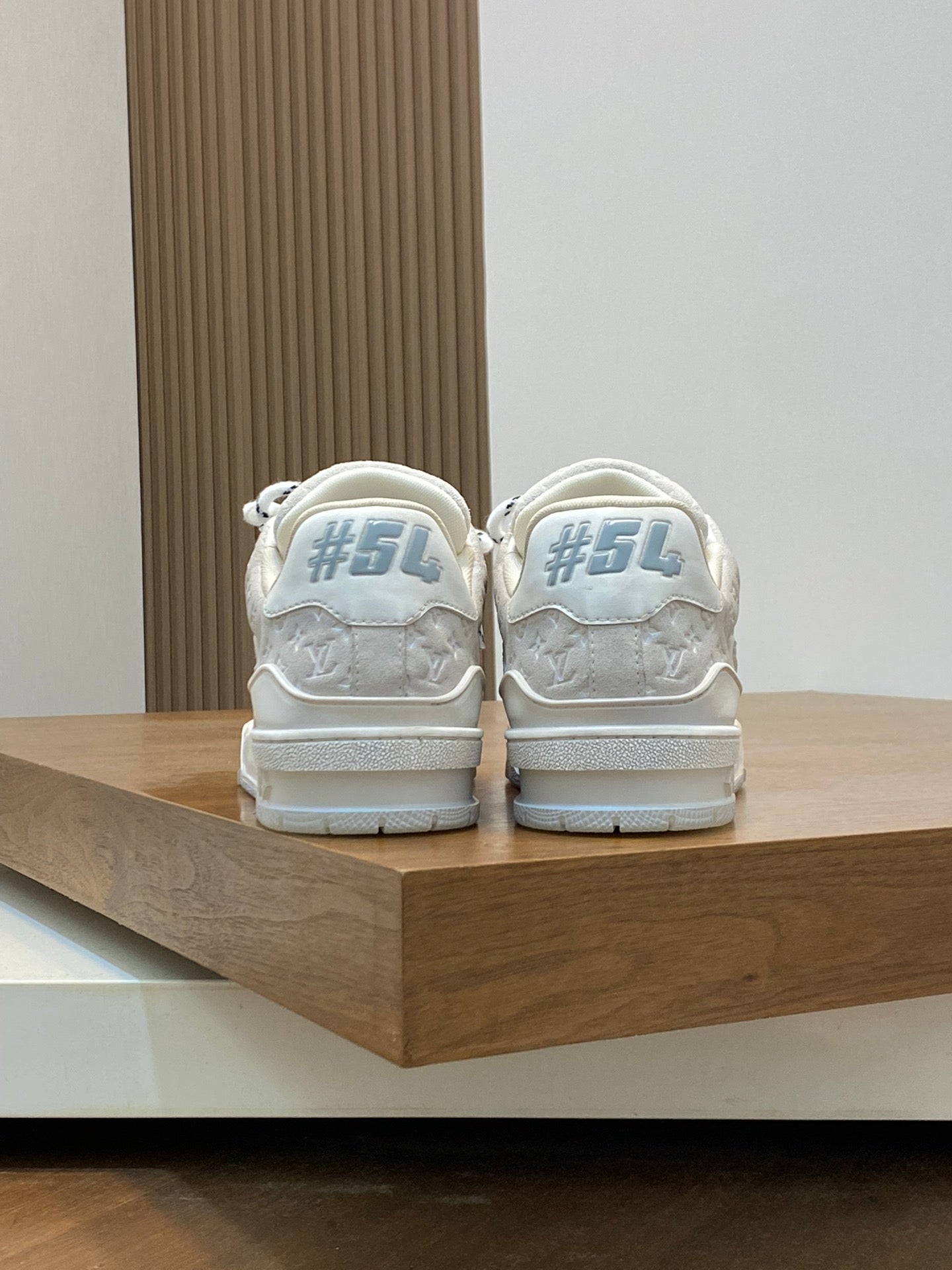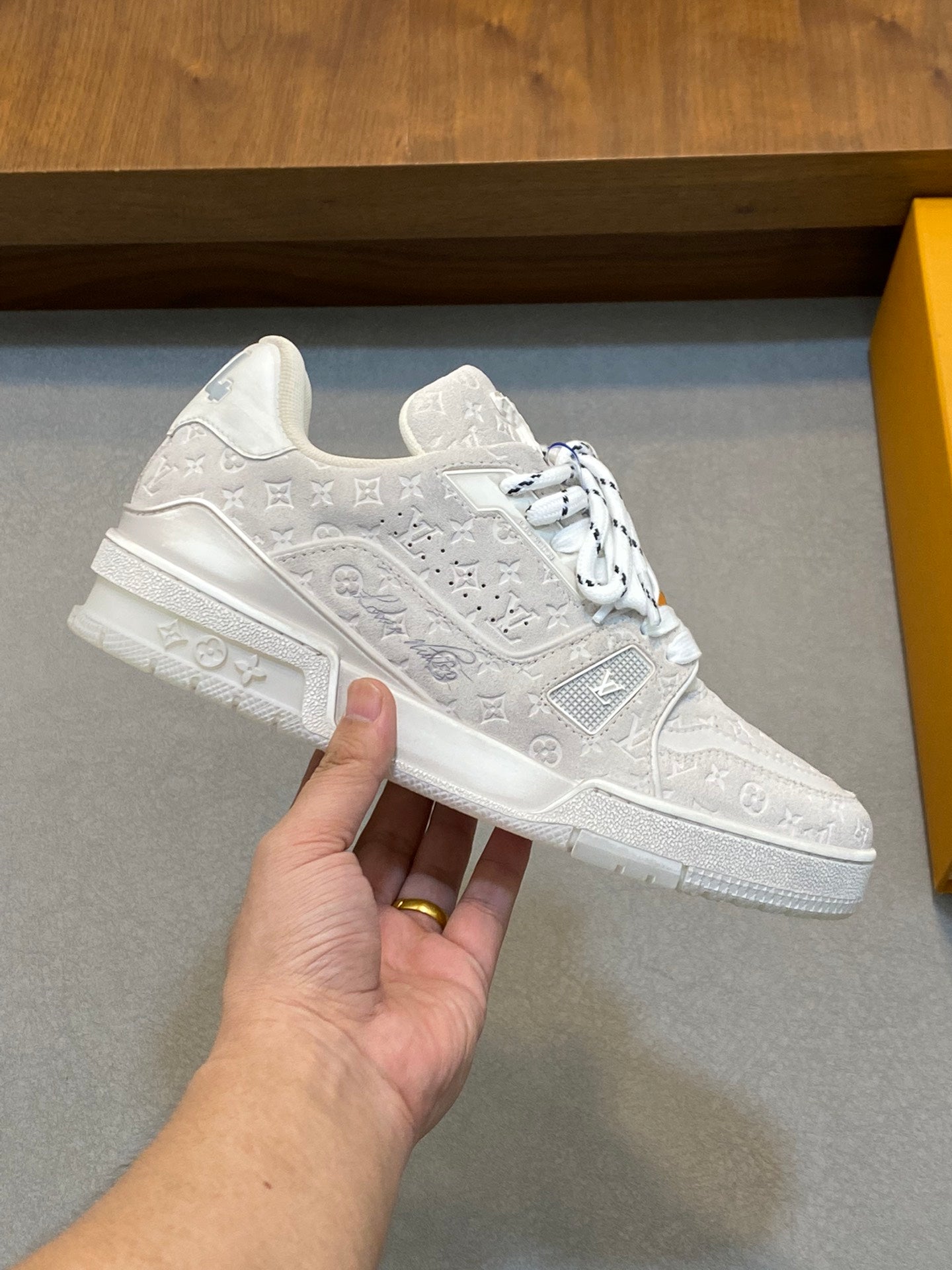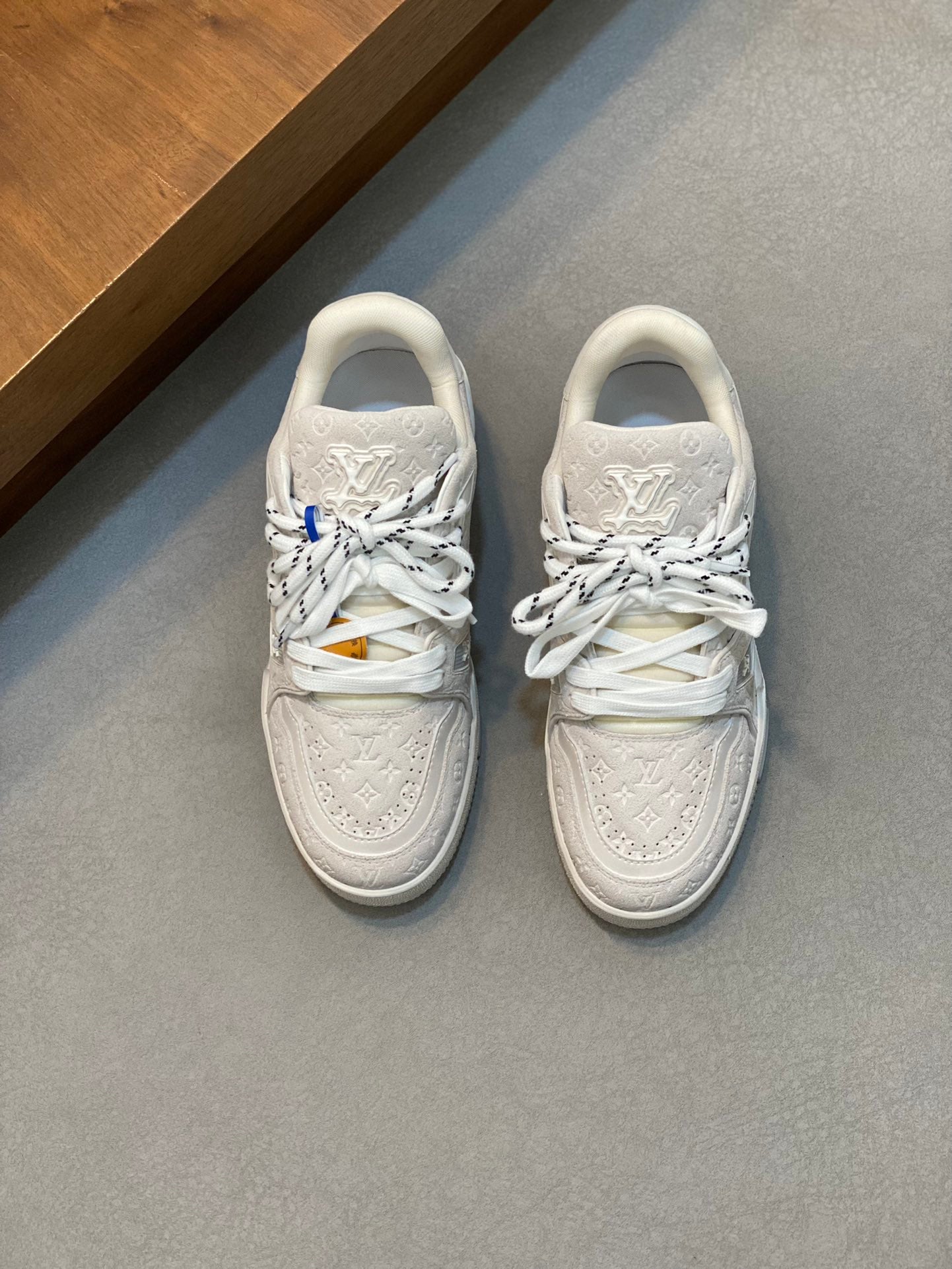 This LV Trainer Maxi is from the 2024 Early Fall collection. Made from pebbled calf leather with vibrant Damier patterns, it reinterprets Virgil Abloh’s original design with a bold, wide silhouette. Thick yet lightweight EVA rubber outsole completes the structure. Rubber LV logo accents on the tongue, sides, and heel, with wide fabric laces decorated with Louis Vuitton bead logos.