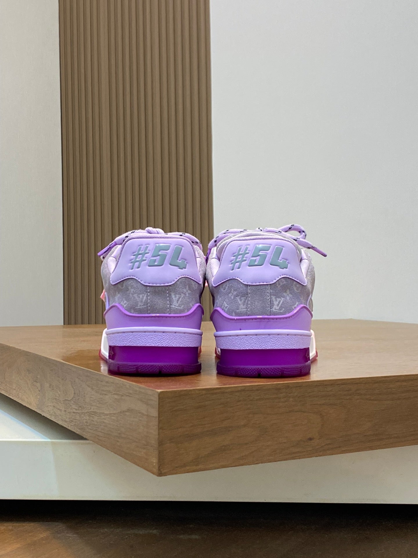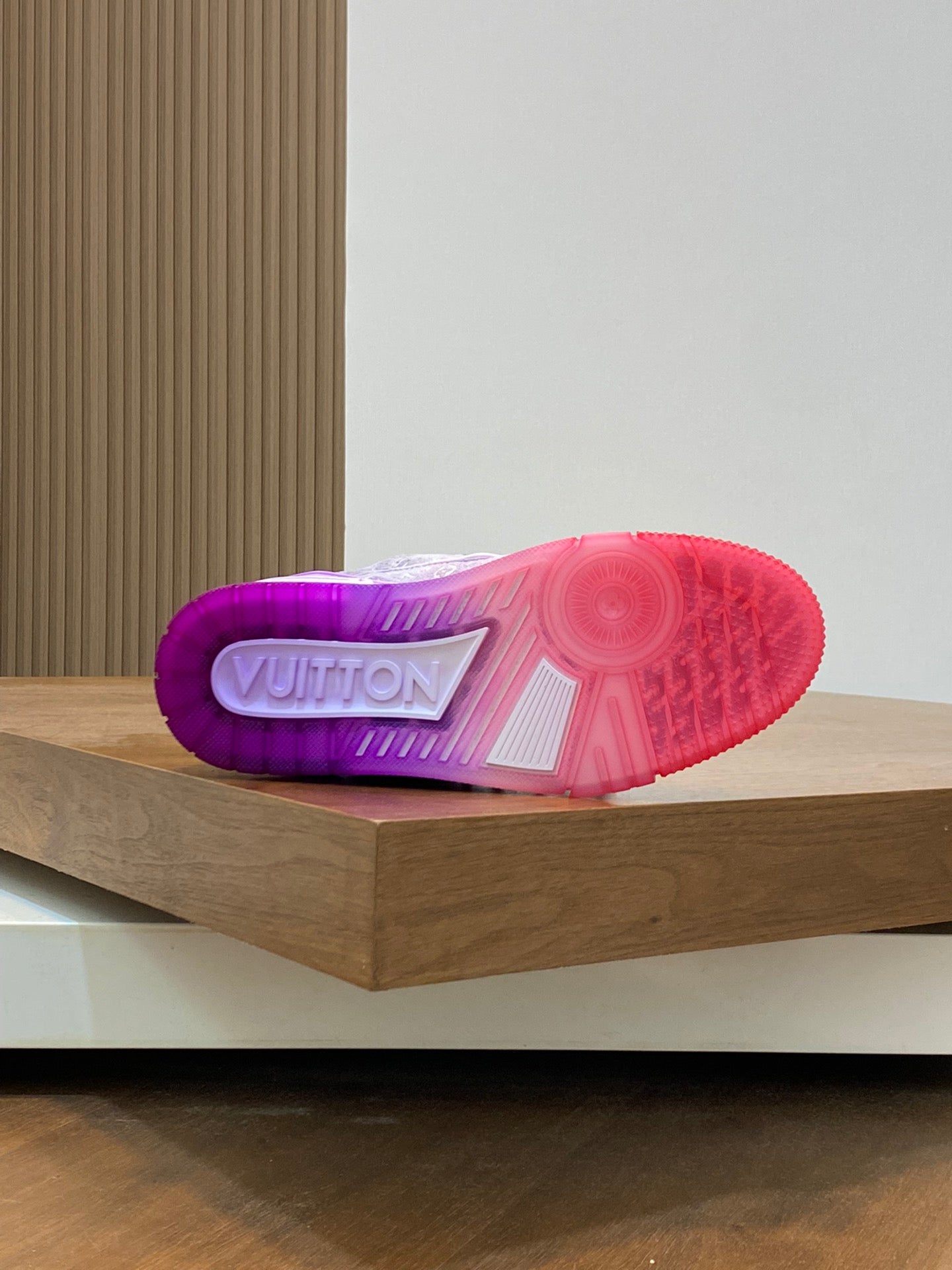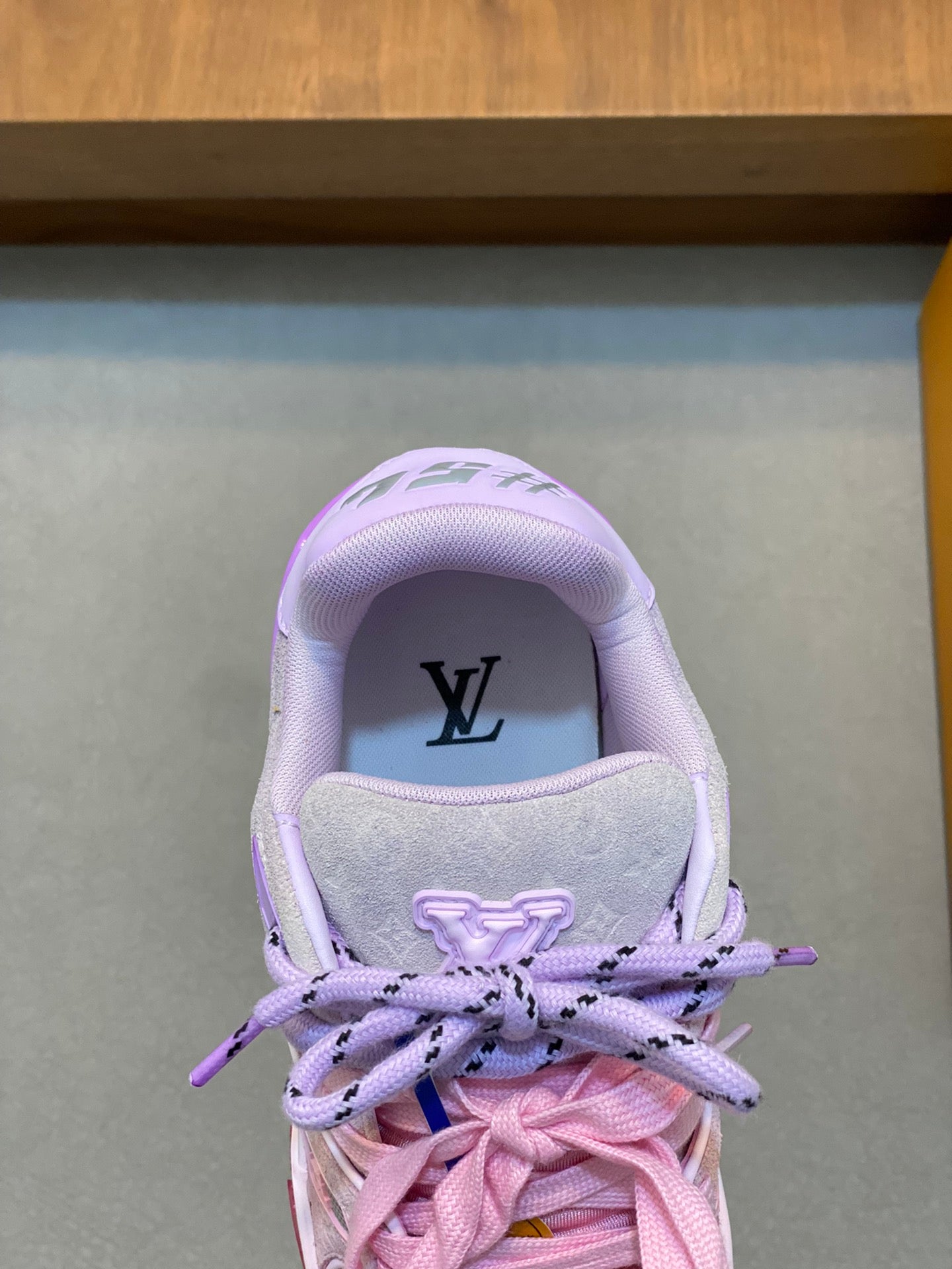 This LV Trainer Maxi is from the 2024 Early Fall collection. Made from pebbled calf leather with vibrant Damier patterns, it reinterprets Virgil Abloh’s original design with a bold, wide silhouette. Thick yet lightweight EVA rubber outsole completes the structure. Rubber LV logo accents on the tongue, sides, and heel, with wide fabric laces decorated with Louis Vuitton bead logos.