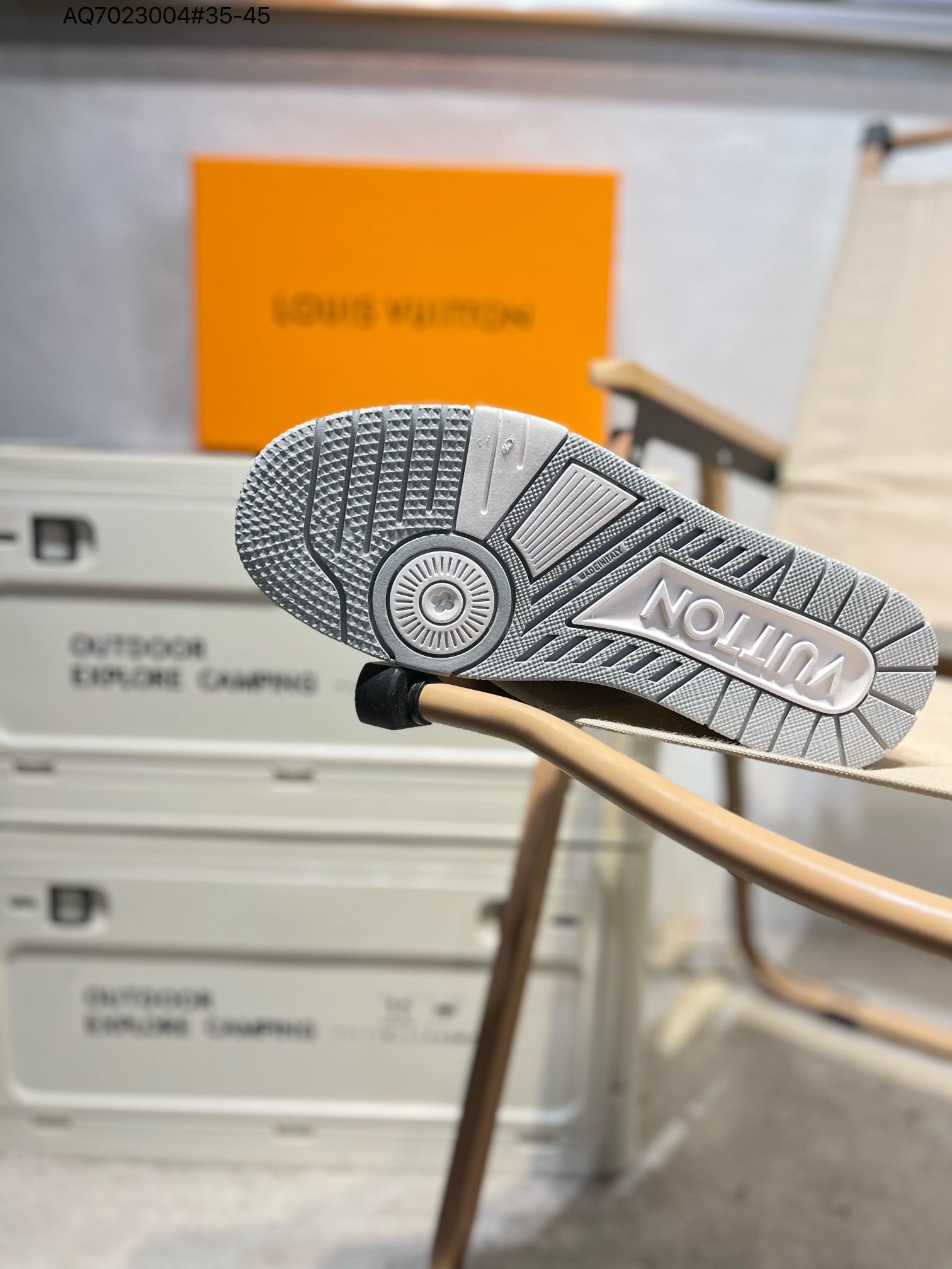 New LV Trainer sneakers with a basketball-inspired style, designed by Artistic Director Virgil Abloh. Features cushioned insoles with breathable British mesh.