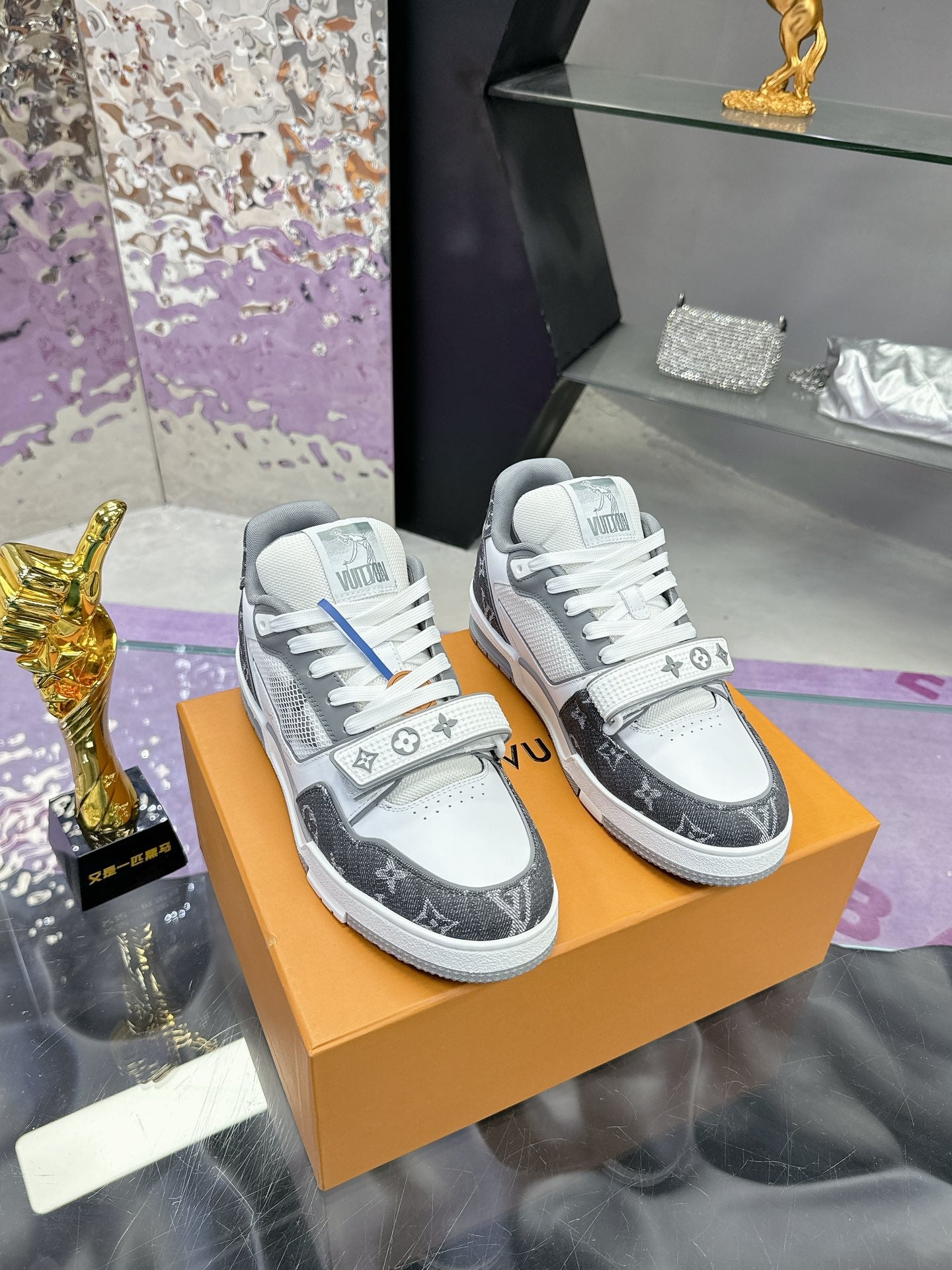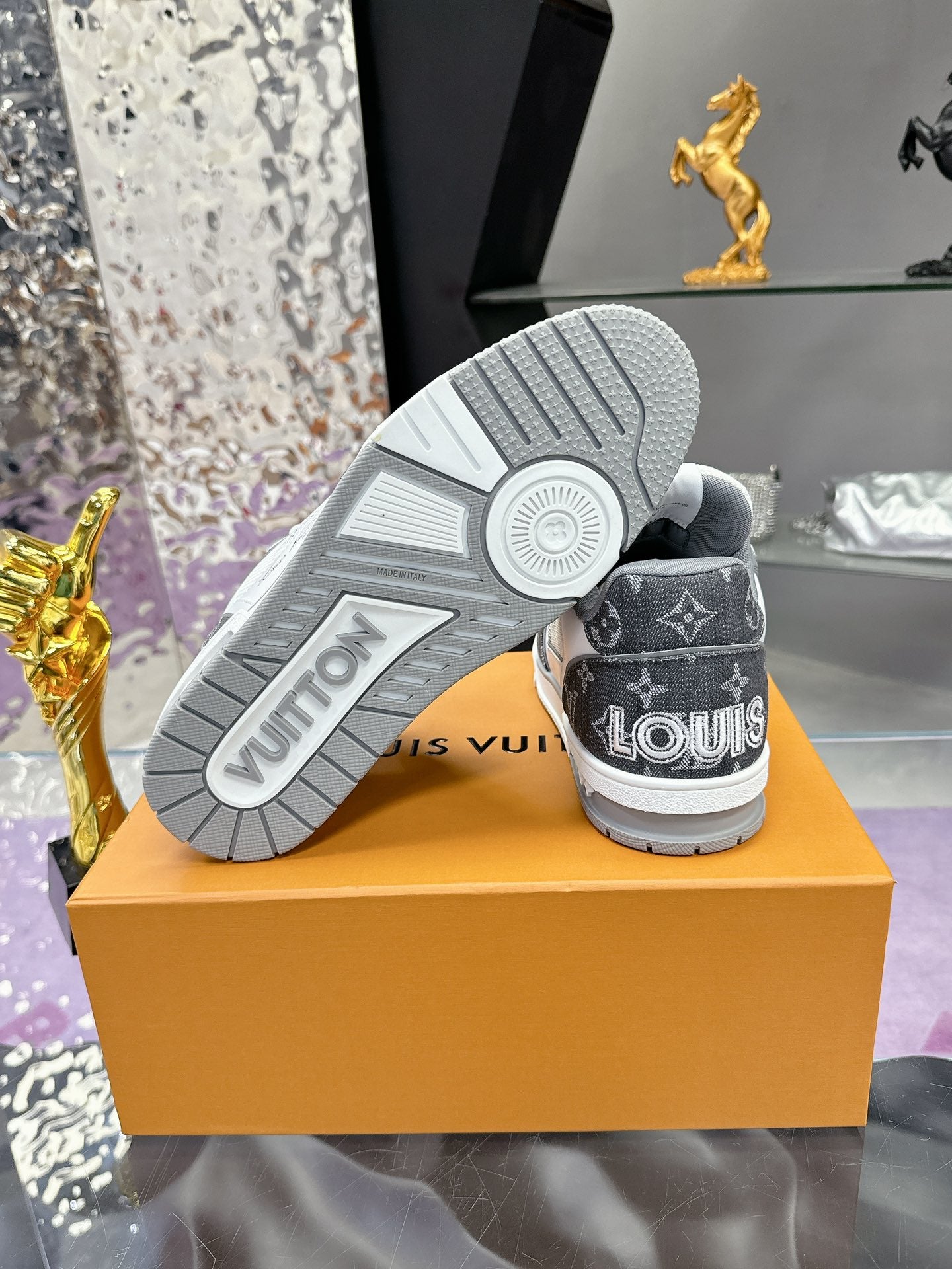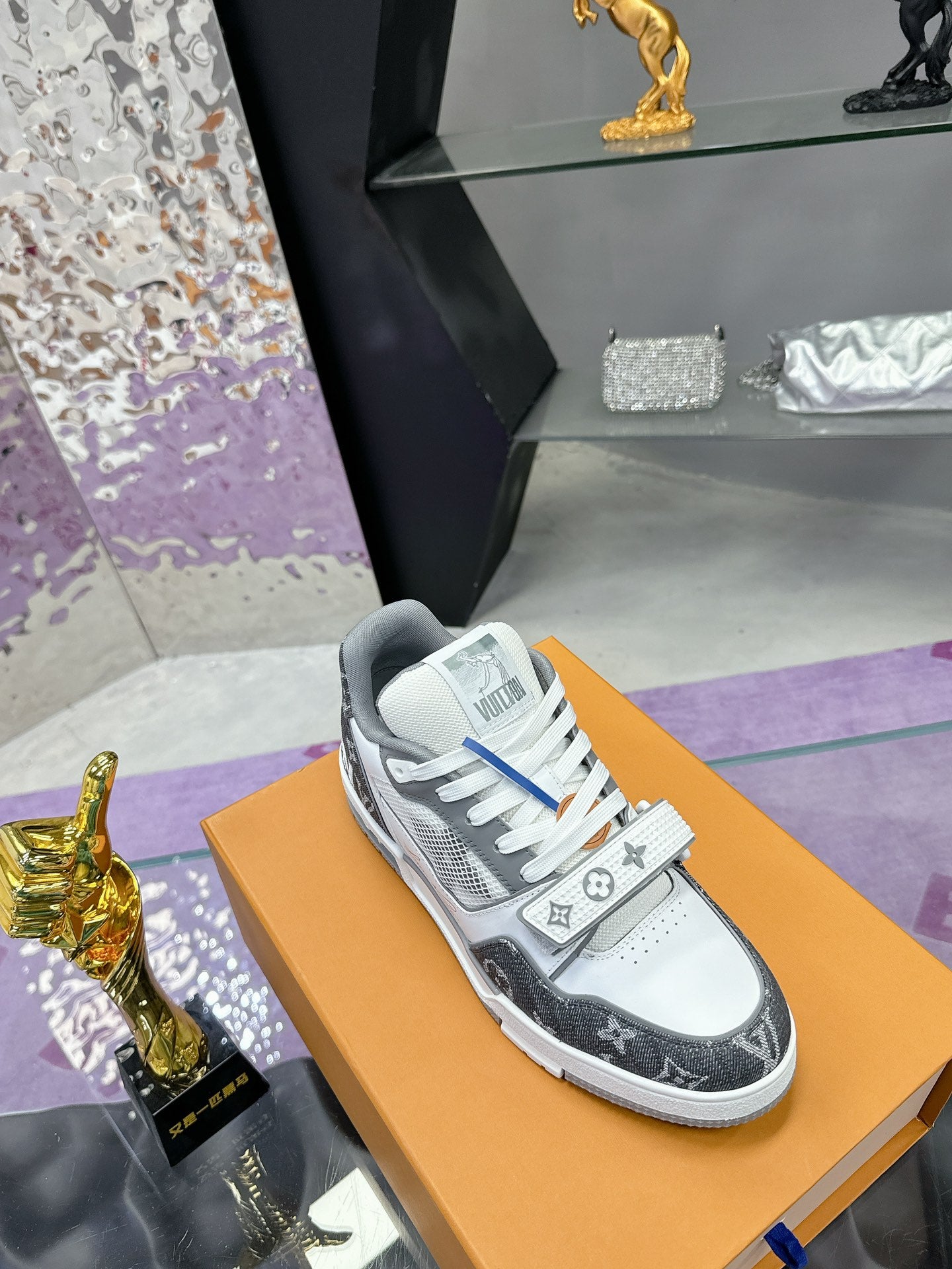 LV Sneaker Series with Velcro # Upgraded Version # Features proper washed finish on jacquard denim fabric (❌ distinguish from mass-market versions!). Upper made from imported plain-weave silk calf leather. Insole embedded with ultra-soft PU latex material. Heel reinforced with bend-resistant plastic support. Fully original-style TPU glossy composite outsole ❗