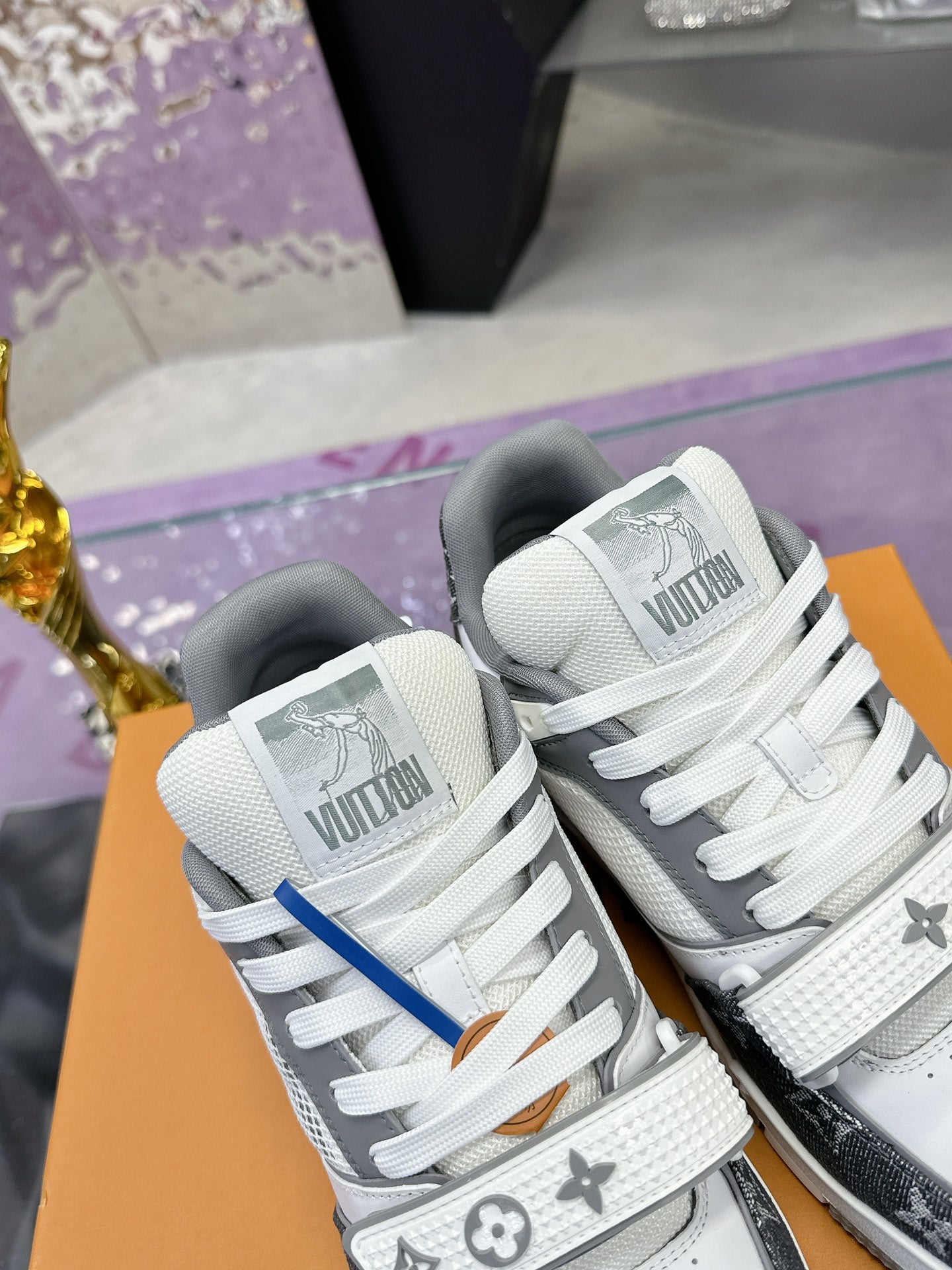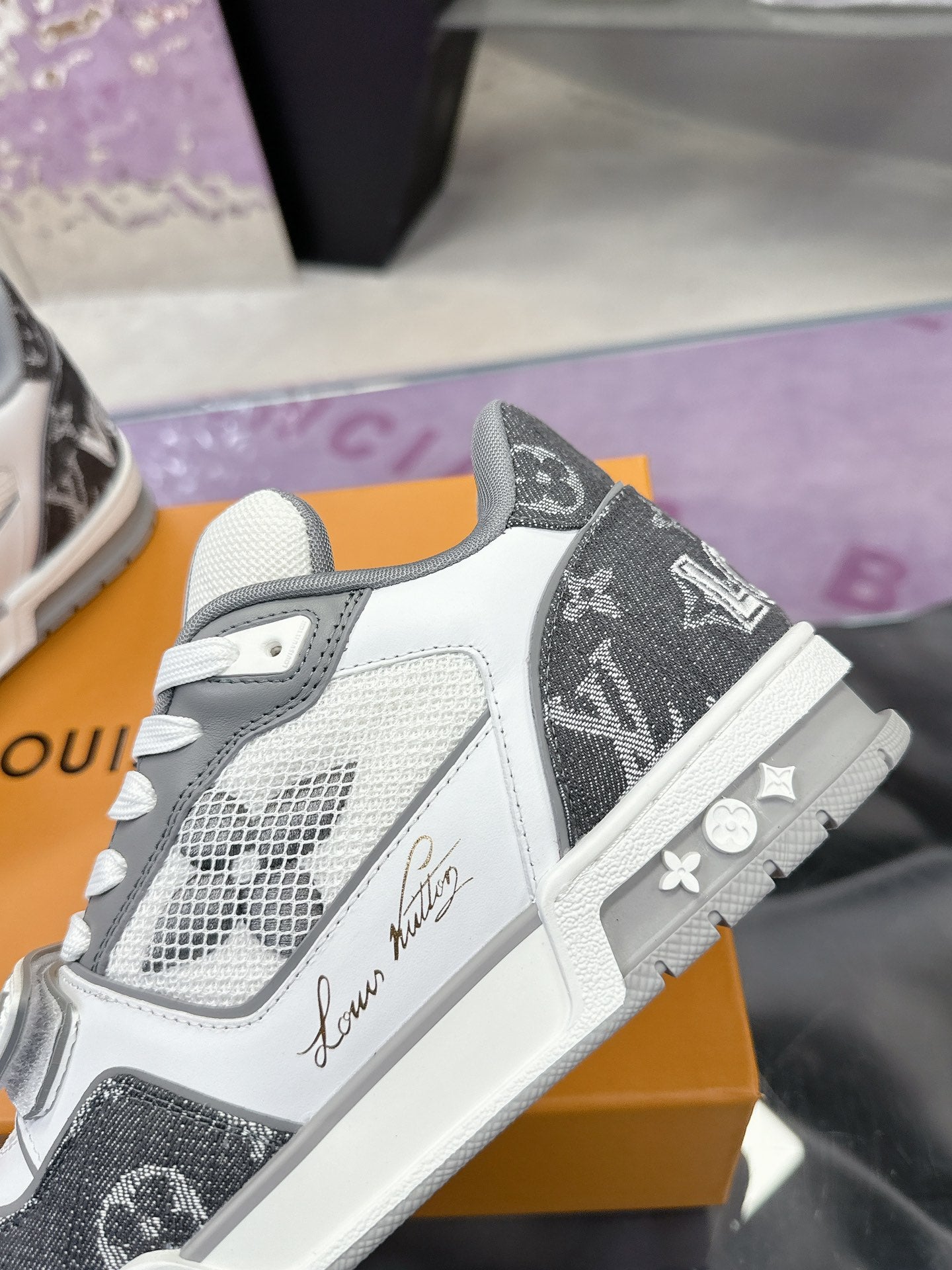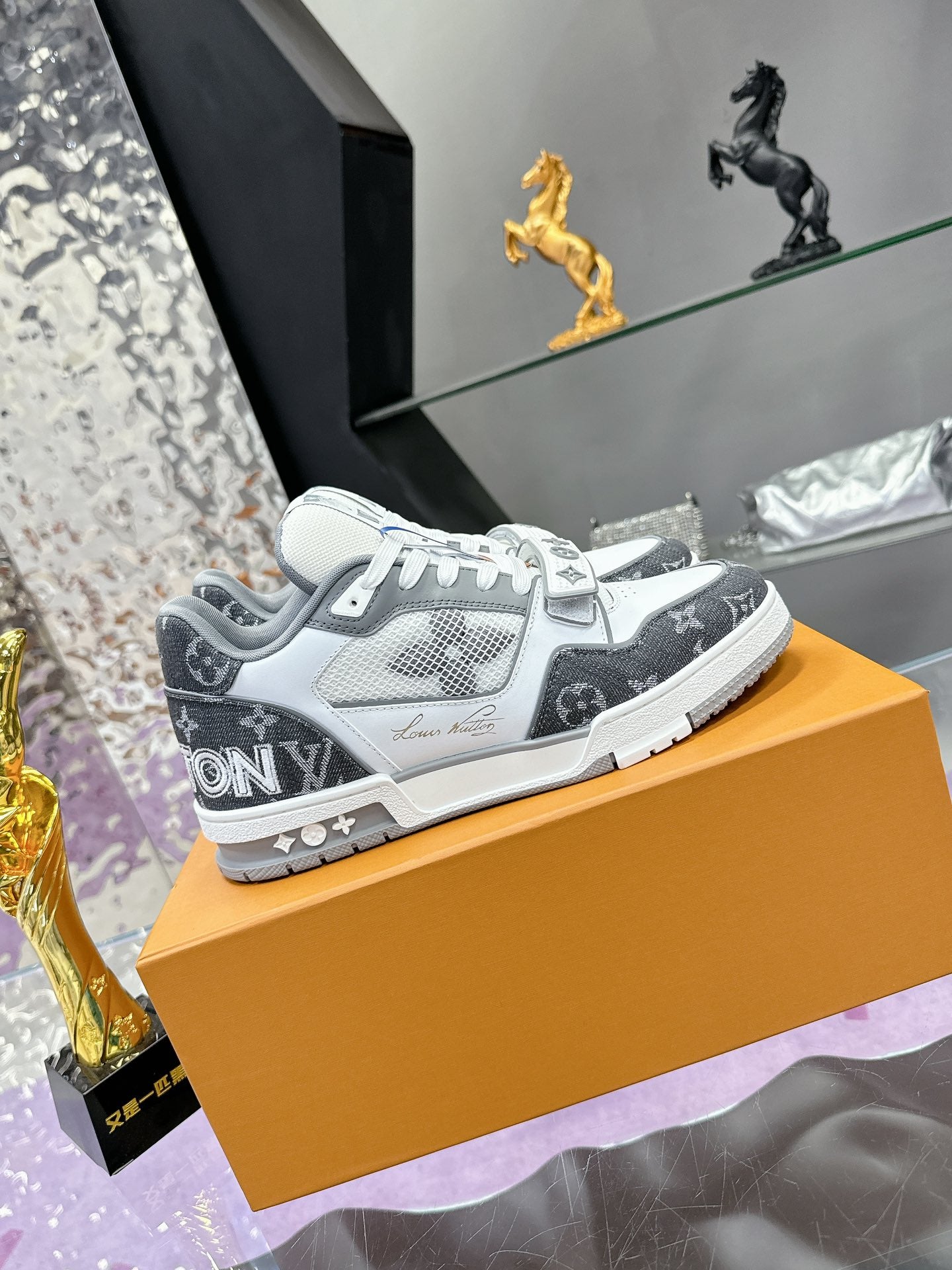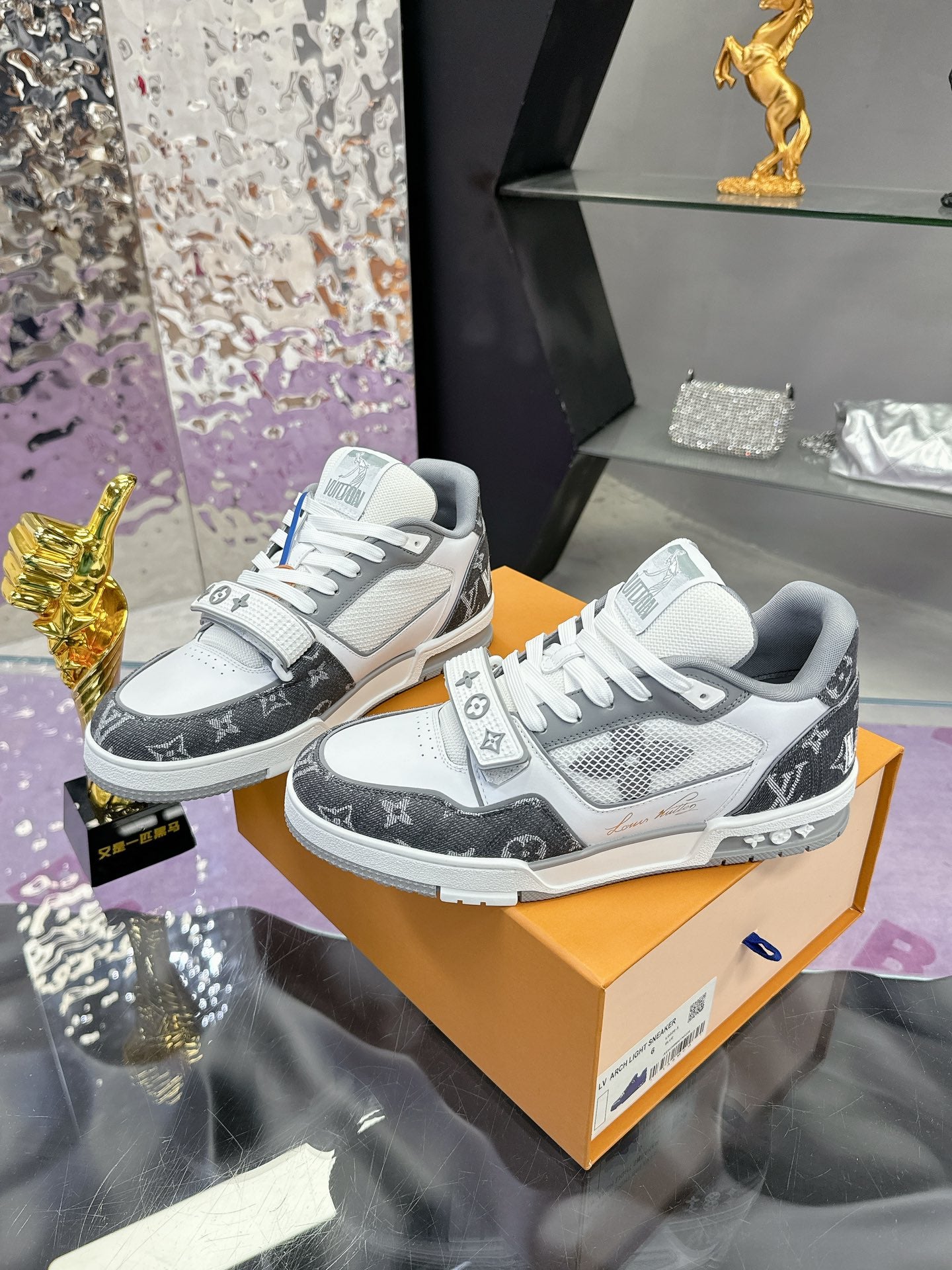 LV Sneaker Series with Velcro # Upgraded Version # Features proper washed finish on jacquard denim fabric (❌ distinguish from mass-market versions!). Upper made from imported plain-weave silk calf leather. Insole embedded with ultra-soft PU latex material. Heel reinforced with bend-resistant plastic support. Fully original-style TPU glossy composite outsole ❗