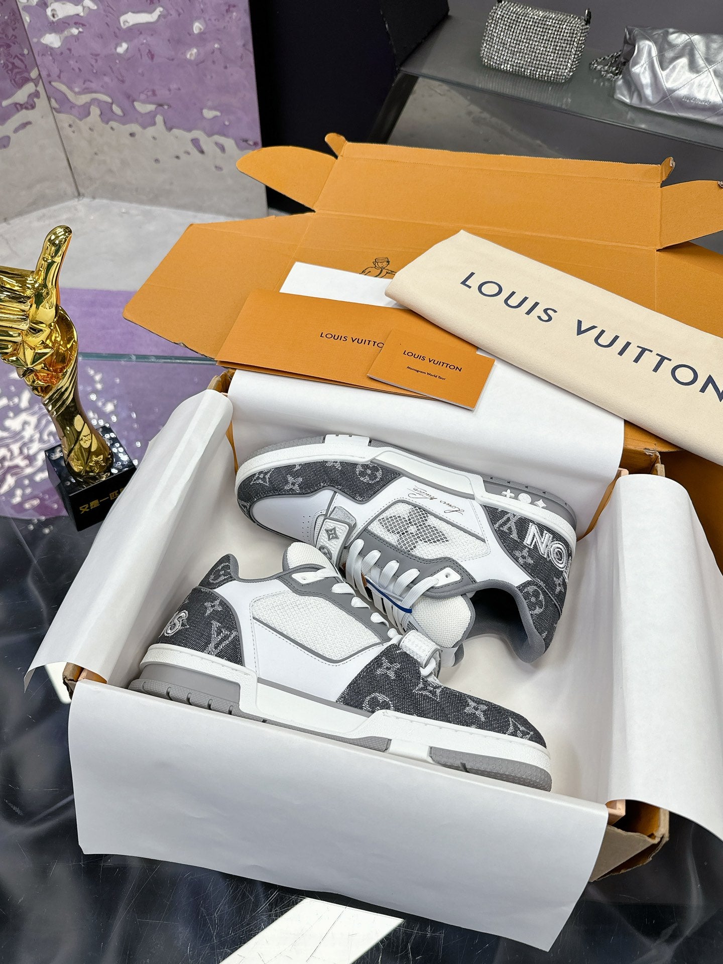 LV basketball sneakers personally designed by Virgil Abloh! Drawing inspiration from retro basketball shoes, he created the LV Trainer sneakers for Louis Vuitton, establishing a new classic in the footwear series. Monogram denim construction paired with Monogram flower Velcro laces; intricate upper takes skilled artisans 7 hours to complete.