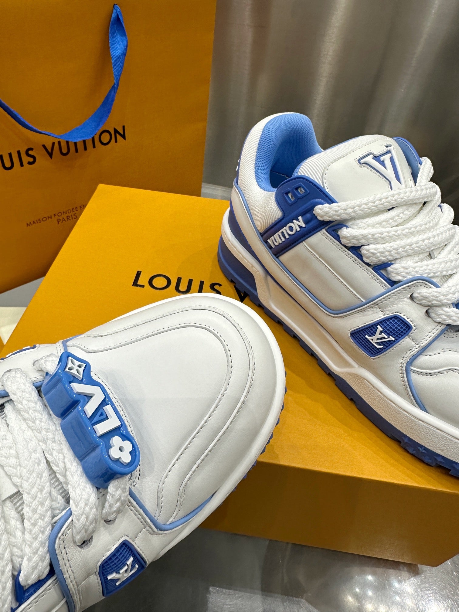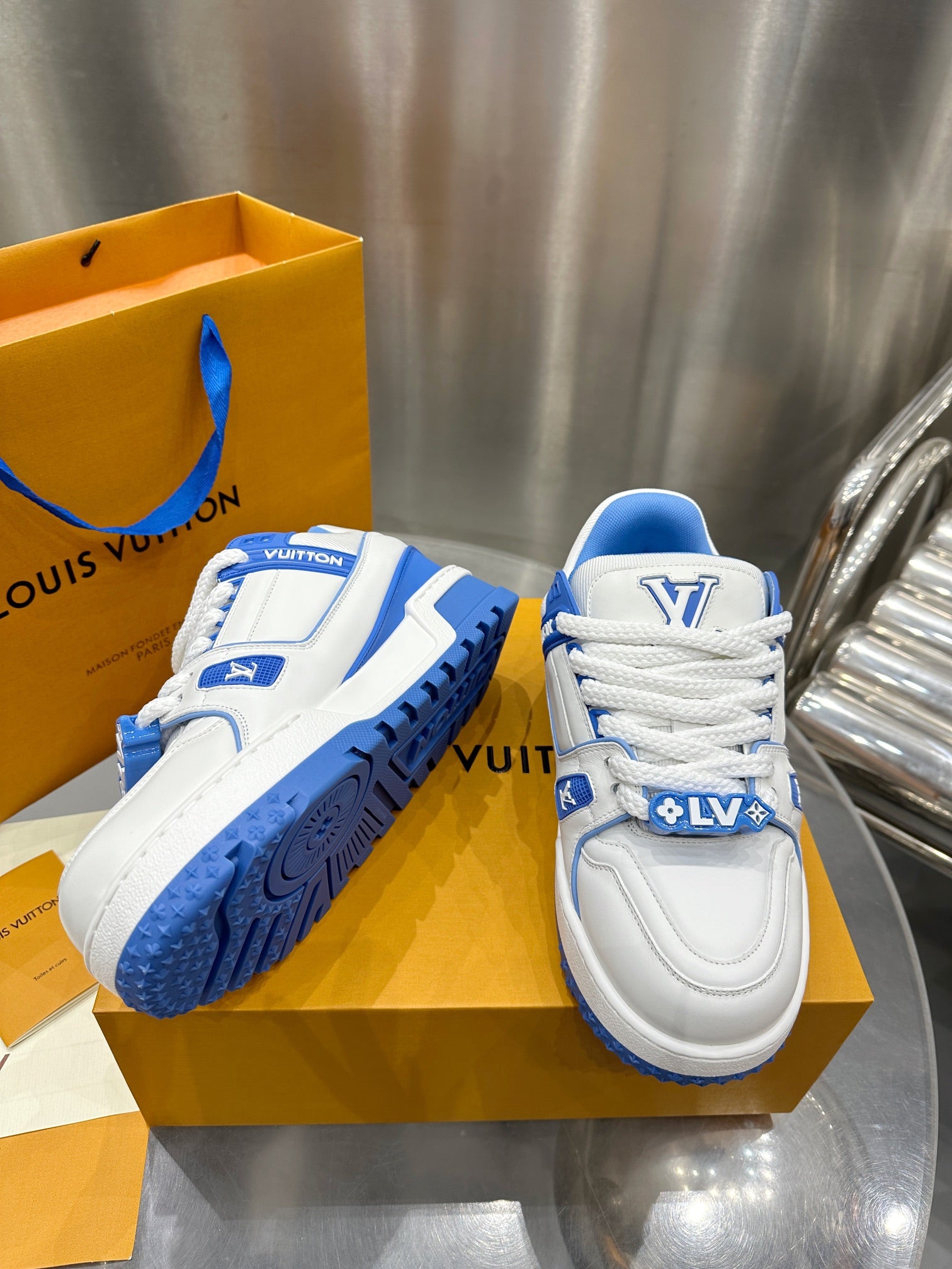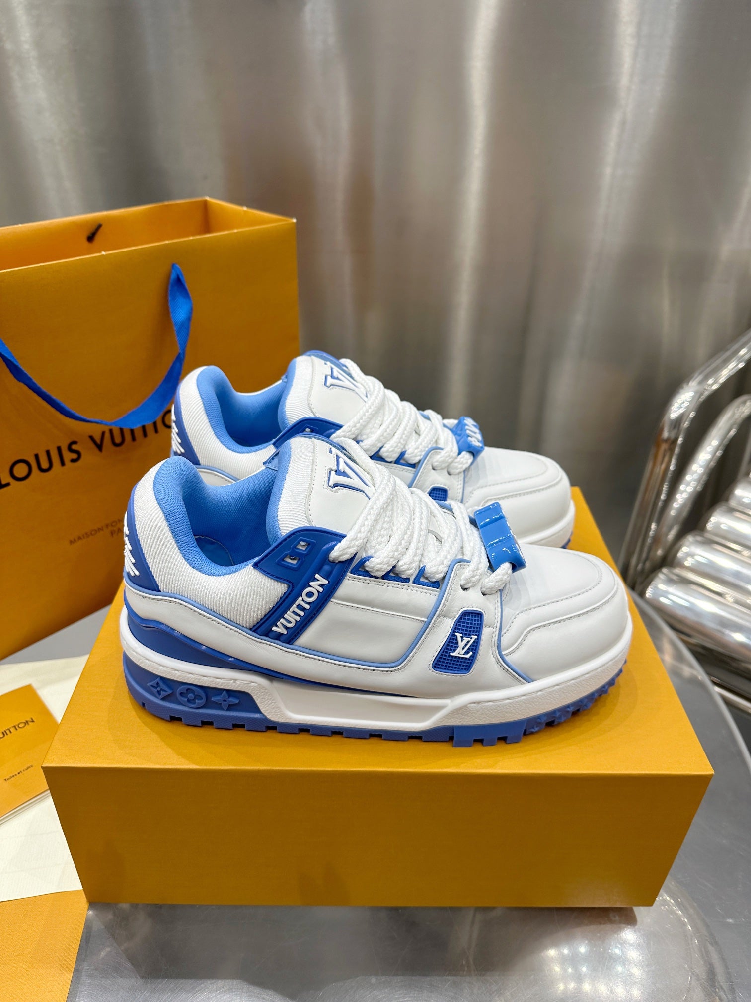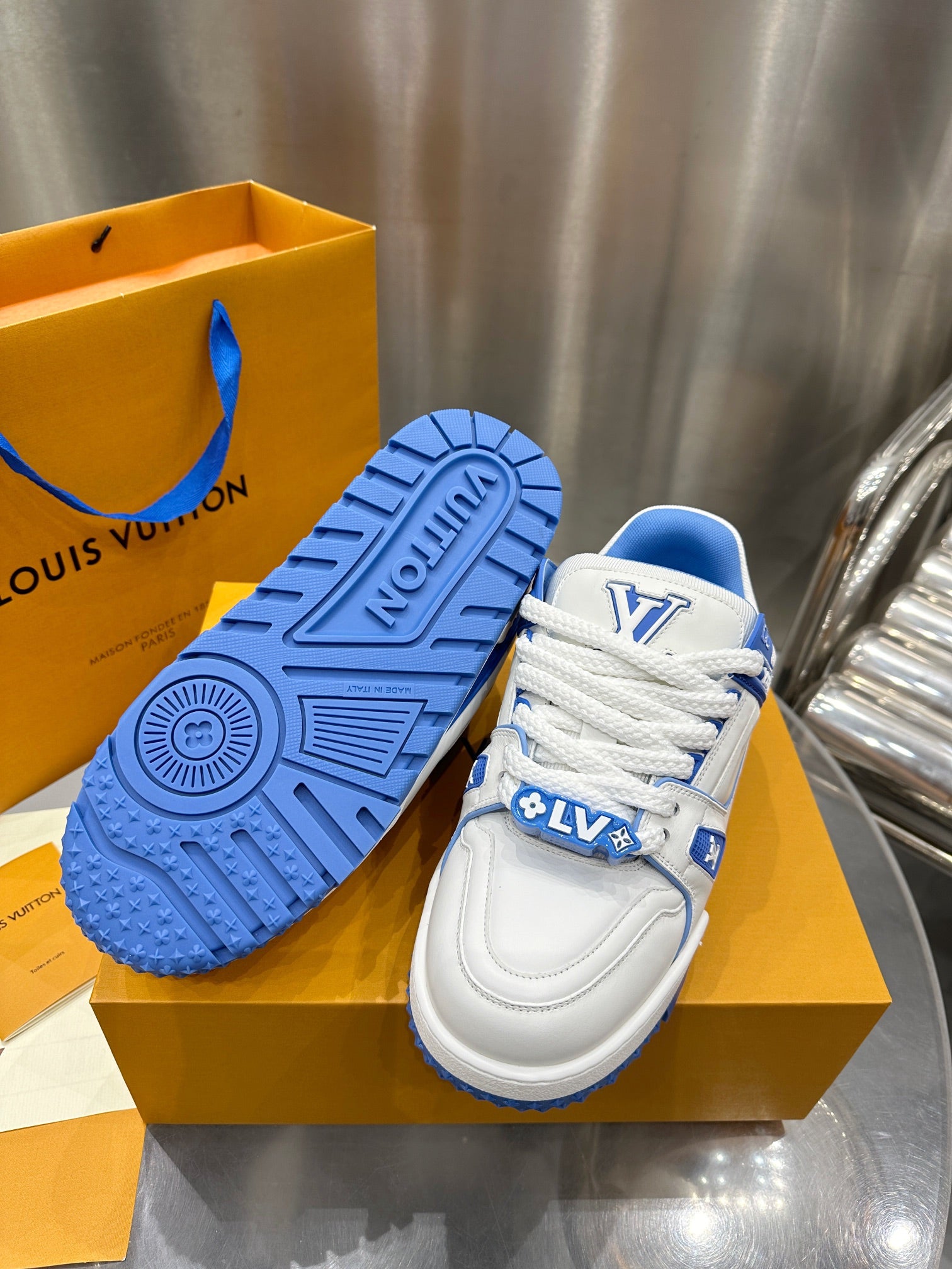 Louis Vuitton 2023 Men’s Spring/Summer Runway release. This “puffed-up” Trainer is eye-catching! Full, colorful 3D silhouette paired with contrasting letters and logo on the laces, giving the shoe a playful, clay-like look, blending trendiness with whimsical charm.