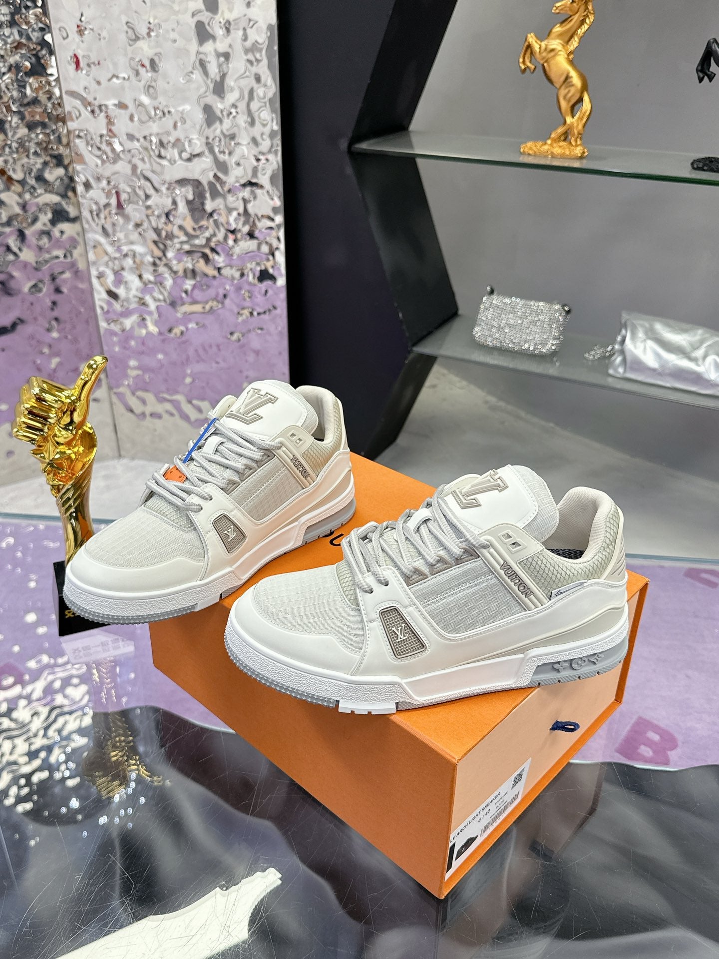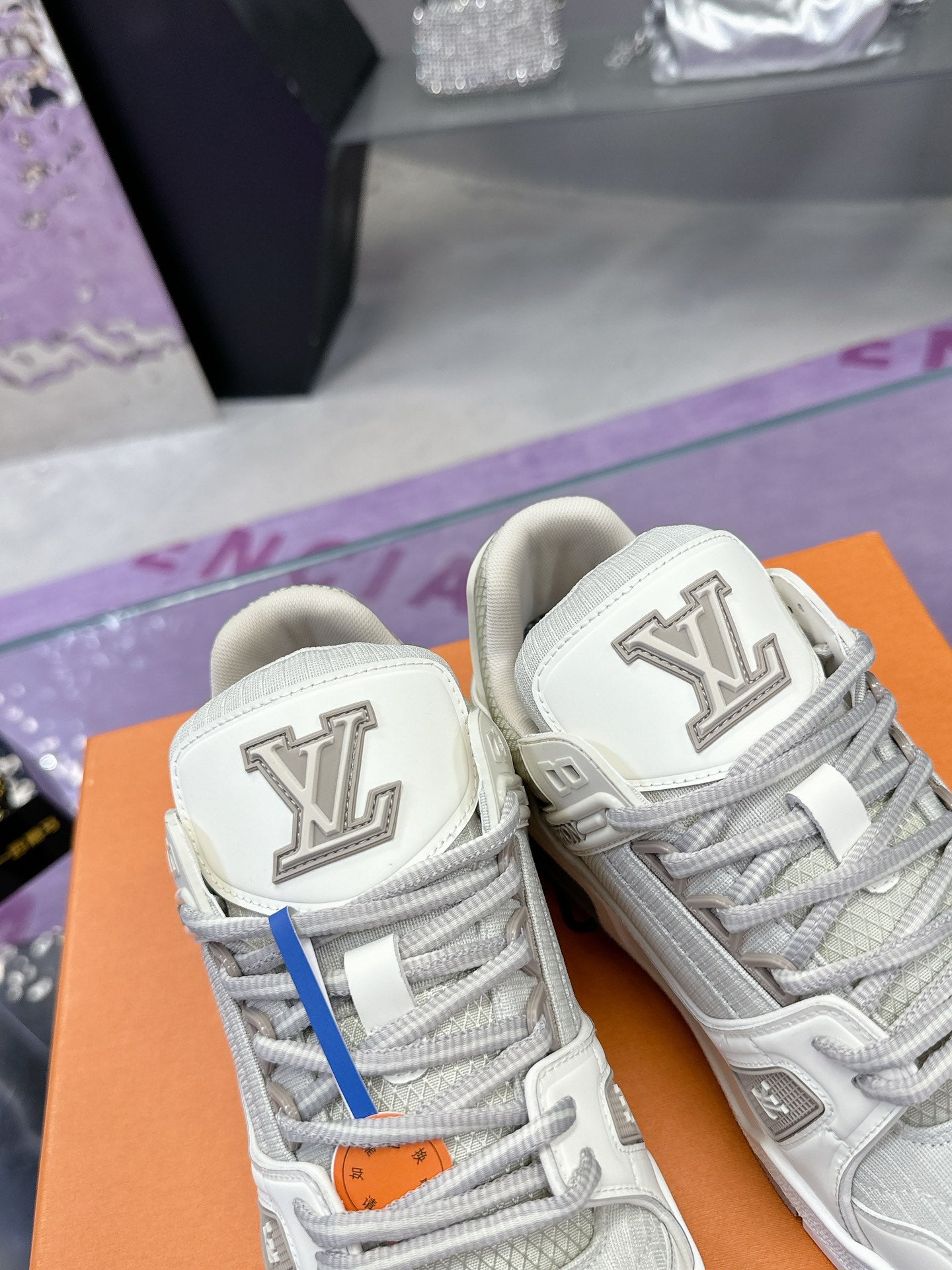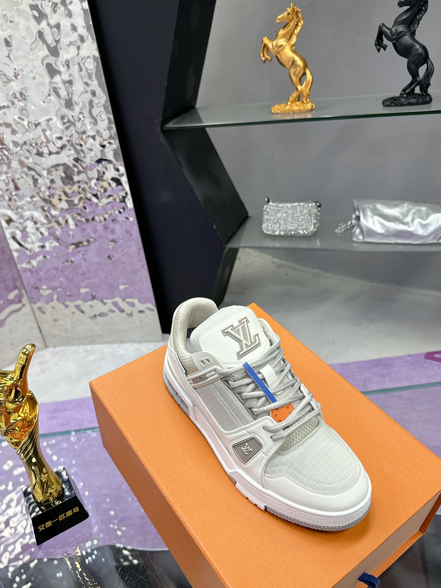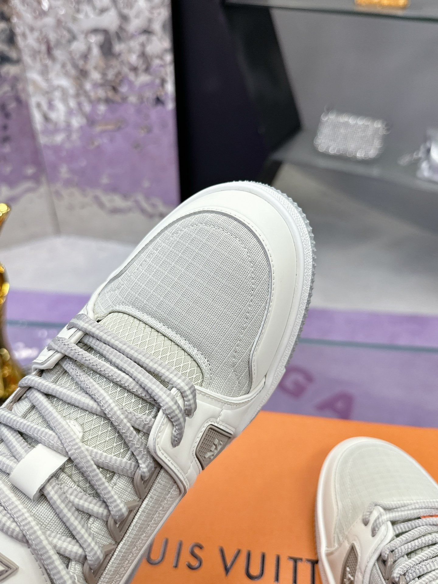 LV Trainer Maxi Sneakers blend relaxed ready-to-wear silhouettes into Virgil Abloh’s LV Trainer design, showcased at the Spring/Summer men’s runway. Leather upper paired with rugged fabric laces and colorful beads highlight classic brand elements. LV logo on tongue, Monogram floral patterns on outsole.