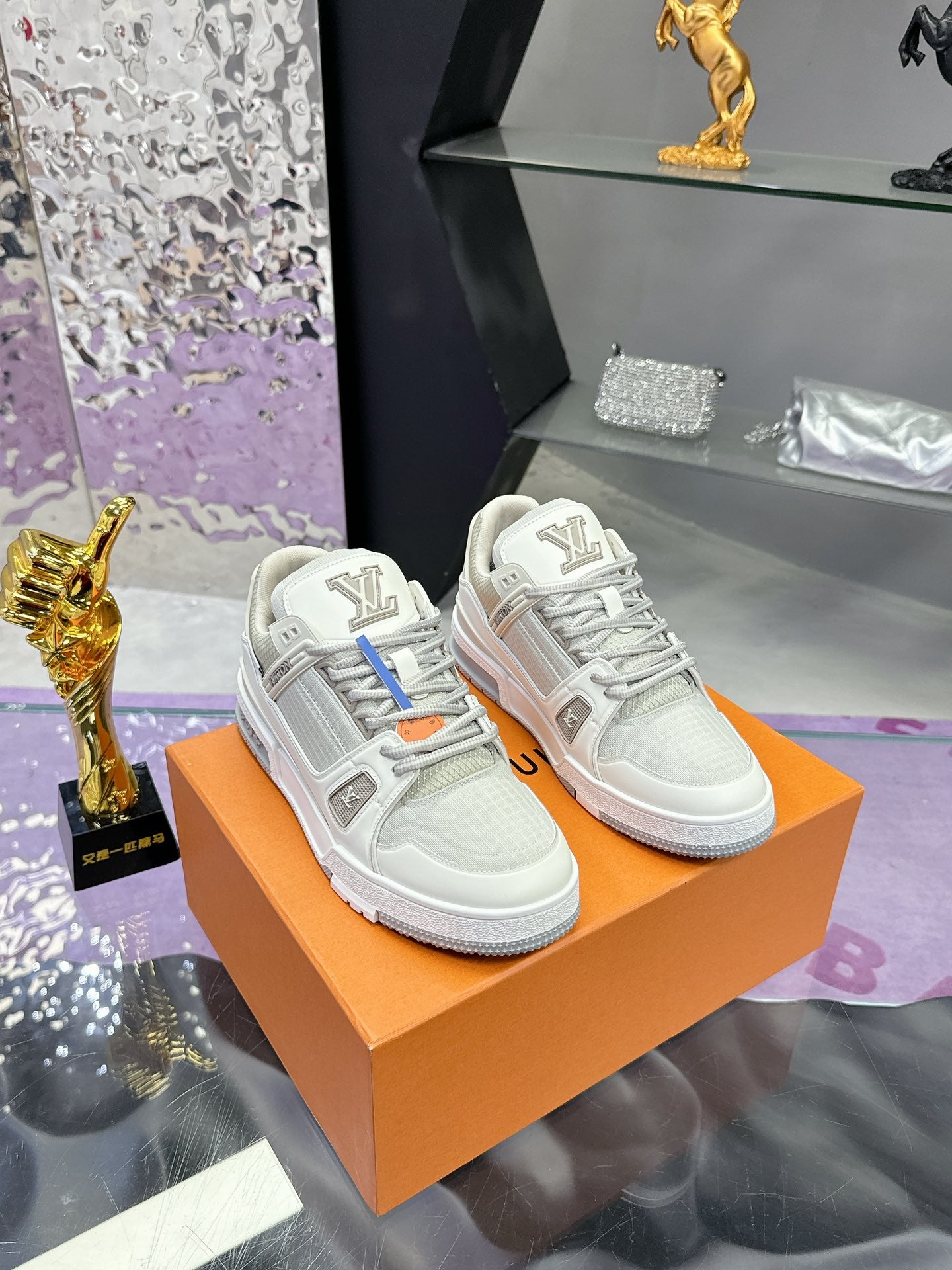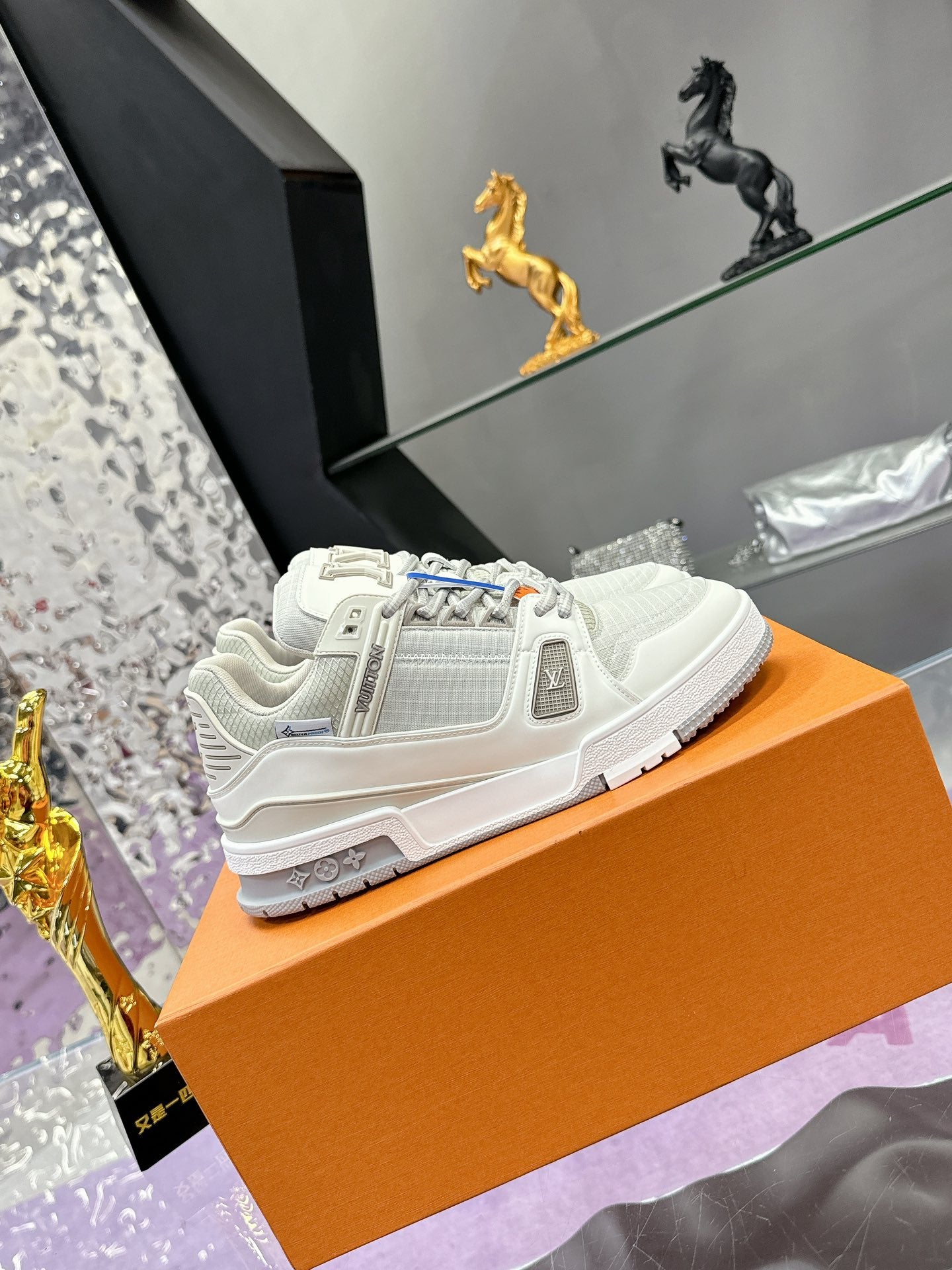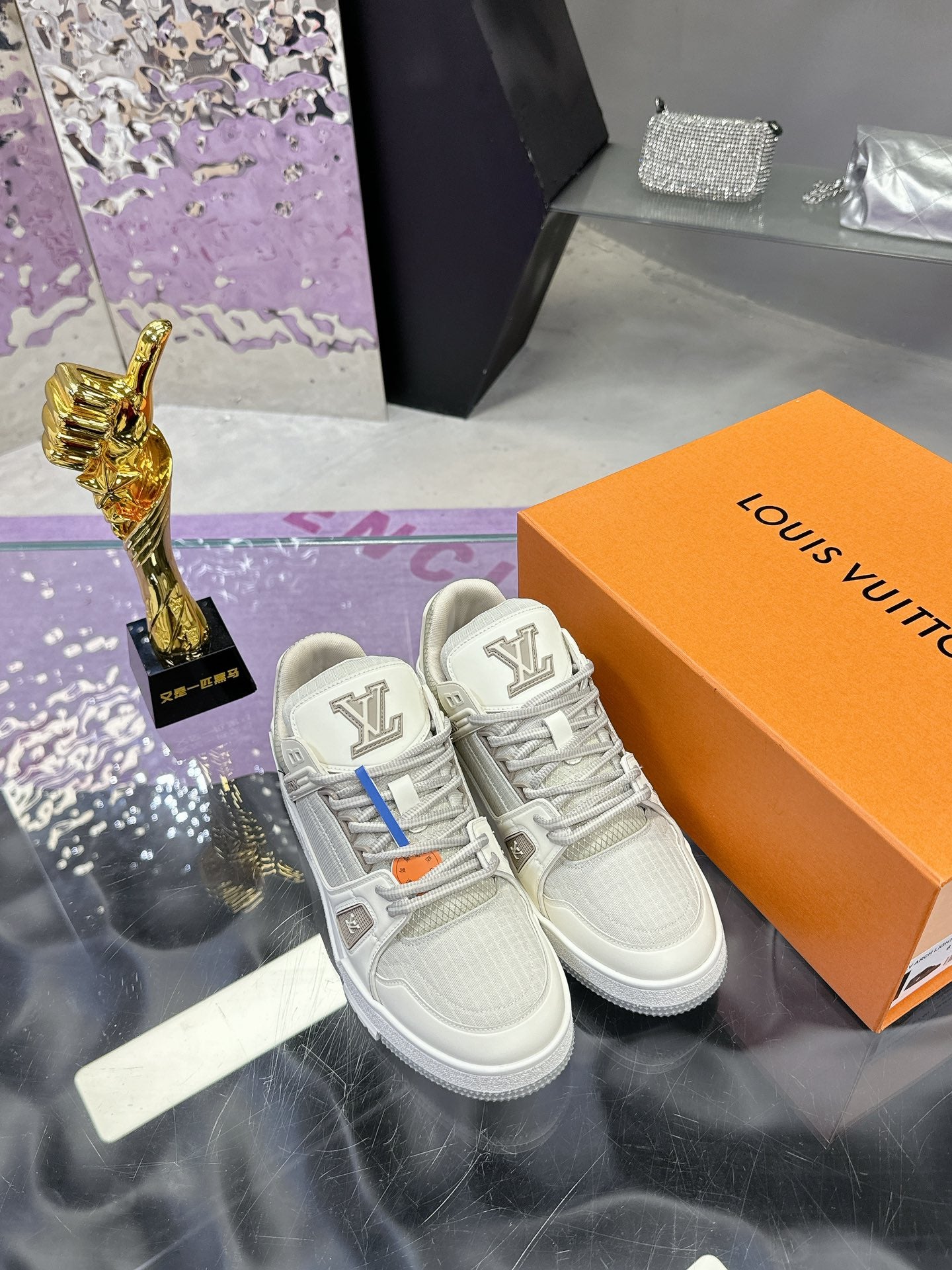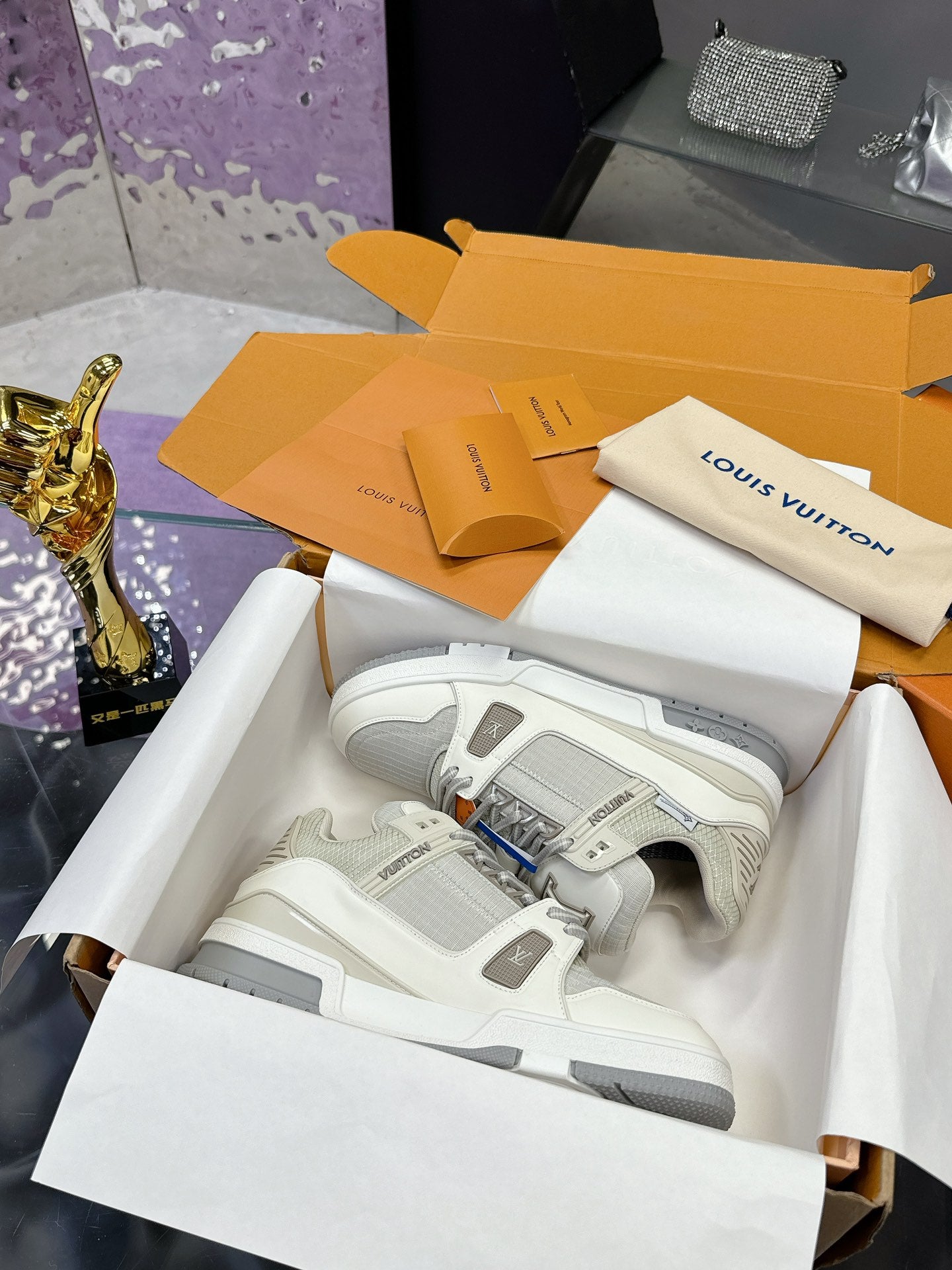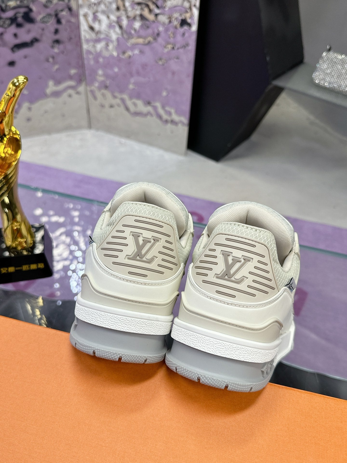 LV Trainer Maxi Sneakers blend relaxed ready-to-wear silhouettes into Virgil Abloh’s LV Trainer design, showcased at the Spring/Summer men’s runway. Leather upper paired with rugged fabric laces and colorful beads highlight classic brand elements. LV logo on tongue, Monogram floral patterns on outsole.