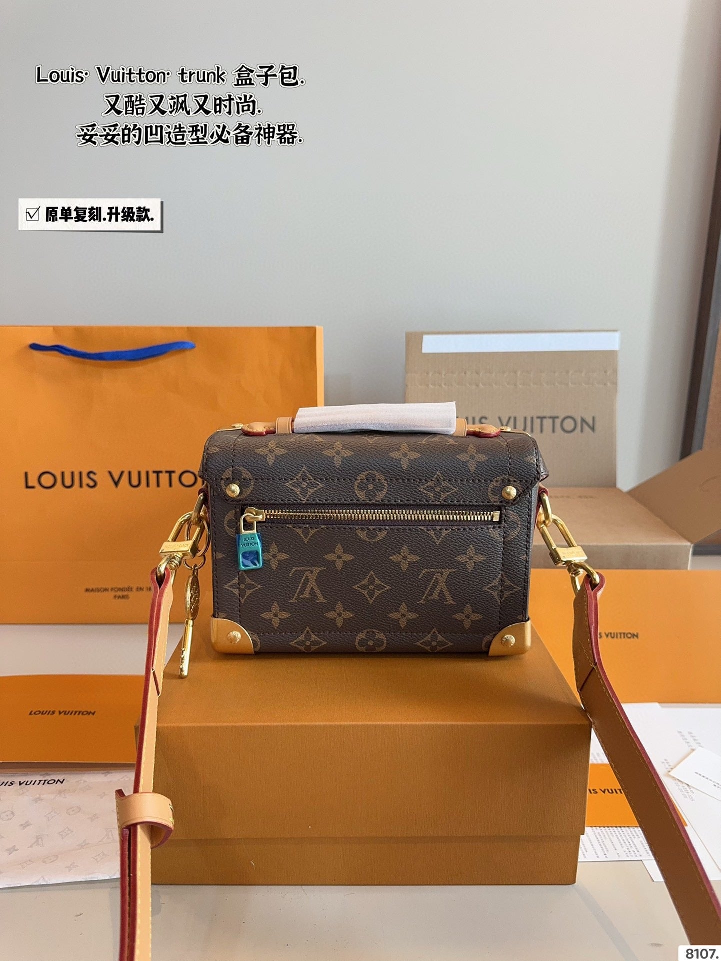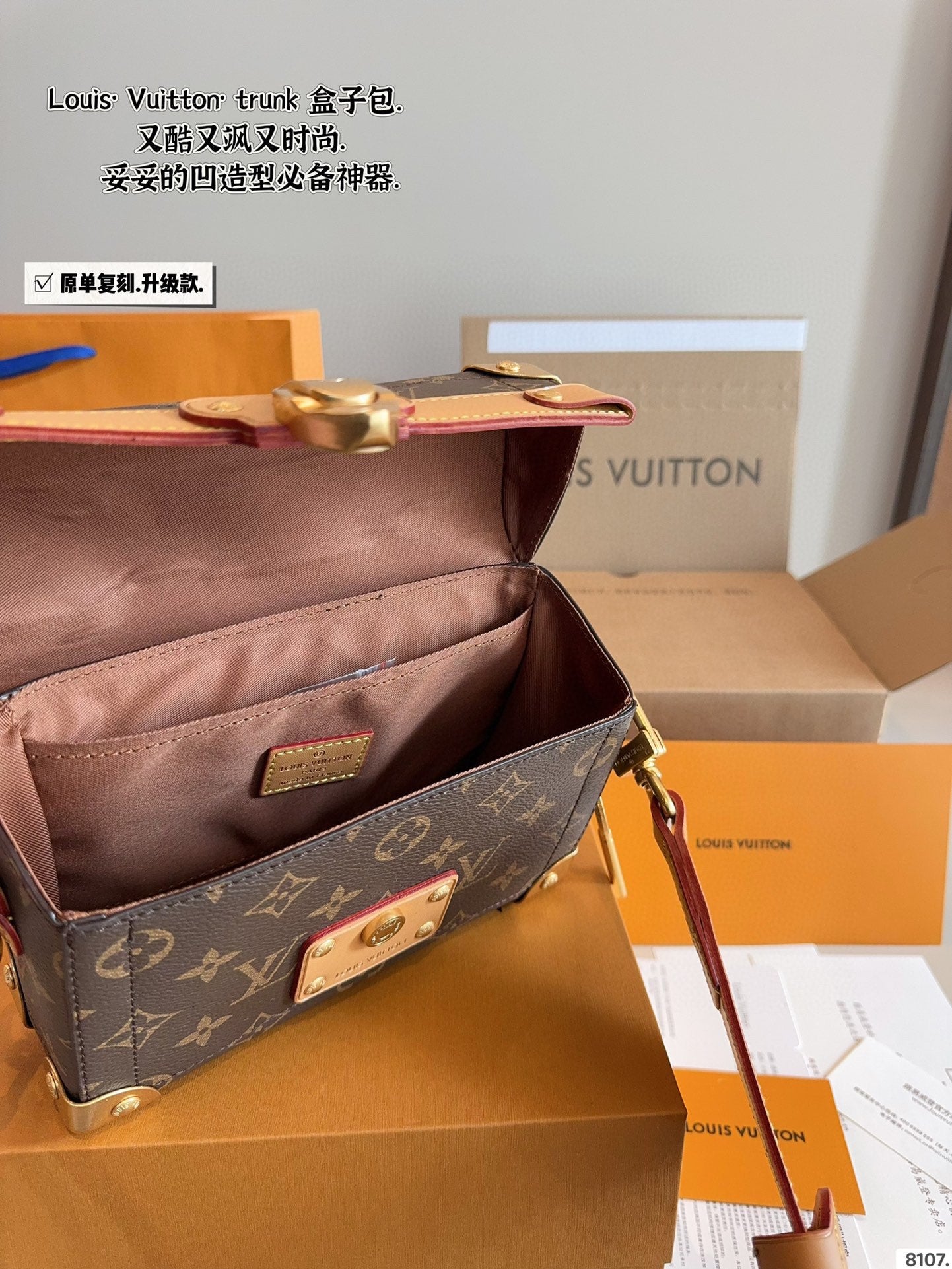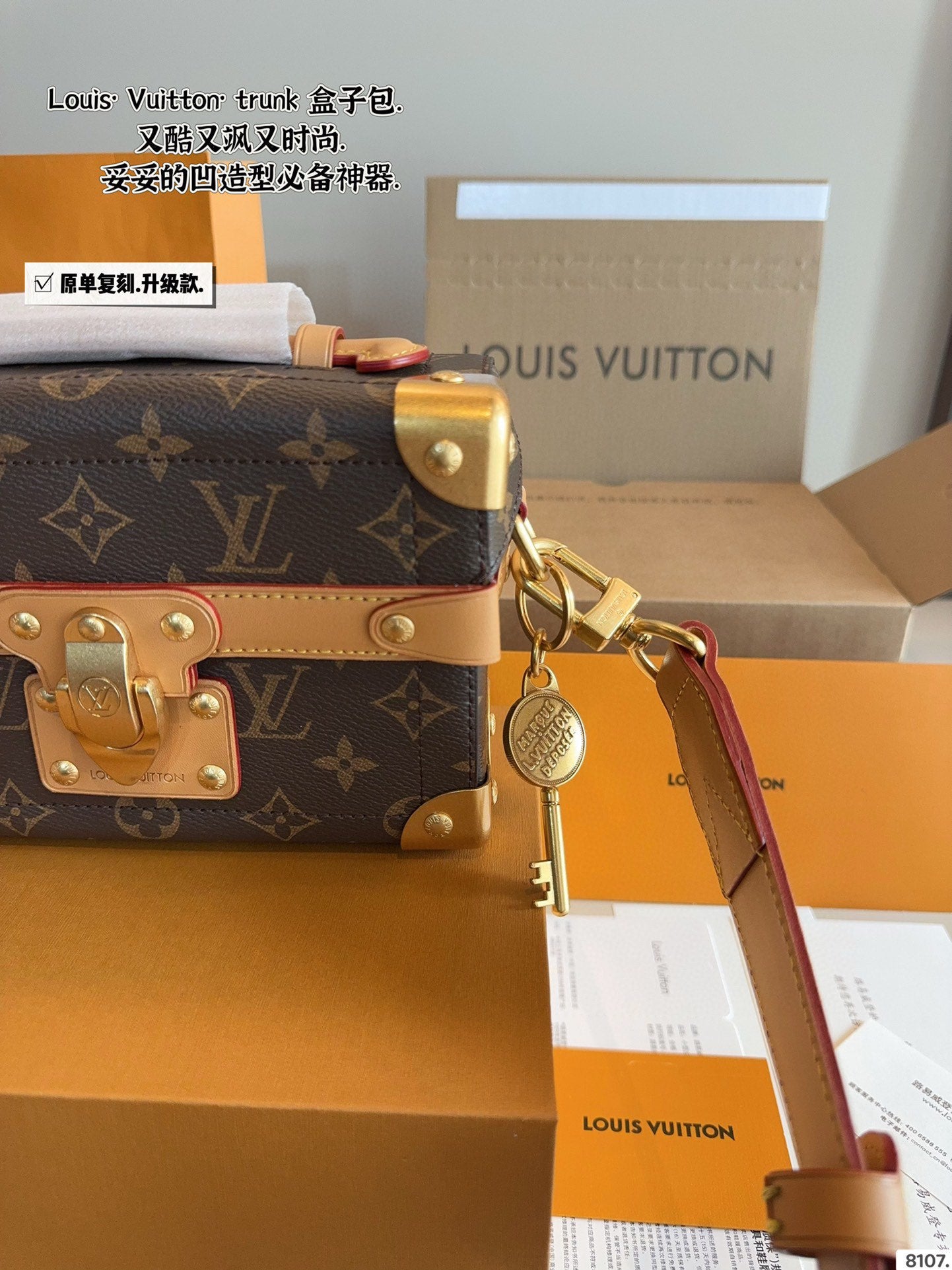 With sharp lines, reinforced metal corners, and bold hardware, it perfectly echoes the brand’s iconic luggage-making tradition. The gold chain attached to the zipper adds a modern edge, while the reverse Monogram patchwork design enhances its unique style.