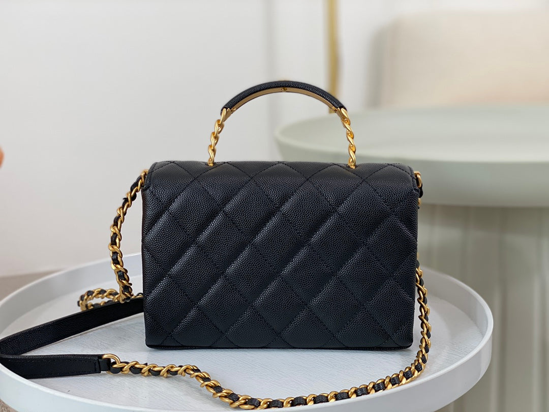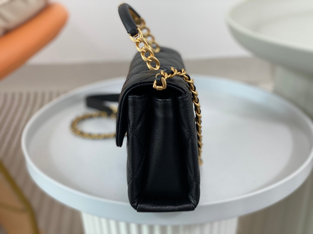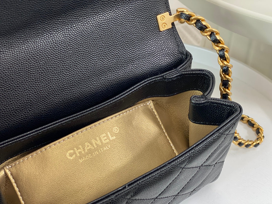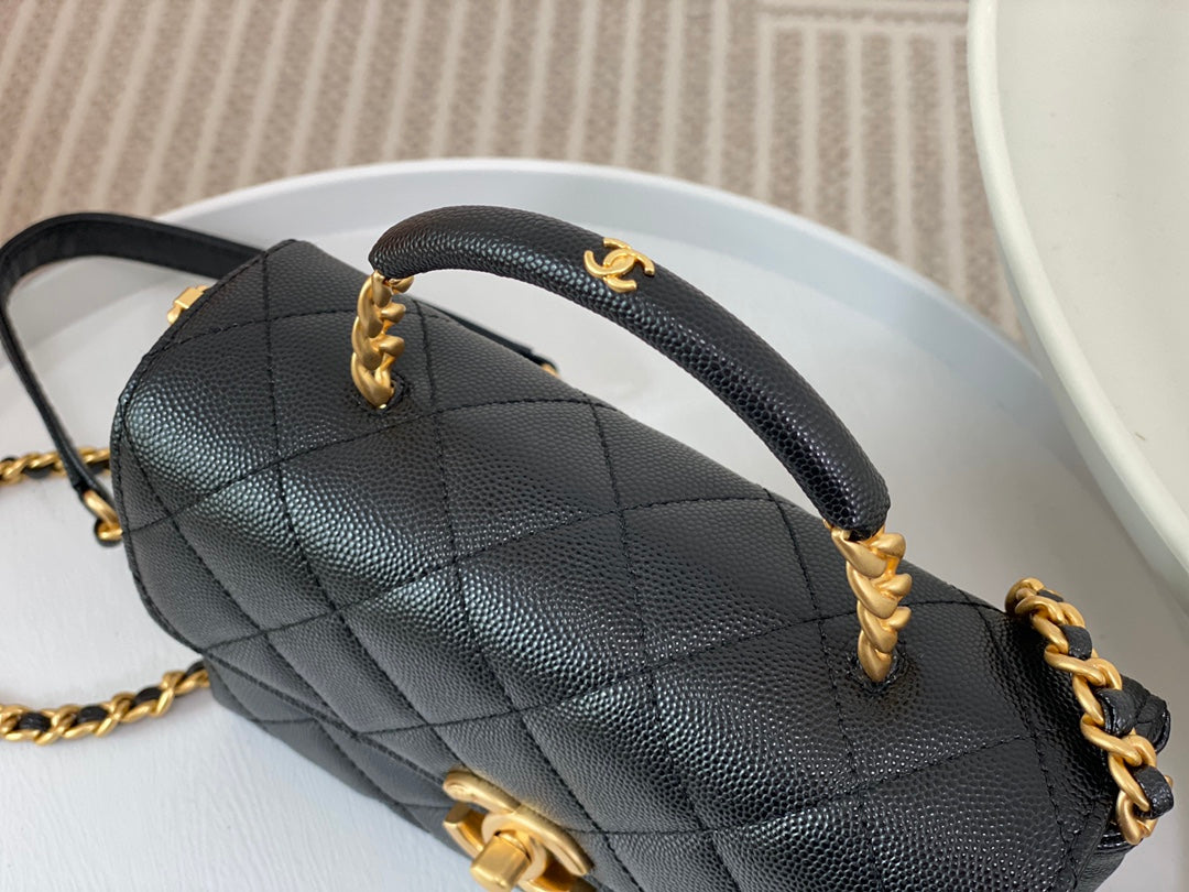 23S third season black Carry Me holds its charm. Mini size, small and exquisite, made of caviar leather 🐂 with aged hardware. The handle design adds extra appeal—black handle plus gold logo is perfectly delicate. Slightly playful and absolutely gorgeous!