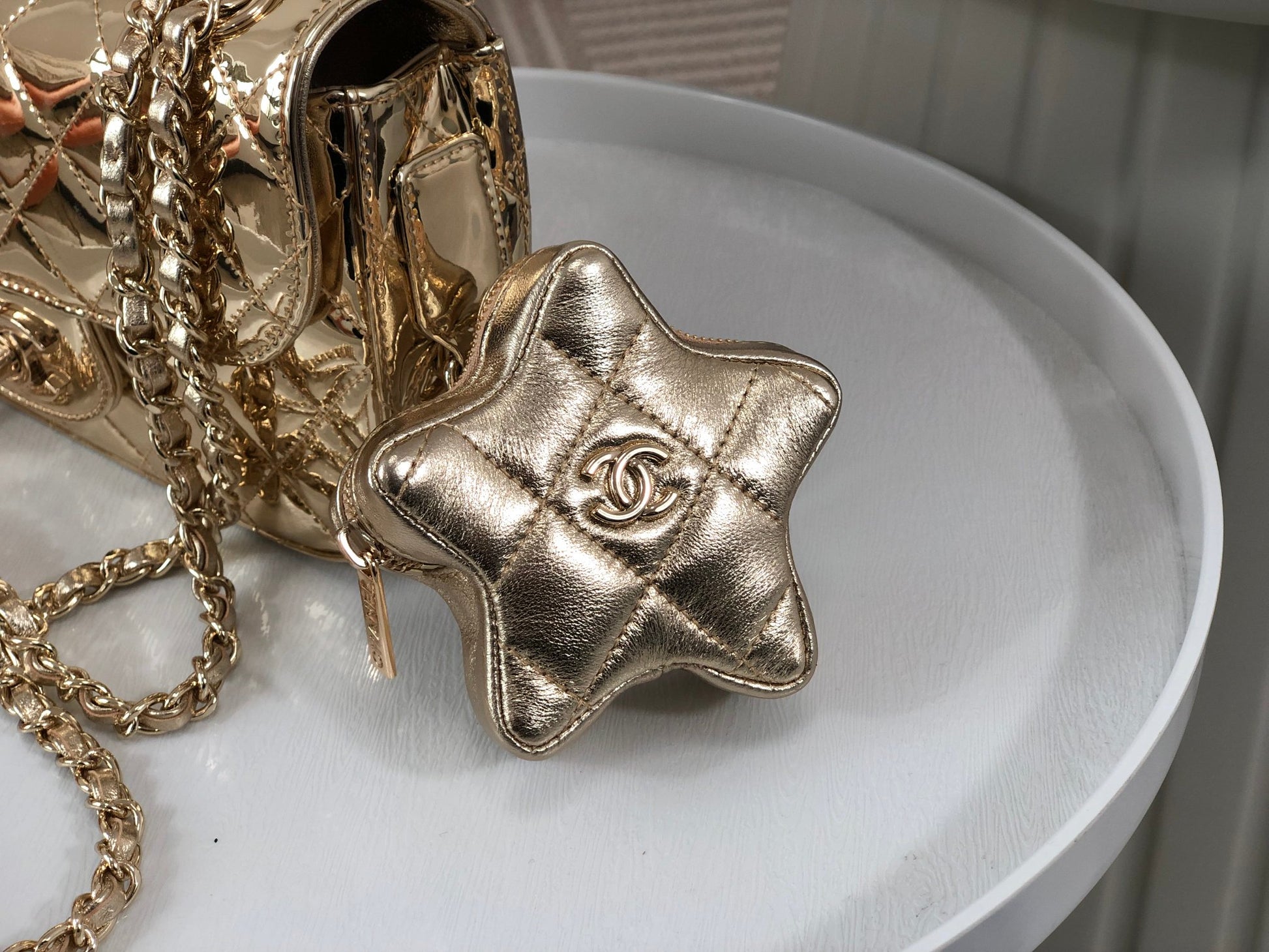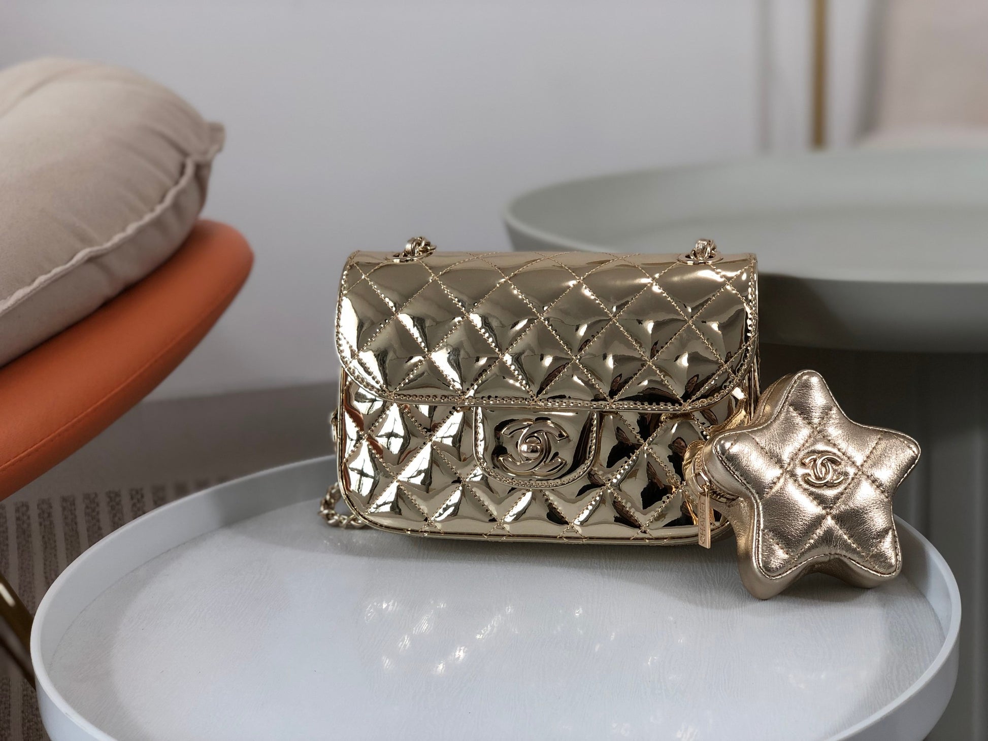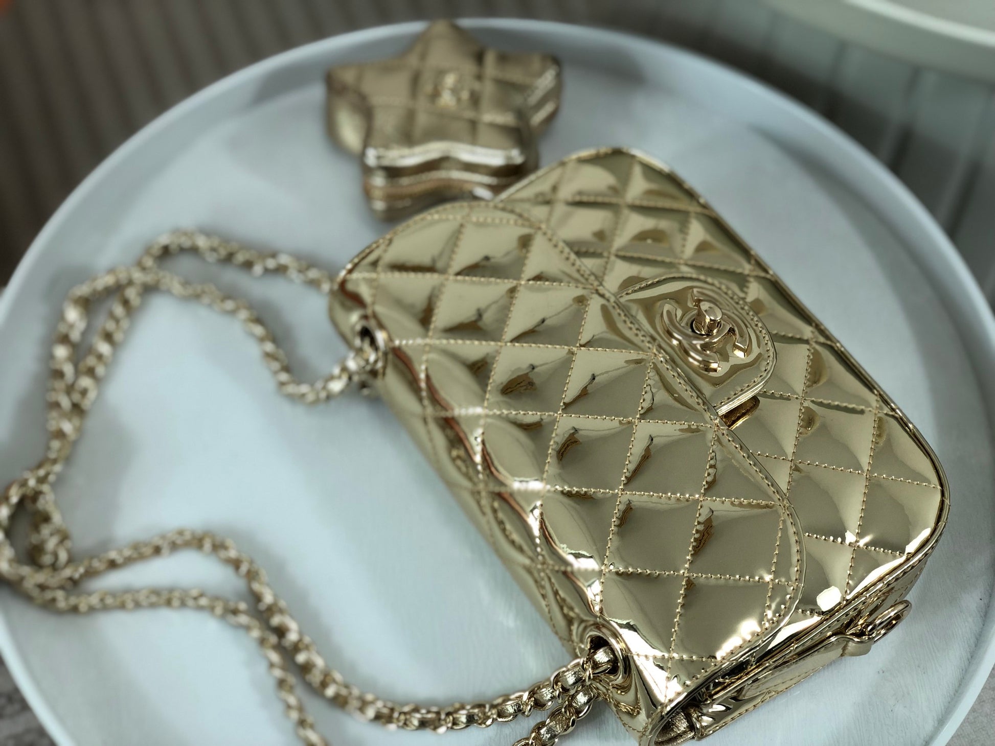 A striking and explosive statement bag, the dream bag for fashionistas. Mirror finish paired with light gold hardware—super cool. /::+ On the side hangs an incredibly cute and eye-catching charm 🤩. The pentagram⭐ star bag features a detachable design, giving a “buy one, get one” vibe.