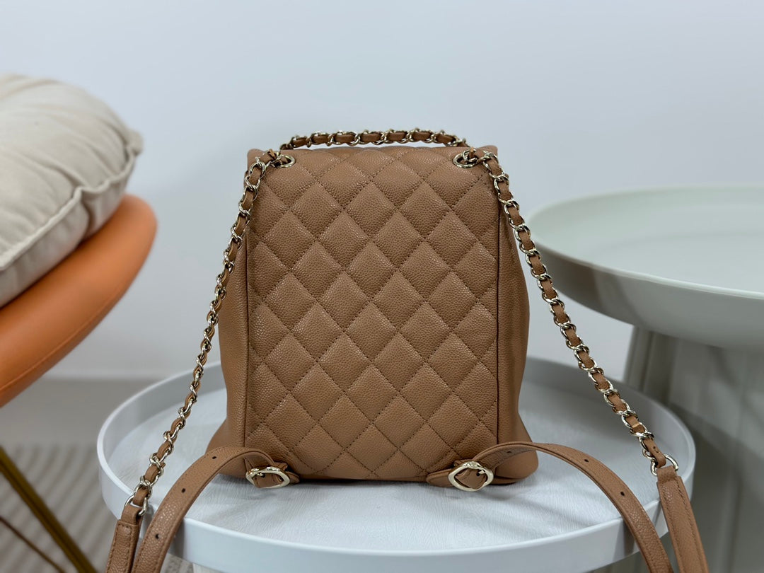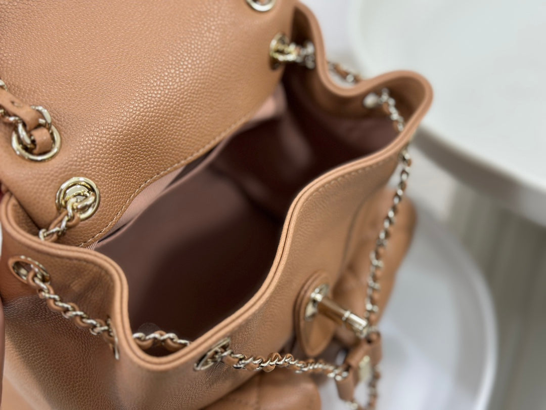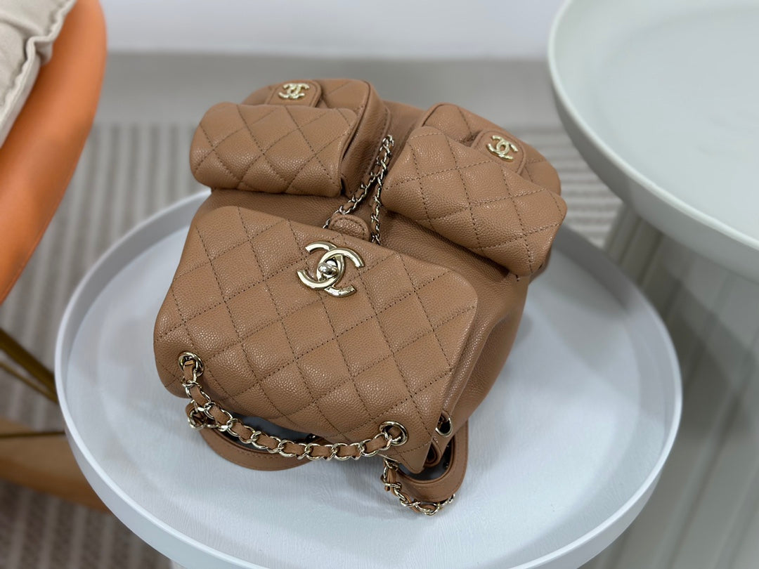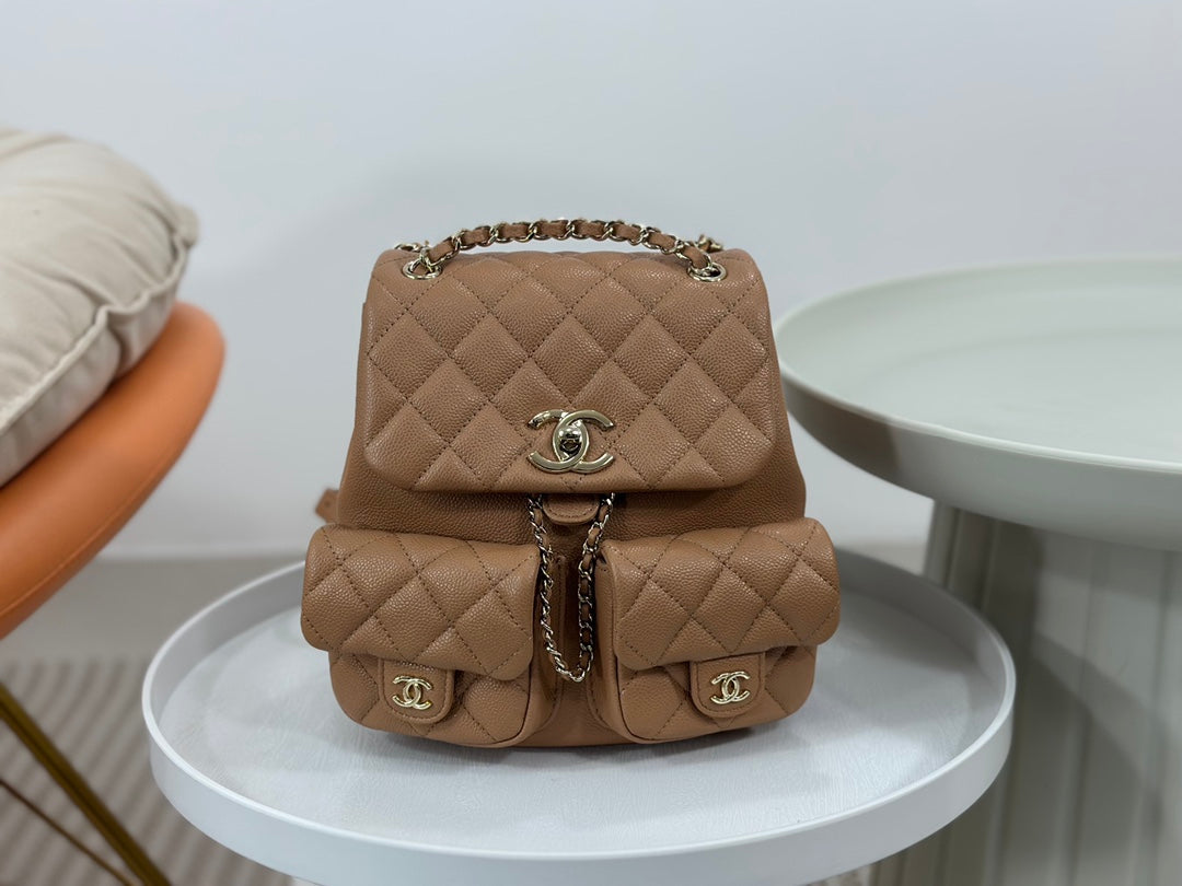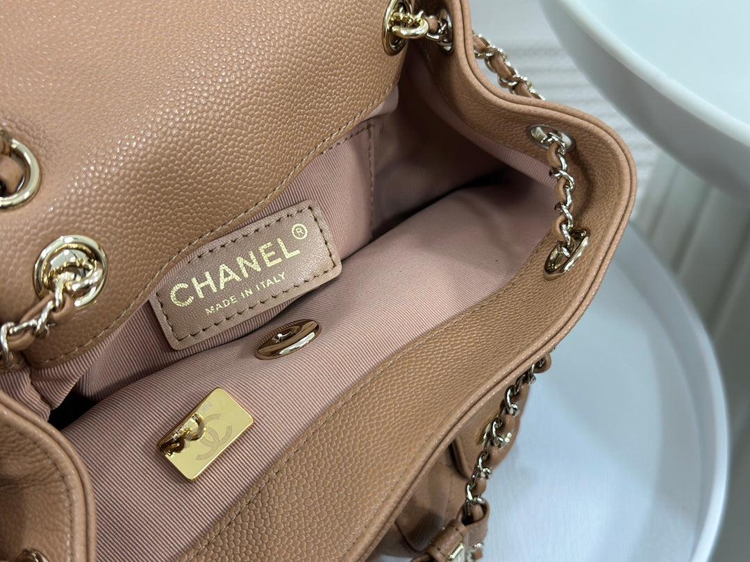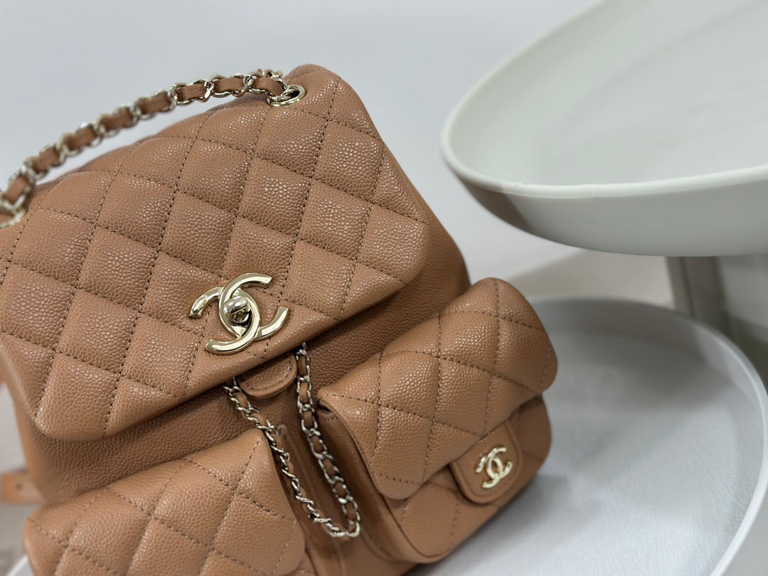 23P latest Duma backpack 🎒 Highly anticipated dual-pocket vintage backpack. Made of durable caviar leather with light gold hardware. Always a favorite material—easy to maintain and long-lasting. Adjustable shoulder straps. The three-pocket design shows Chanel’s attention to detail. Sweet or edgy, spacious and perfect for styling 🤩
