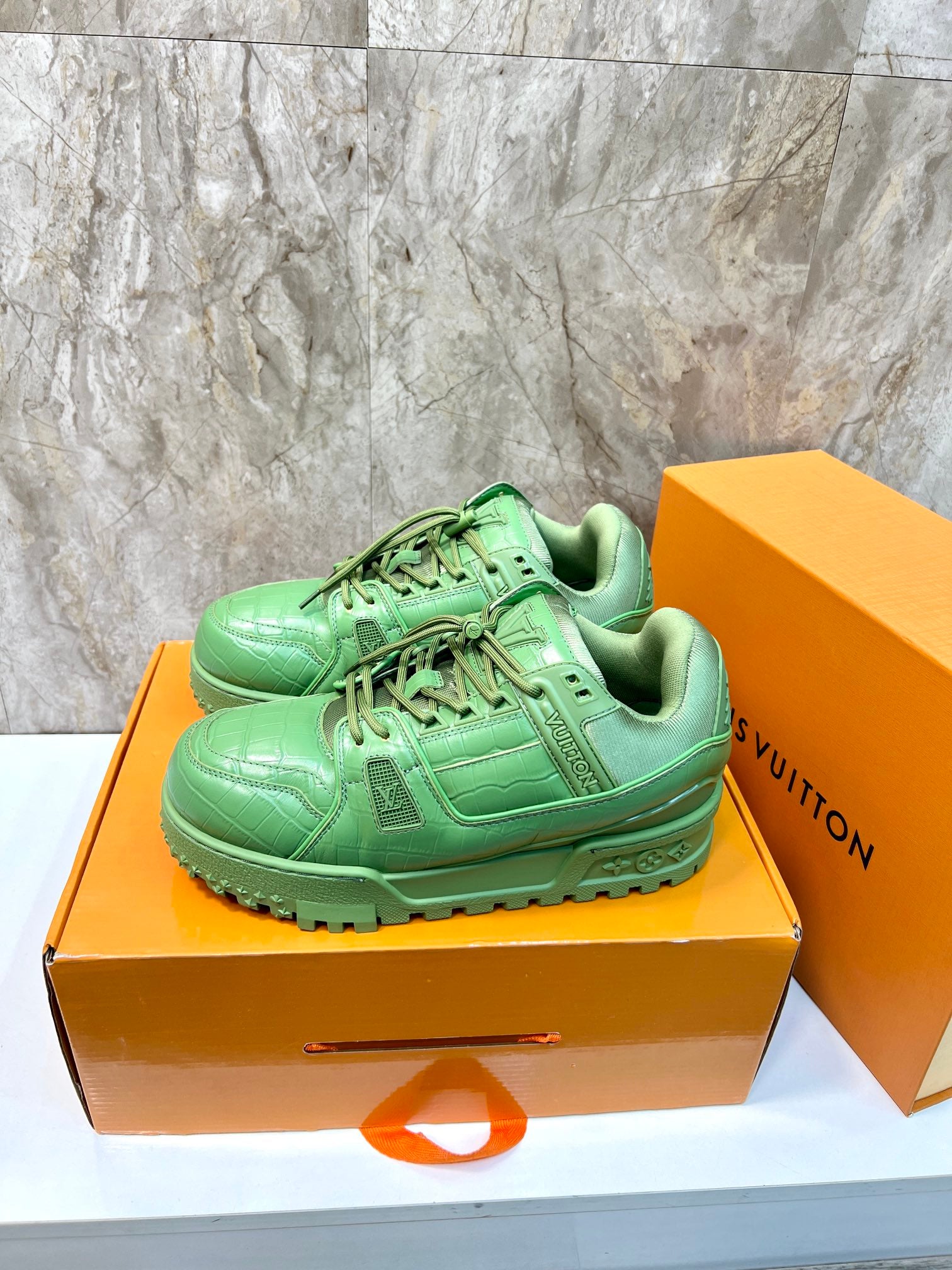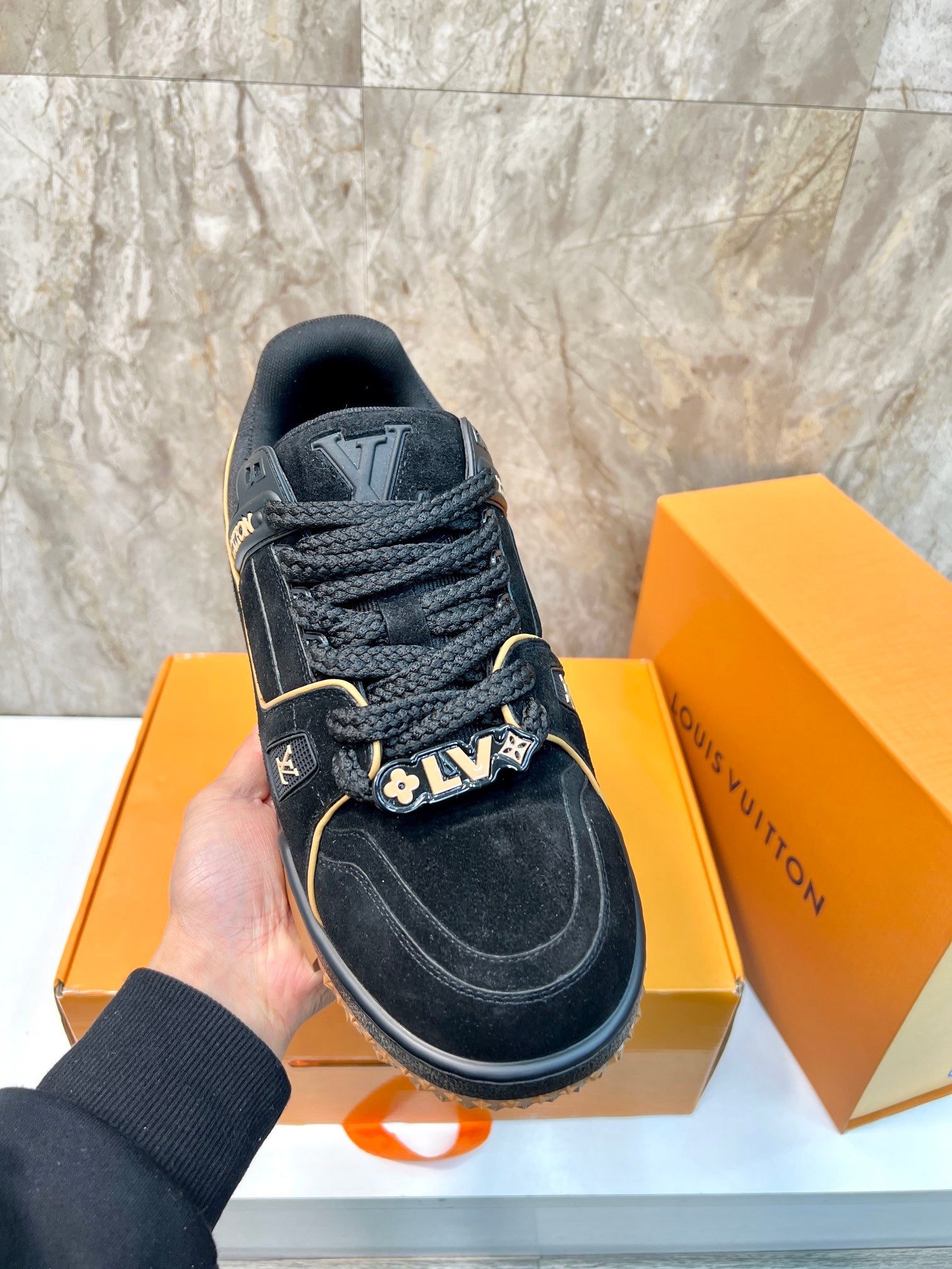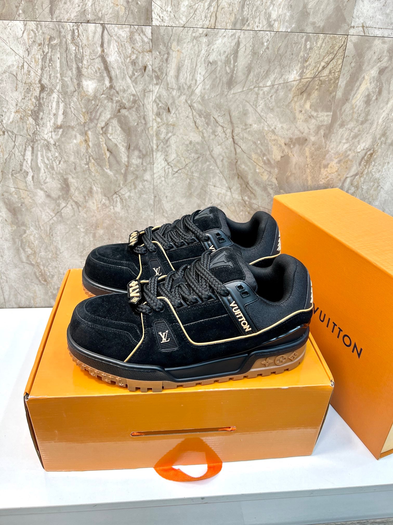 This design amplifies the classic LV Trainer sneakers and is inspired by the 2024 Spring/Summer men’s fashion show. Rubber LV logo accents on the tongue, sides, and heel. Wide fabric laces decorated with Louis Vuitton bead logo.