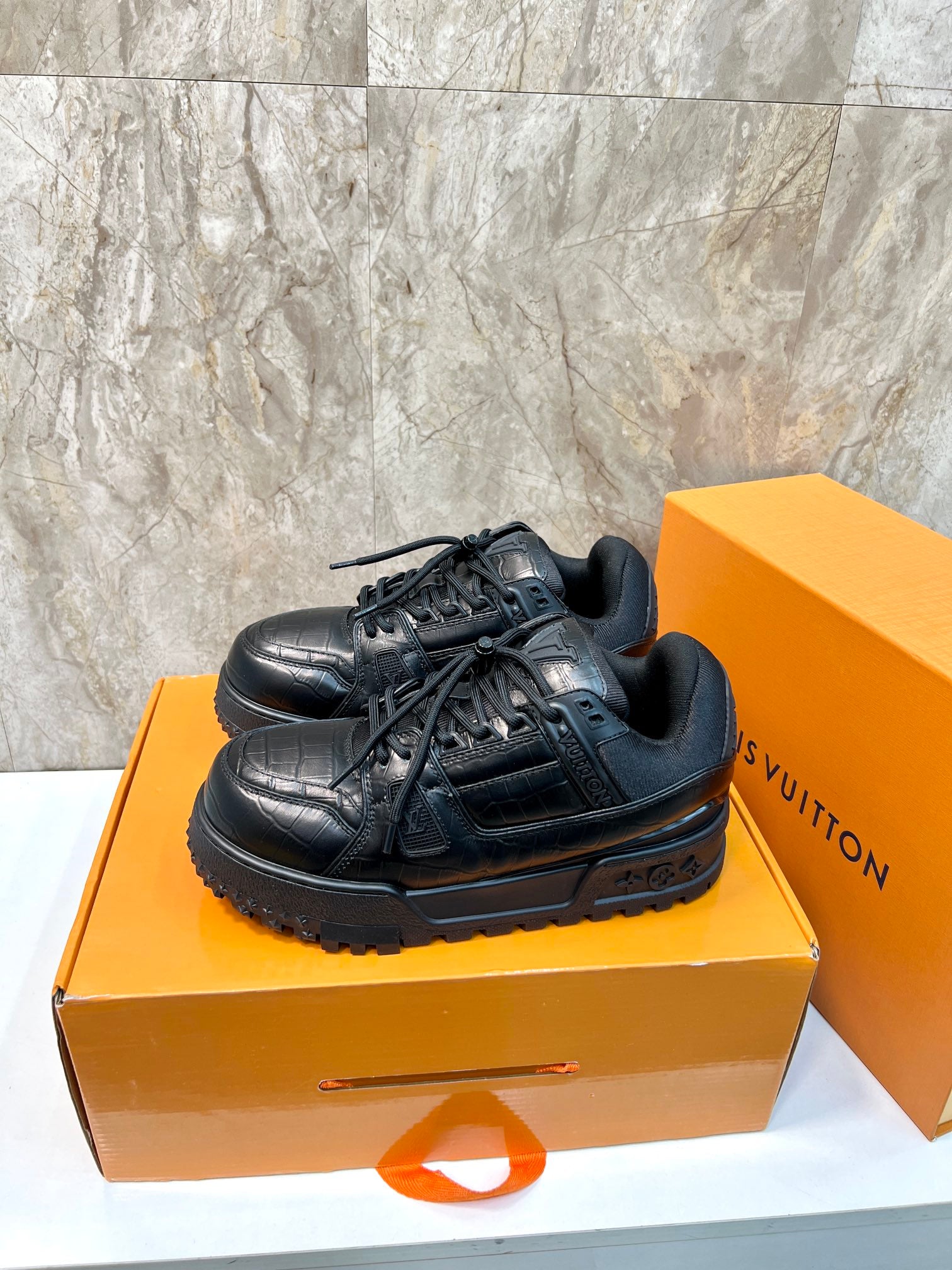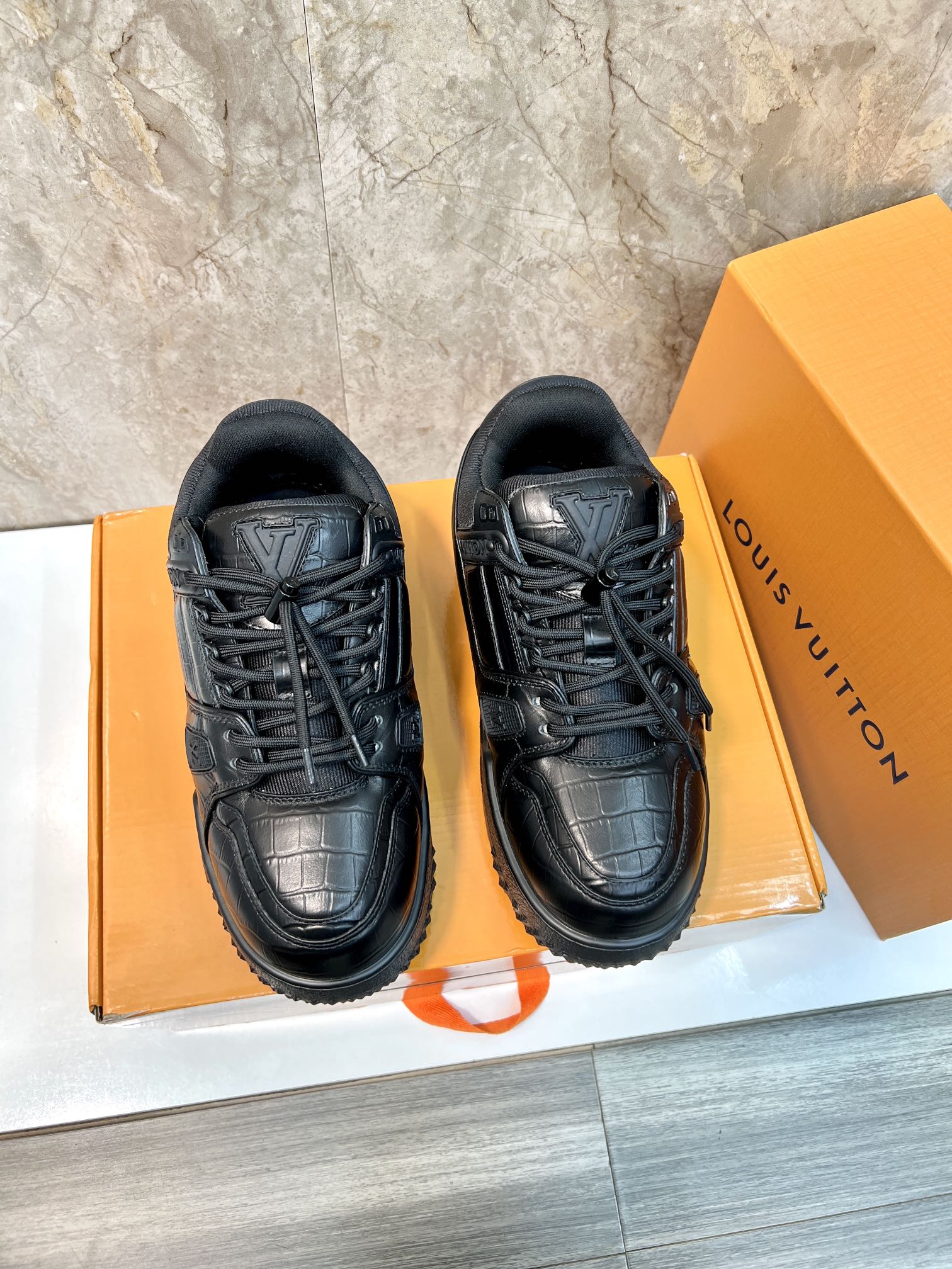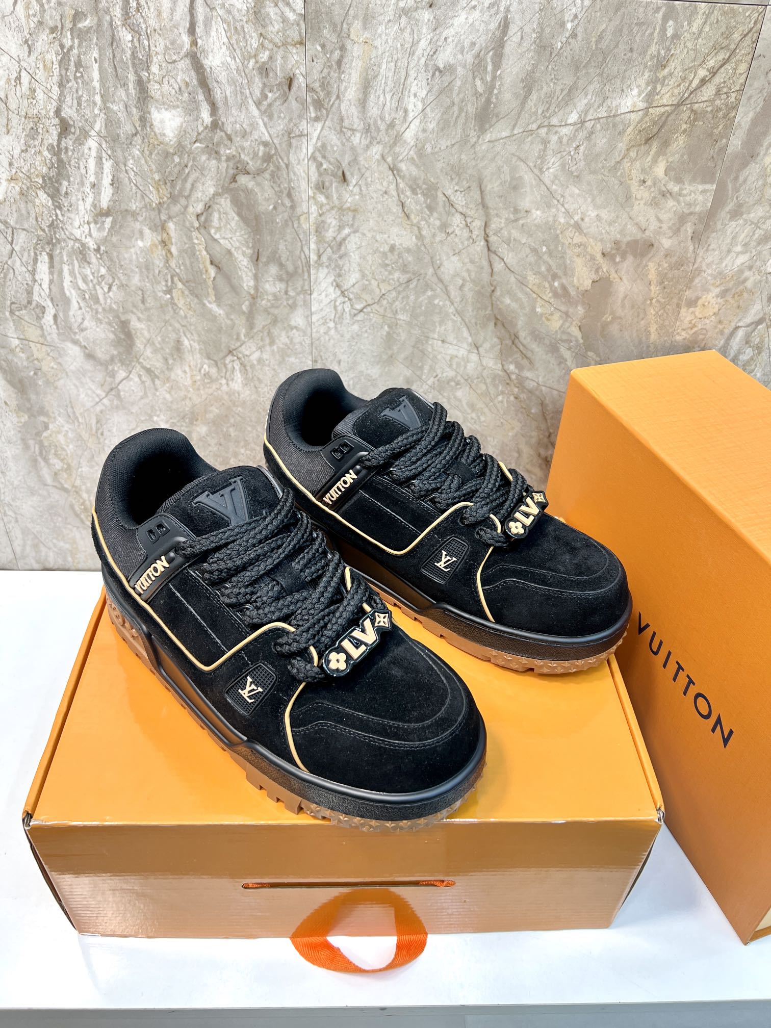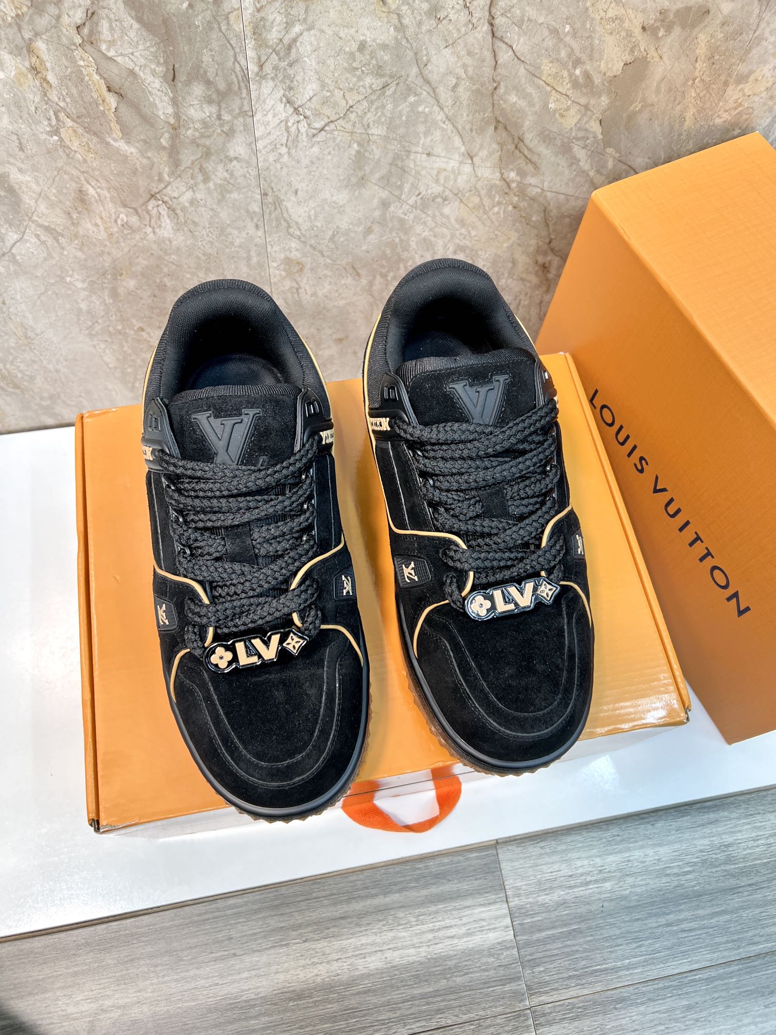 This design amplifies the classic LV Trainer sneakers and is inspired by the 2024 Spring/Summer men’s fashion show. Rubber LV logo accents on the tongue, sides, and heel. Wide fabric laces decorated with Louis Vuitton bead logo.