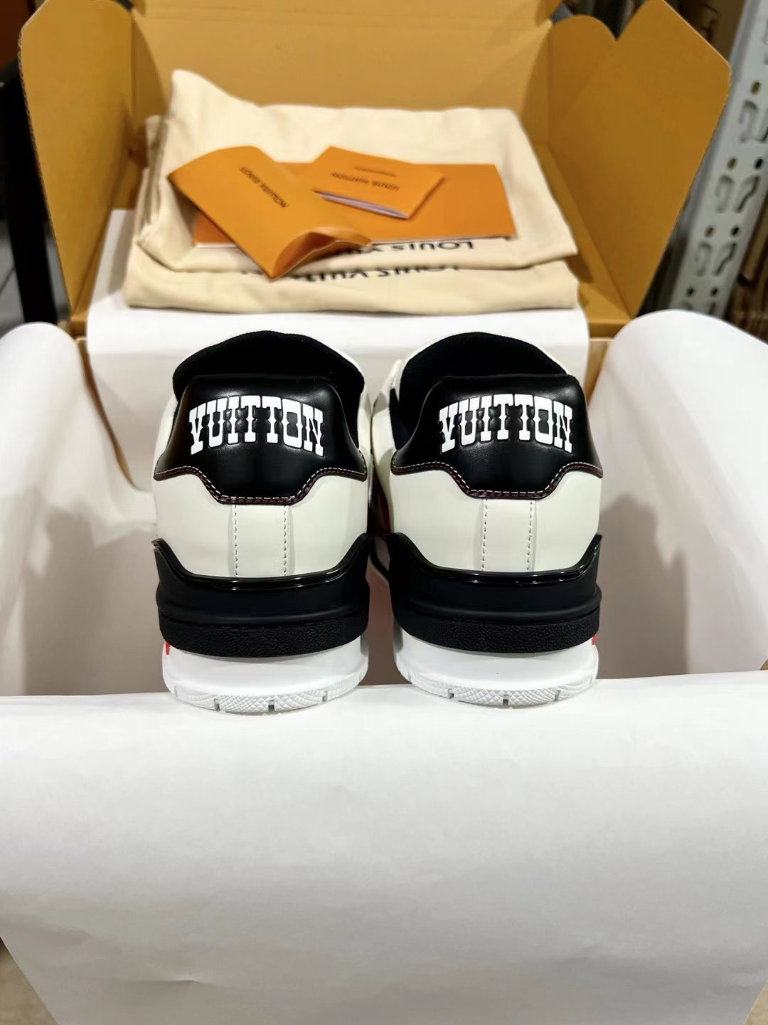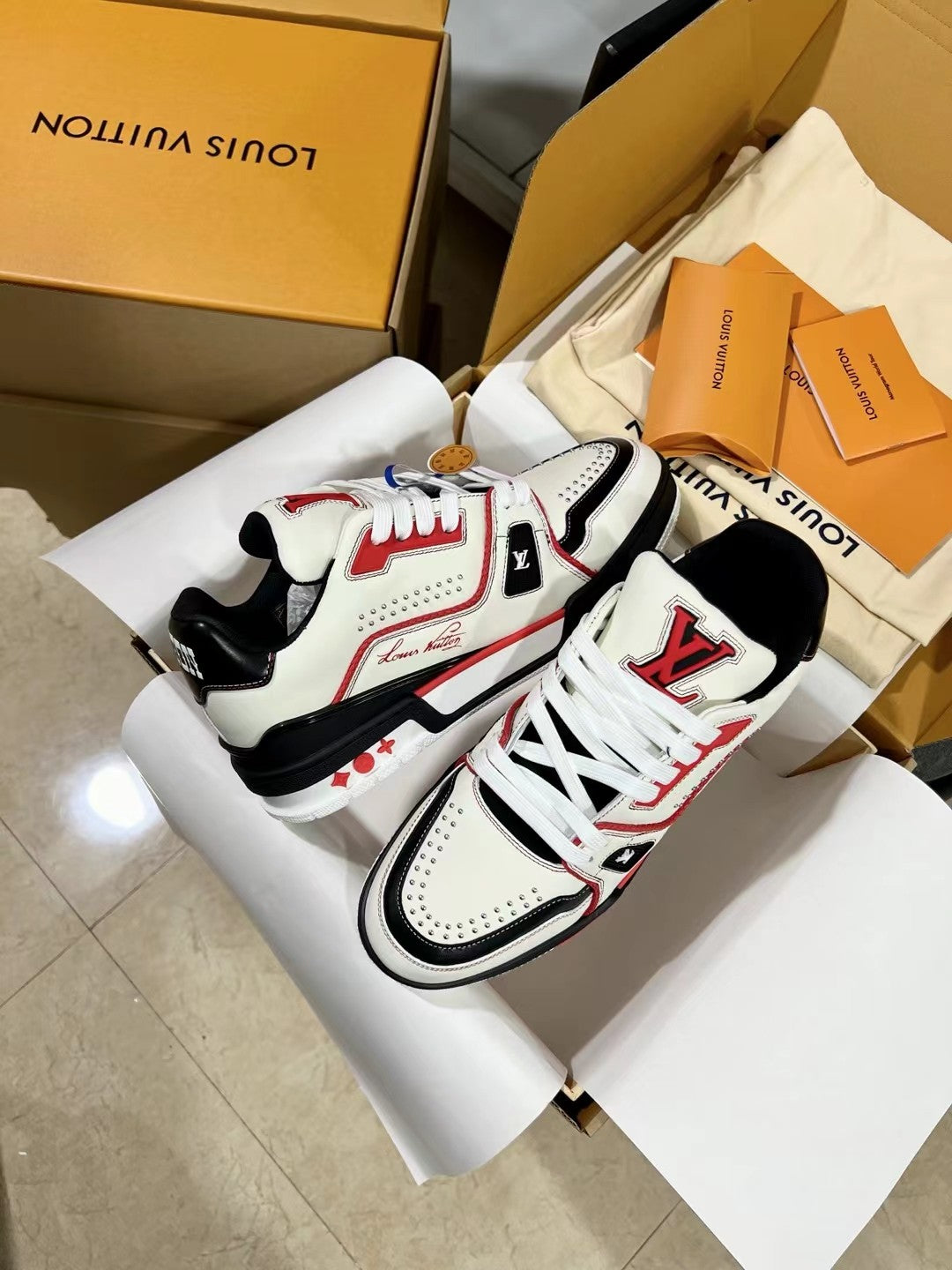 Upper crafted from original custom embossed pebbled calf leather (not mass-market microfiber—please distinguish!) with symmetrical monogram washed denim. All accessories and materials are 1:1 custom-made according to the original, including the shoelace colors. Original-style private mold TPU outsole. Many subtle design details are only properly executed on the original, showcasing true craftsmanship. Original chip tag included—scan to access LV official website 😏