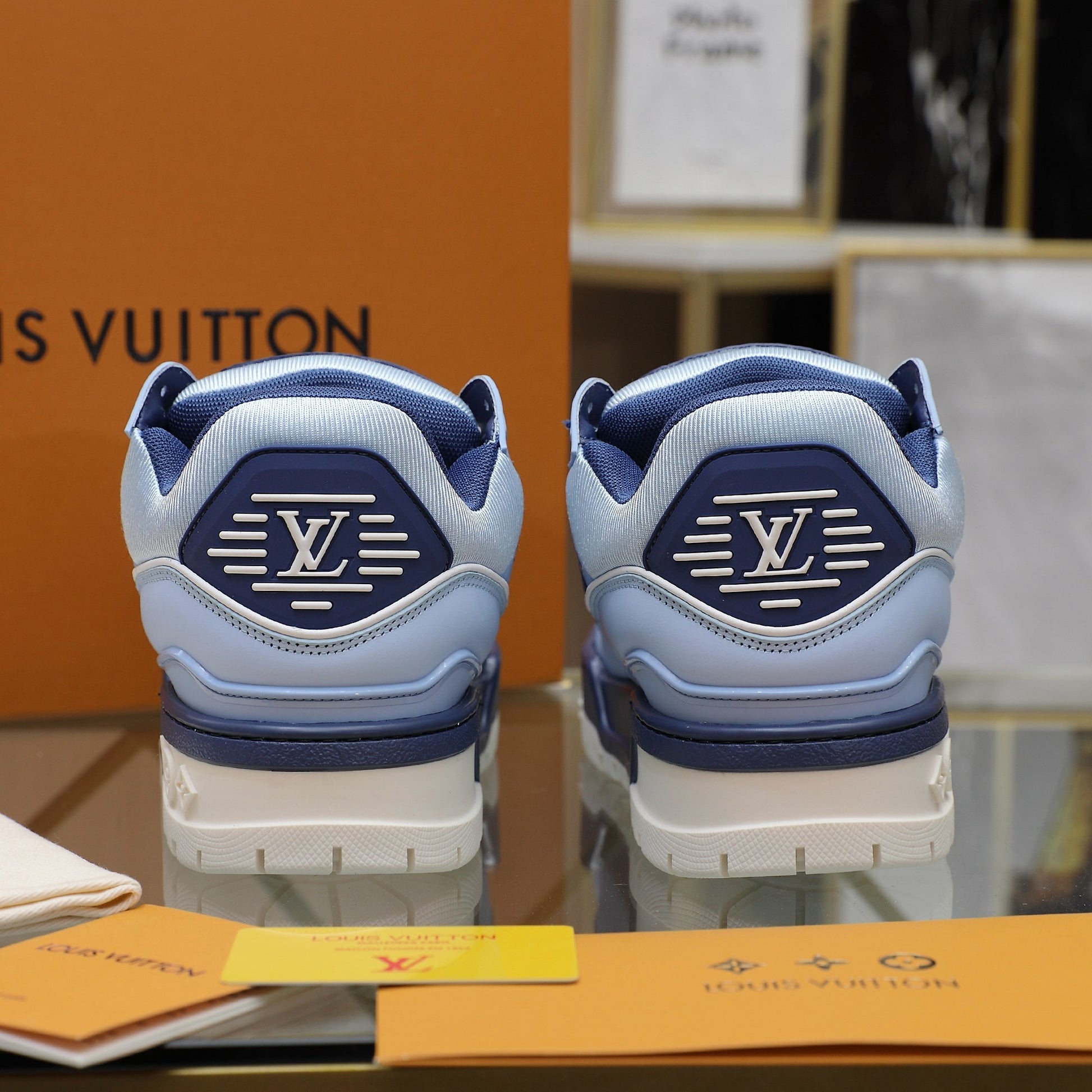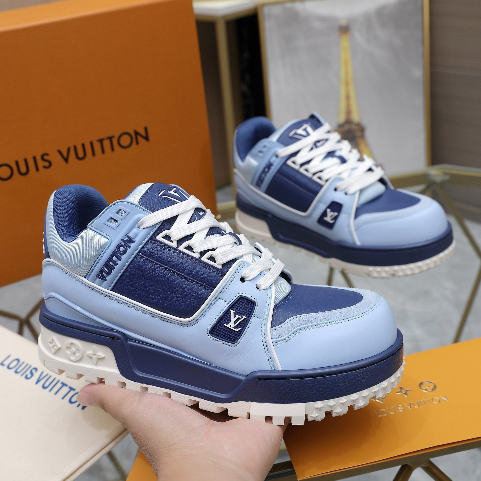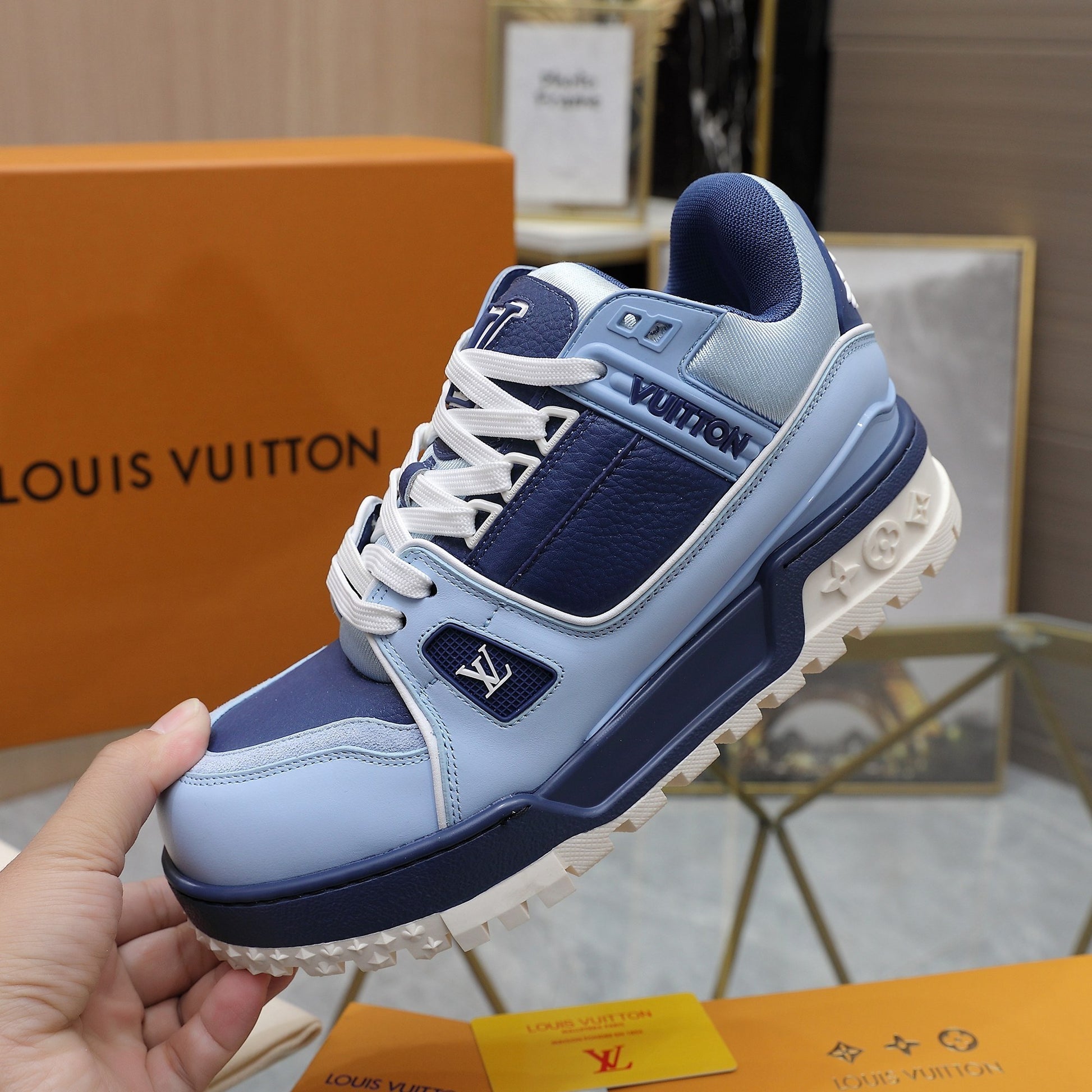 Upper crafted from original custom embossed pebbled calf leather (not mass-market microfiber—please distinguish!) with symmetrical monogram washed denim. All accessories and materials are 1:1 custom-made according to the original, including shoelace colors. Original-style private mold TPU outsole. Many subtle design details are only properly executed on the original, showcasing true craftsmanship. Original chip tag included—scan to access LV official website 😏
