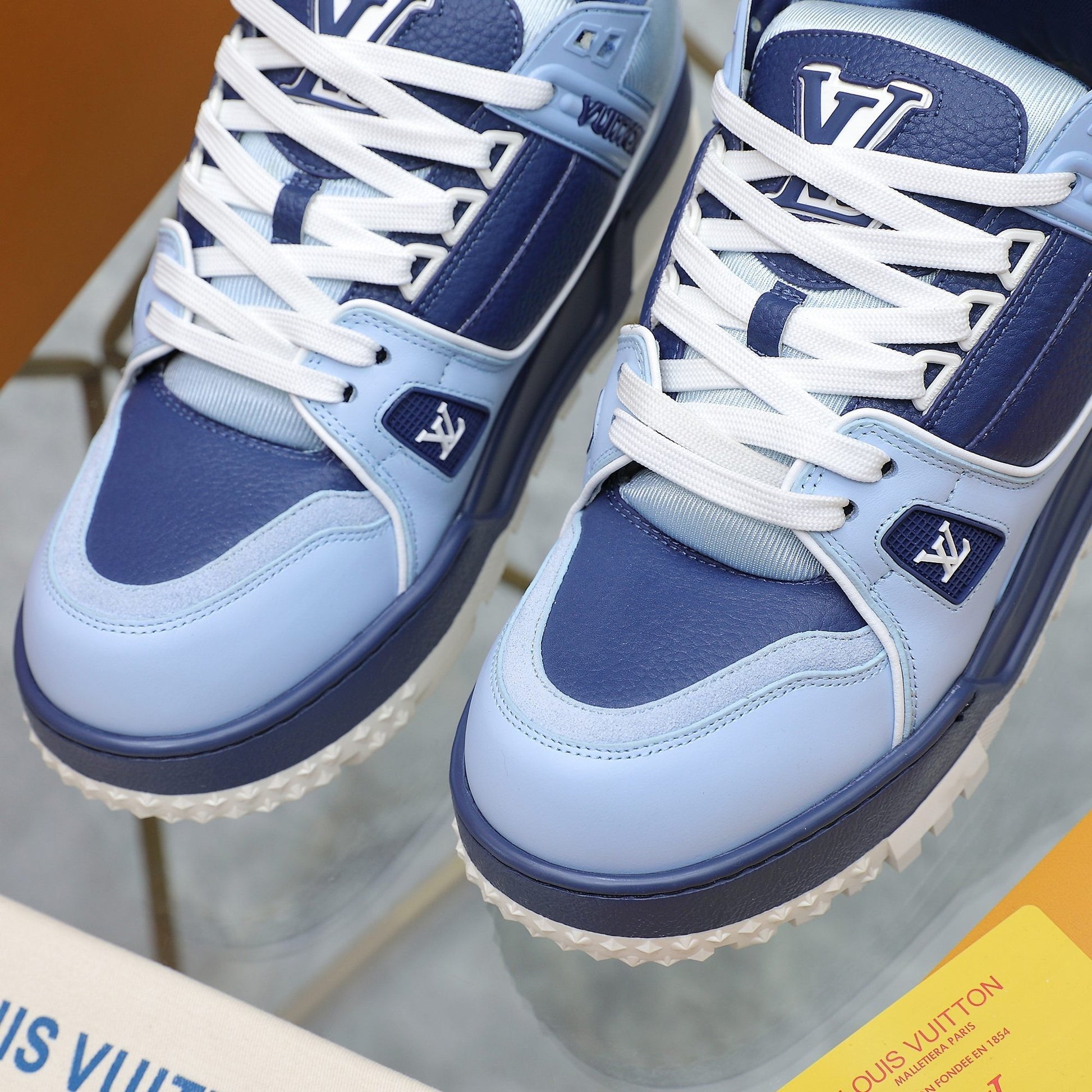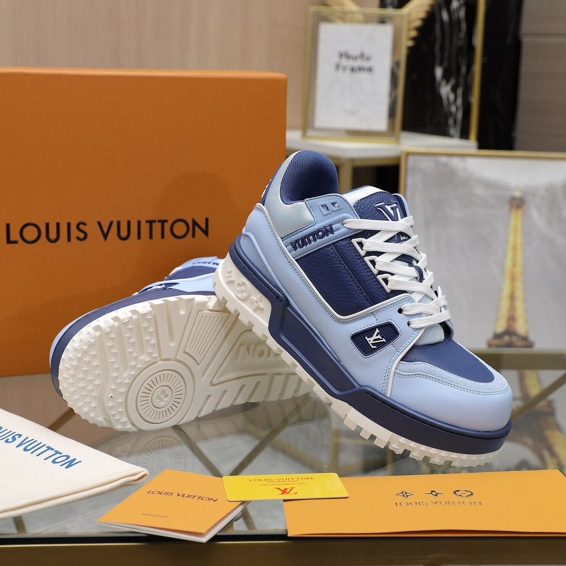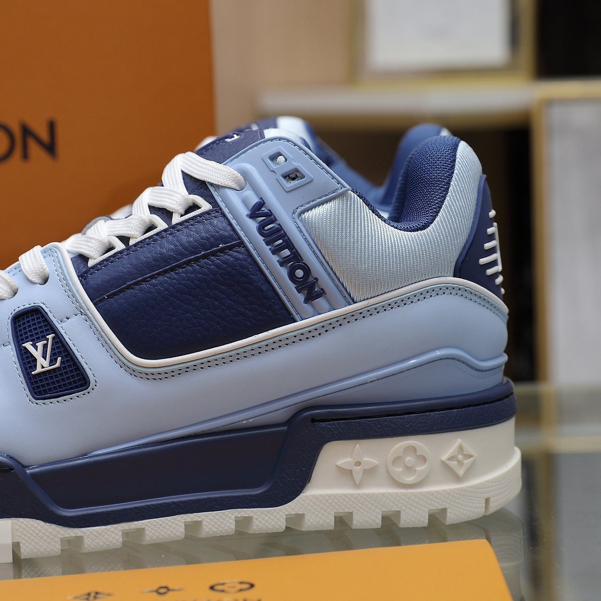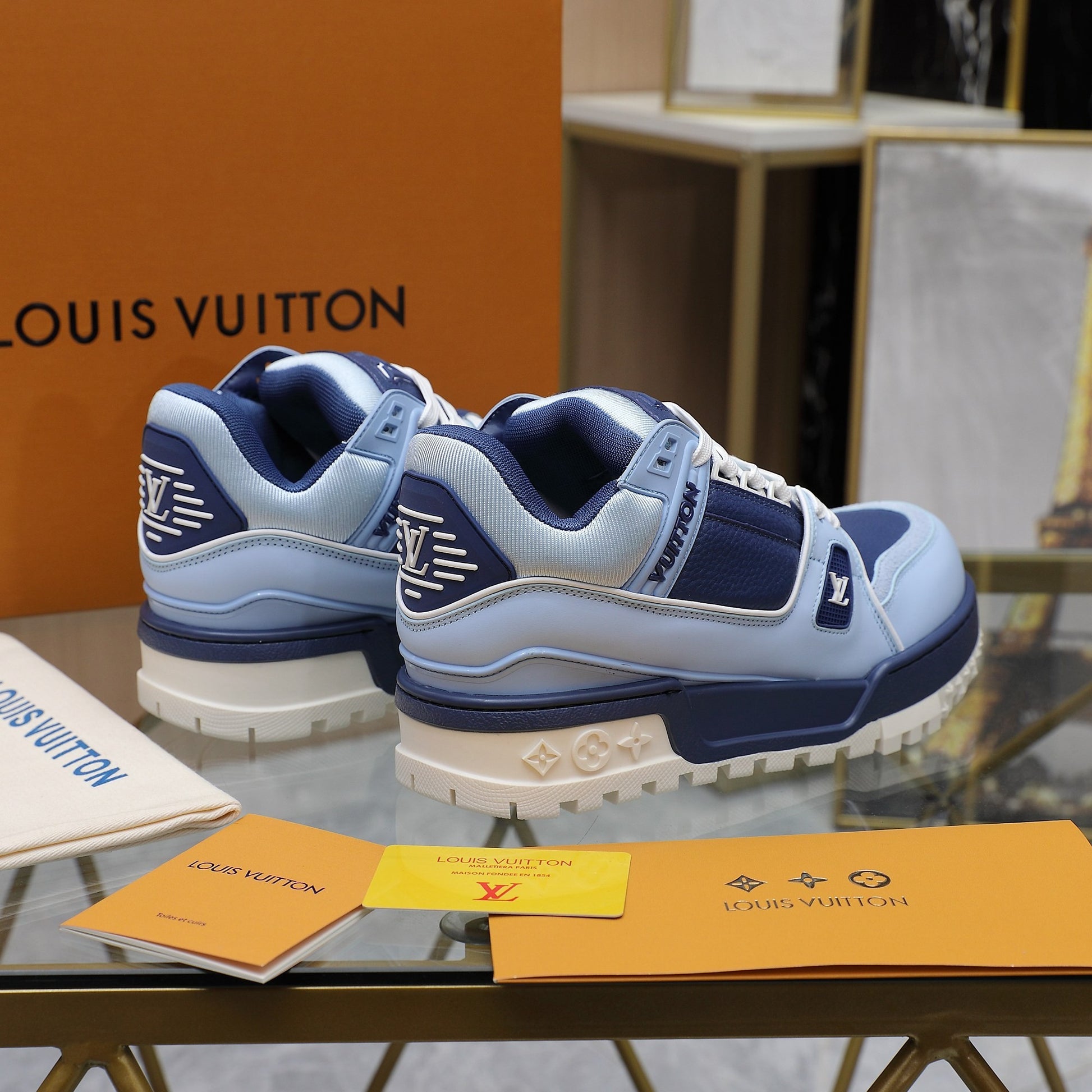 Upper crafted from original custom embossed pebbled calf leather (not mass-market microfiber—please distinguish!) with symmetrical monogram washed denim. All accessories and materials are 1:1 custom-made according to the original, including shoelace colors. Original-style private mold TPU outsole. Many subtle design details are only properly executed on the original, showcasing true craftsmanship. Original chip tag included—scan to access LV official website 😏