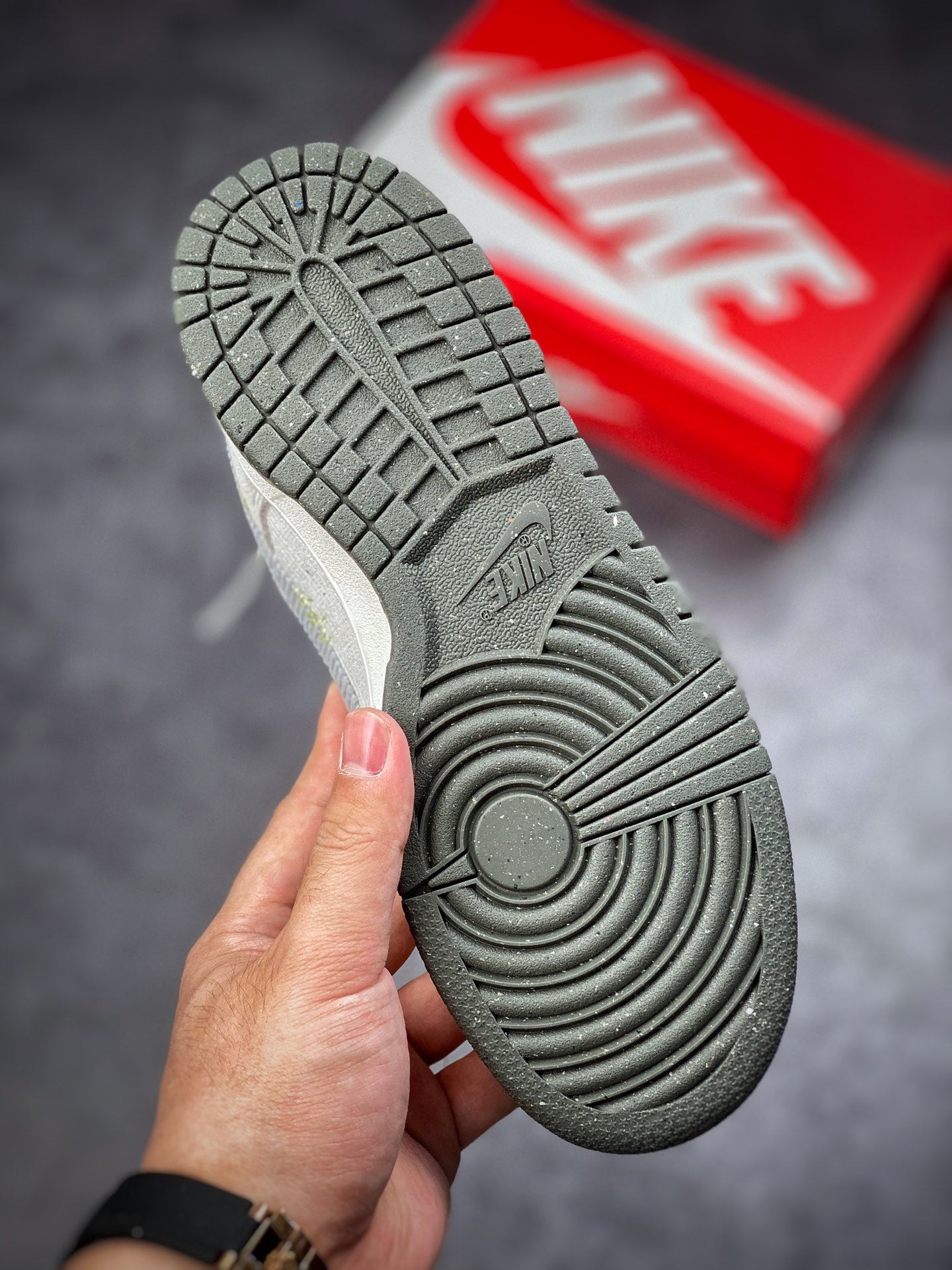 This Nike Dunk Low is made from a mix of recycled materials, including ribbed corduroy, suede, and twill, with embroidered patterns across the entire upper. The white midsole and speckled black rubber outsole feature loose stitching, and the right insole is printed with “On The Bright Side,” completing the design.