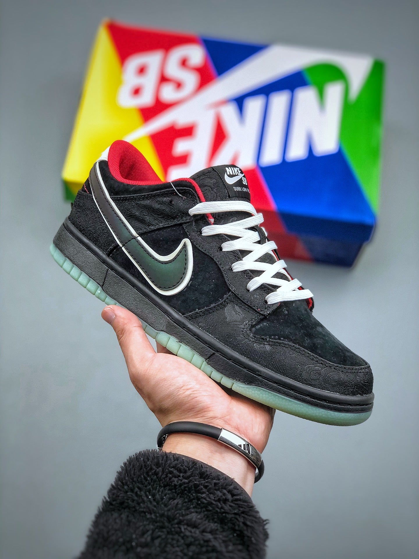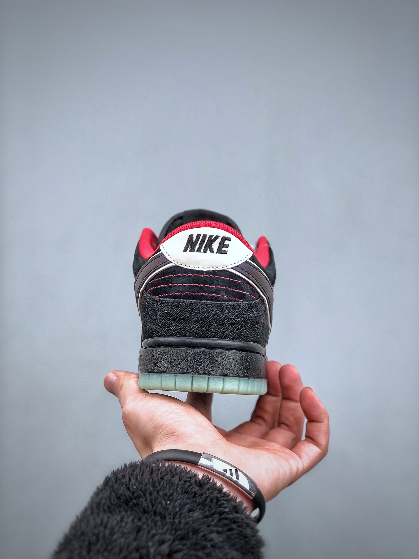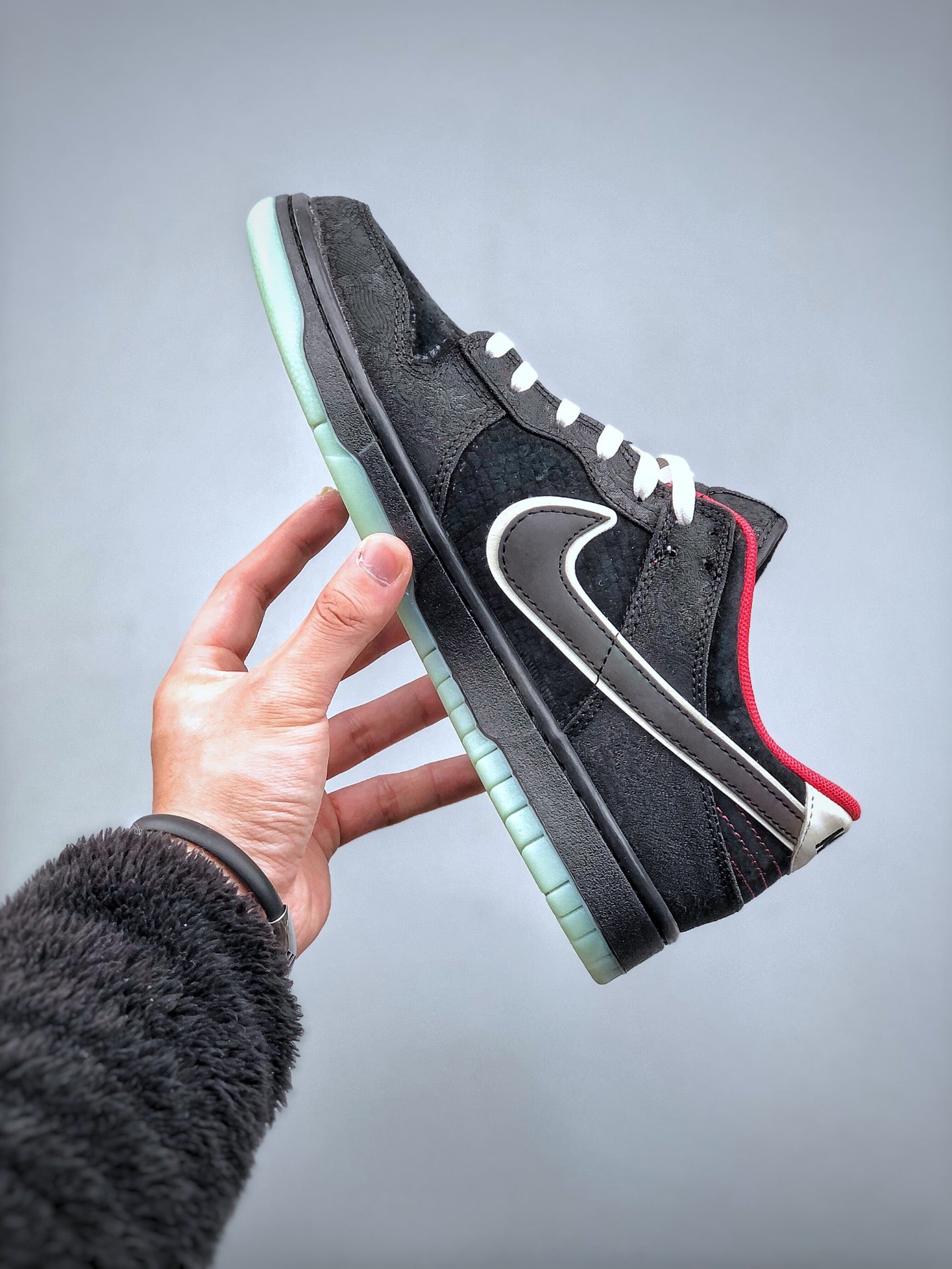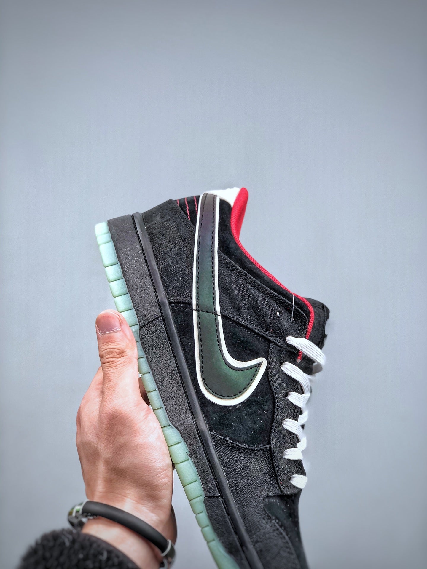 Nike collaborates with League of Legends to release this special edition in celebration of the upcoming League of Legends World Championship. Based on the low-top Dunk silhouette, it features black suede with a red inner lining and white laces. The side Swoosh is adorned with gradient reflective material, while the tongue displays the LPL logo and the heel is accented with two stars. The standout feature is the glow-in-the-dark effect on the outsole and Swoosh outline, creating an eye-catching visual.