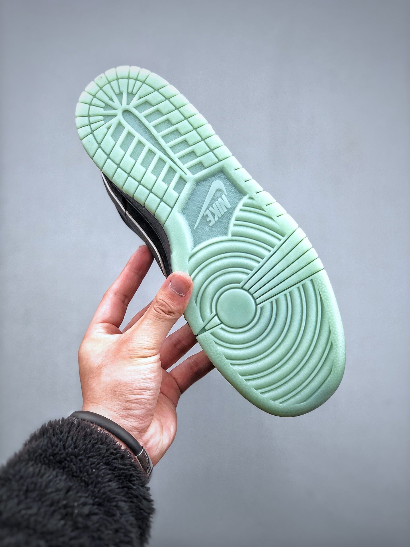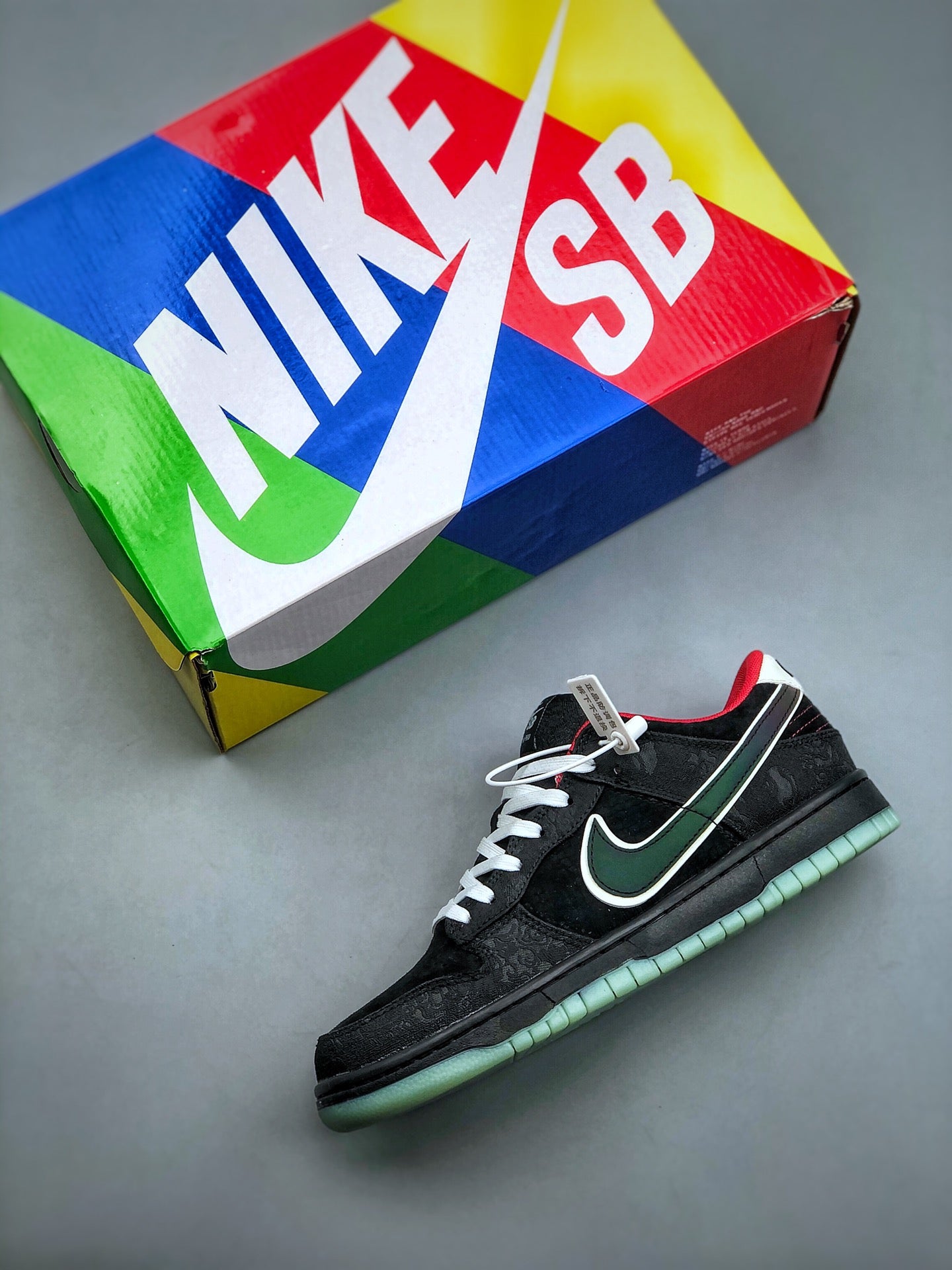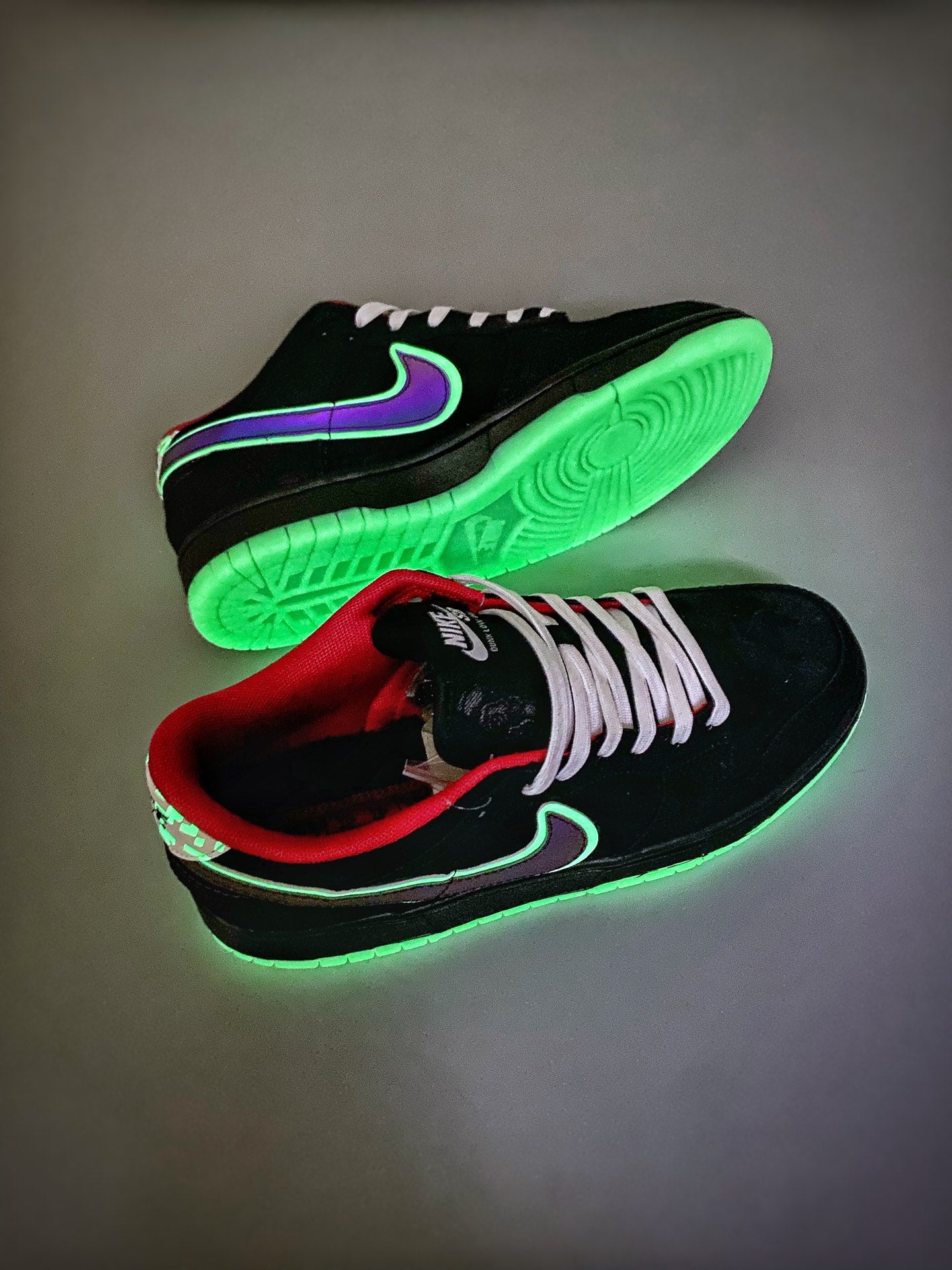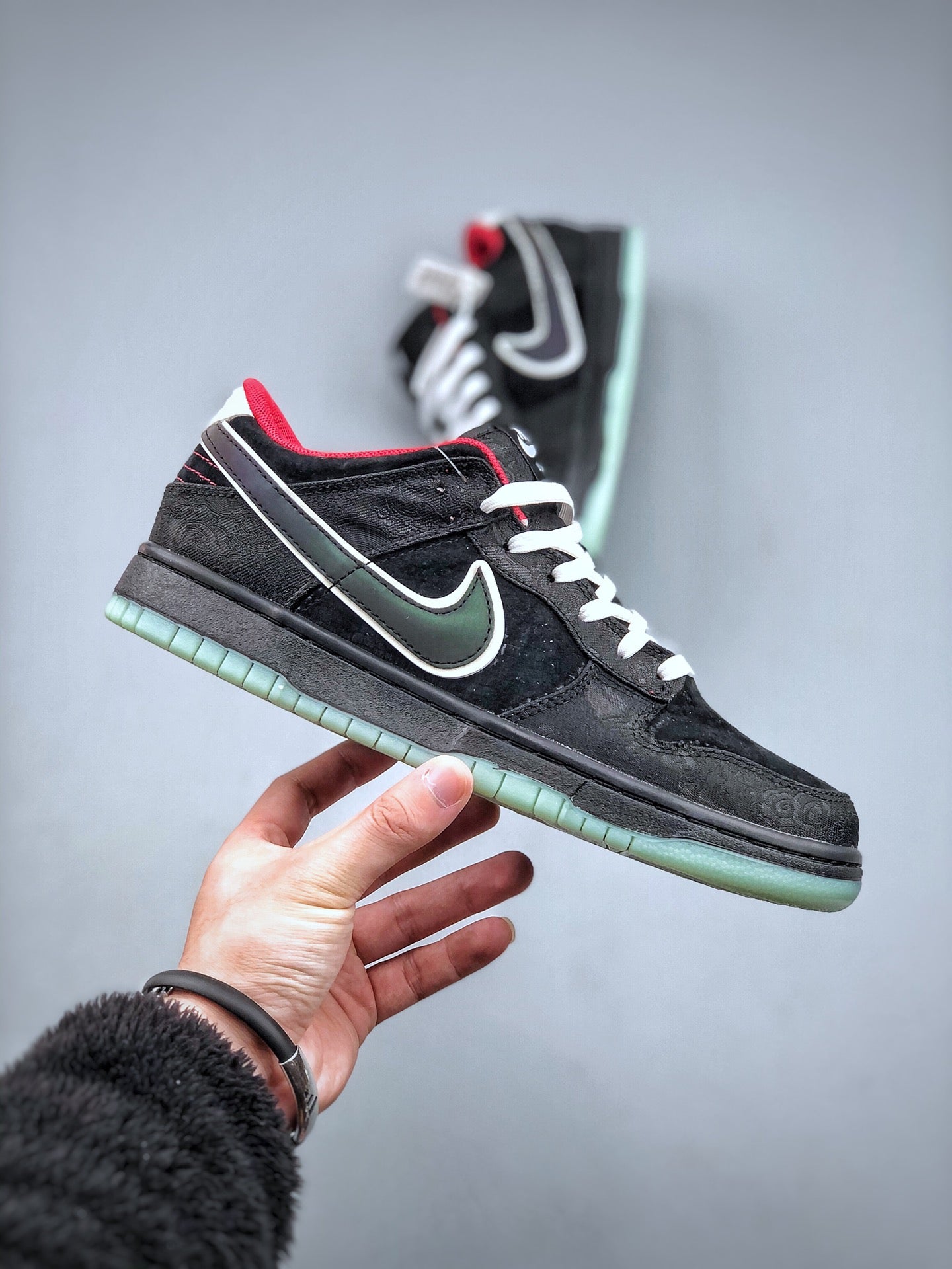 Nike collaborates with League of Legends to release this special edition in celebration of the upcoming League of Legends World Championship. Based on the low-top Dunk silhouette, it features black suede with a red inner lining and white laces. The side Swoosh is adorned with gradient reflective material, while the tongue displays the LPL logo and the heel is accented with two stars. The standout feature is the glow-in-the-dark effect on the outsole and Swoosh outline, creating an eye-catching visual.