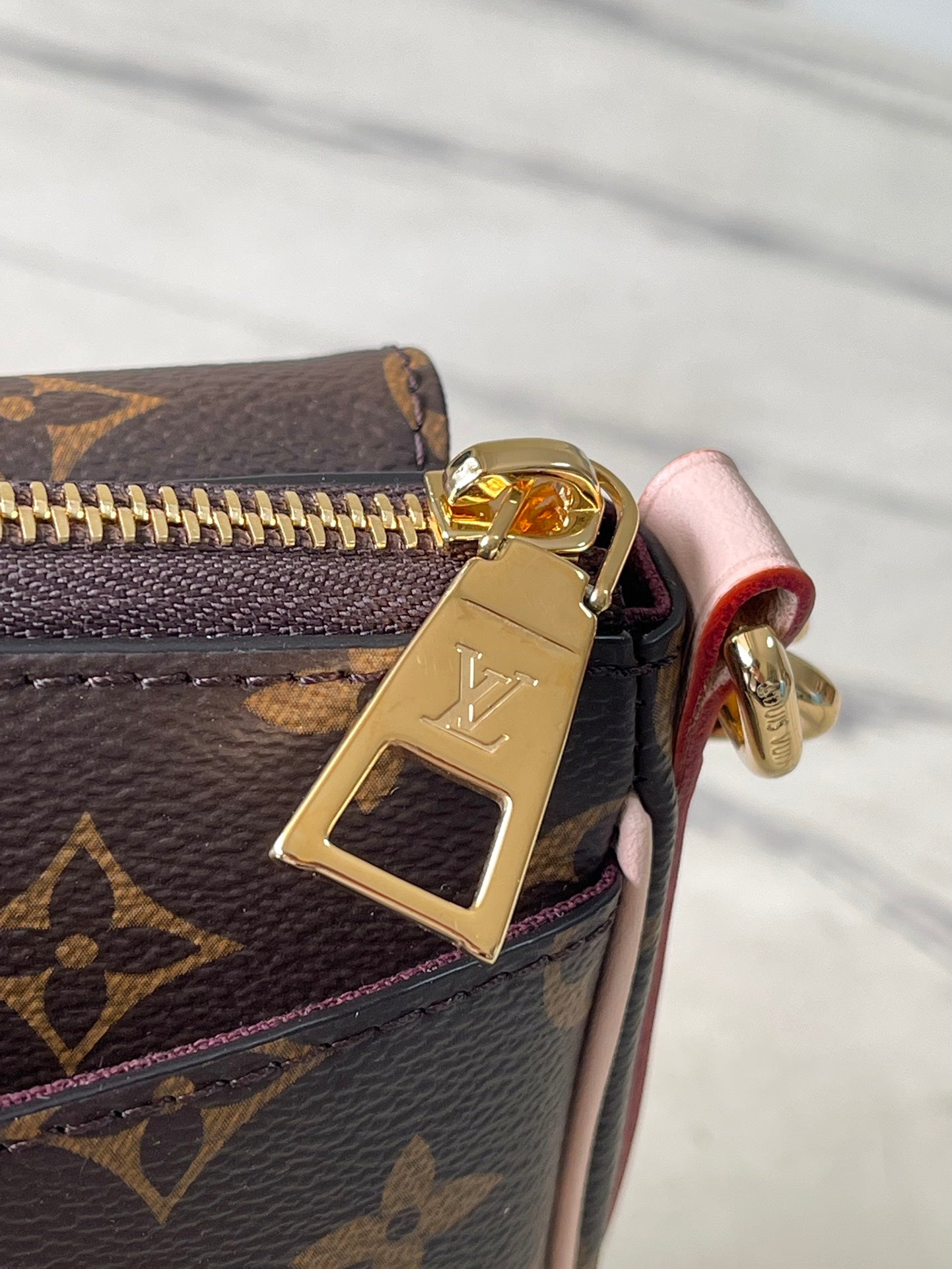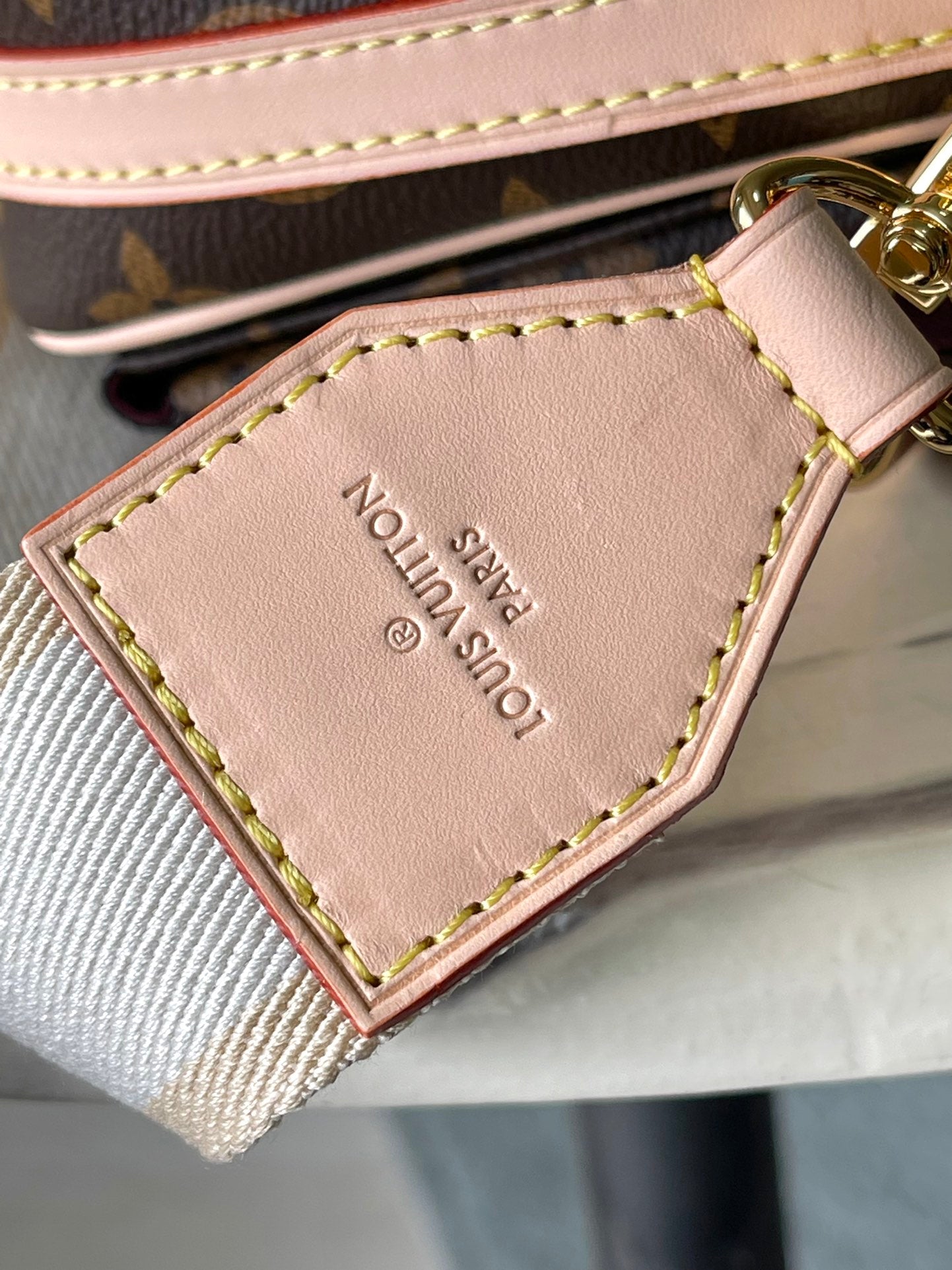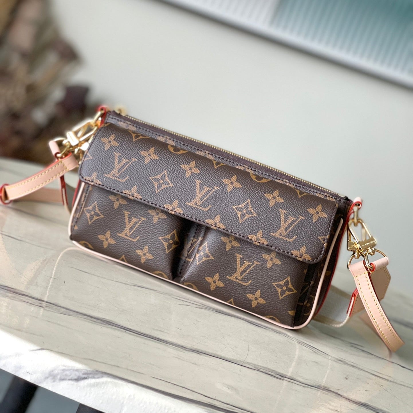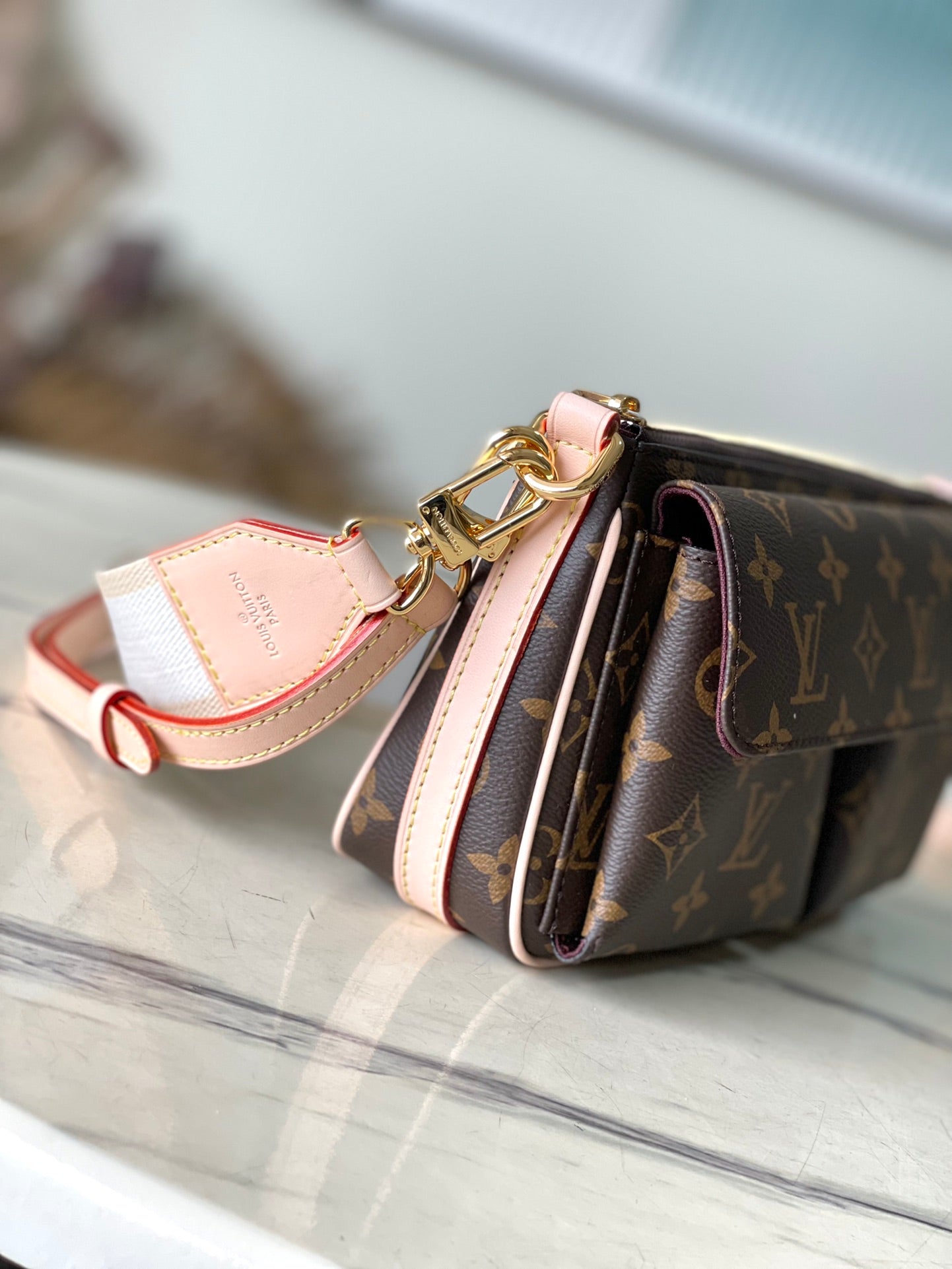 The Vibe handbag draws inspiration from the Viva-cité bag created by the brand in 2003. Crafted from Monogram canvas, it features a compact silhouette. Its interior and exterior pockets offer practical organization, while the leather shoulder strap and short fabric strap with LV Circle accents allow for versatile carrying options.
