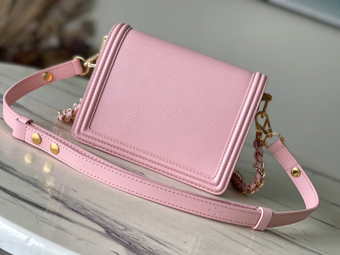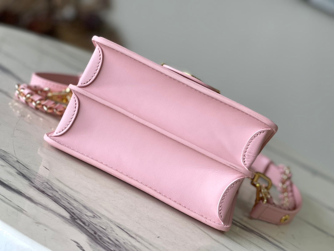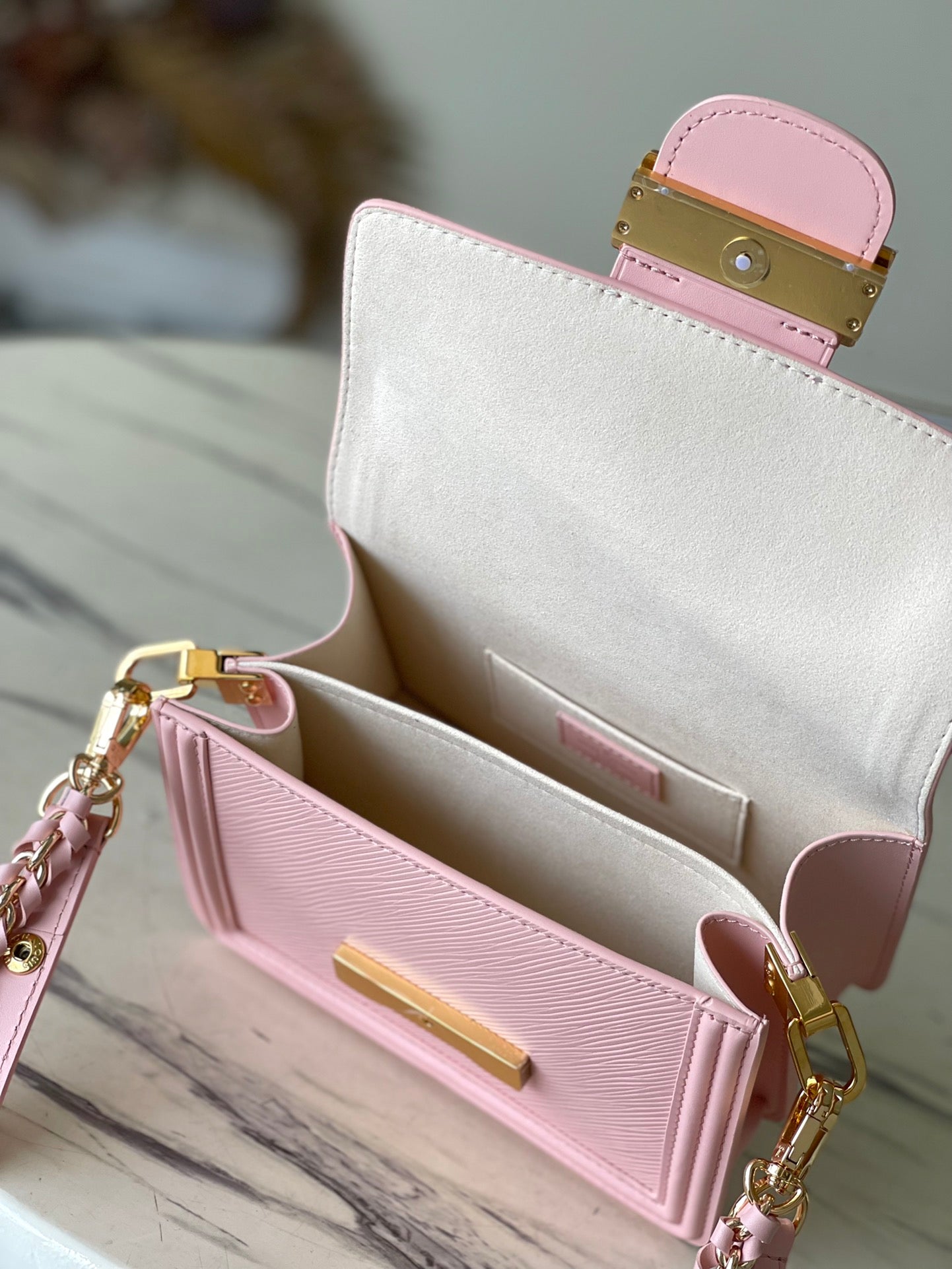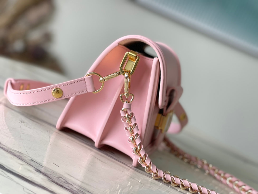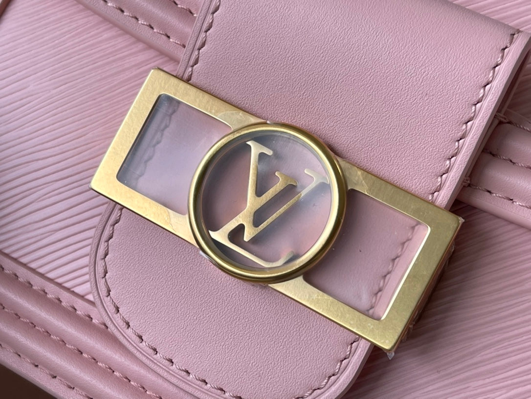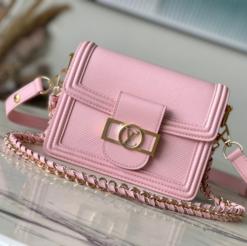 This Dauphine Mini Bag features distinctive textures crafted from Epi leather. Leather trims highlight unique shapes, complementing the LV Circle logo within the rectangular hardware. The detachable and adjustable leather shoulder strap combined with a woven chain allows for multiple carrying styles.
