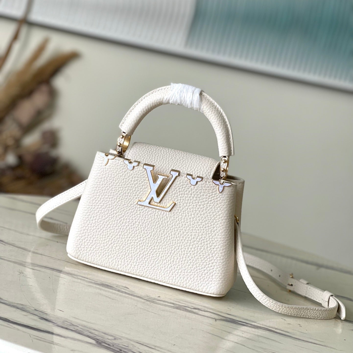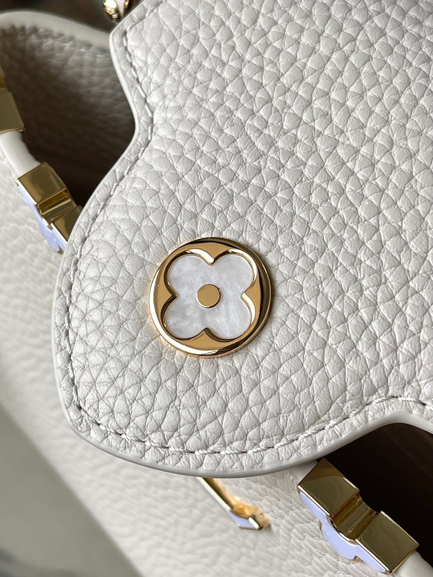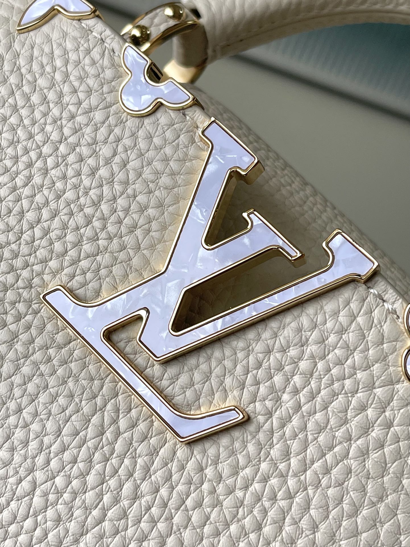 This Capucines Flower Crown Bag is crafted from full-grain Taurillon leather, adorned with Monogram flowers, each delicately shaped from mother-of-pearl. The LV logo complements the floral design, giving this elegant bag a jewel-like sheen. The detachable shoulder strap allows versatile wear—over the shoulder or crossbody at your convenience.