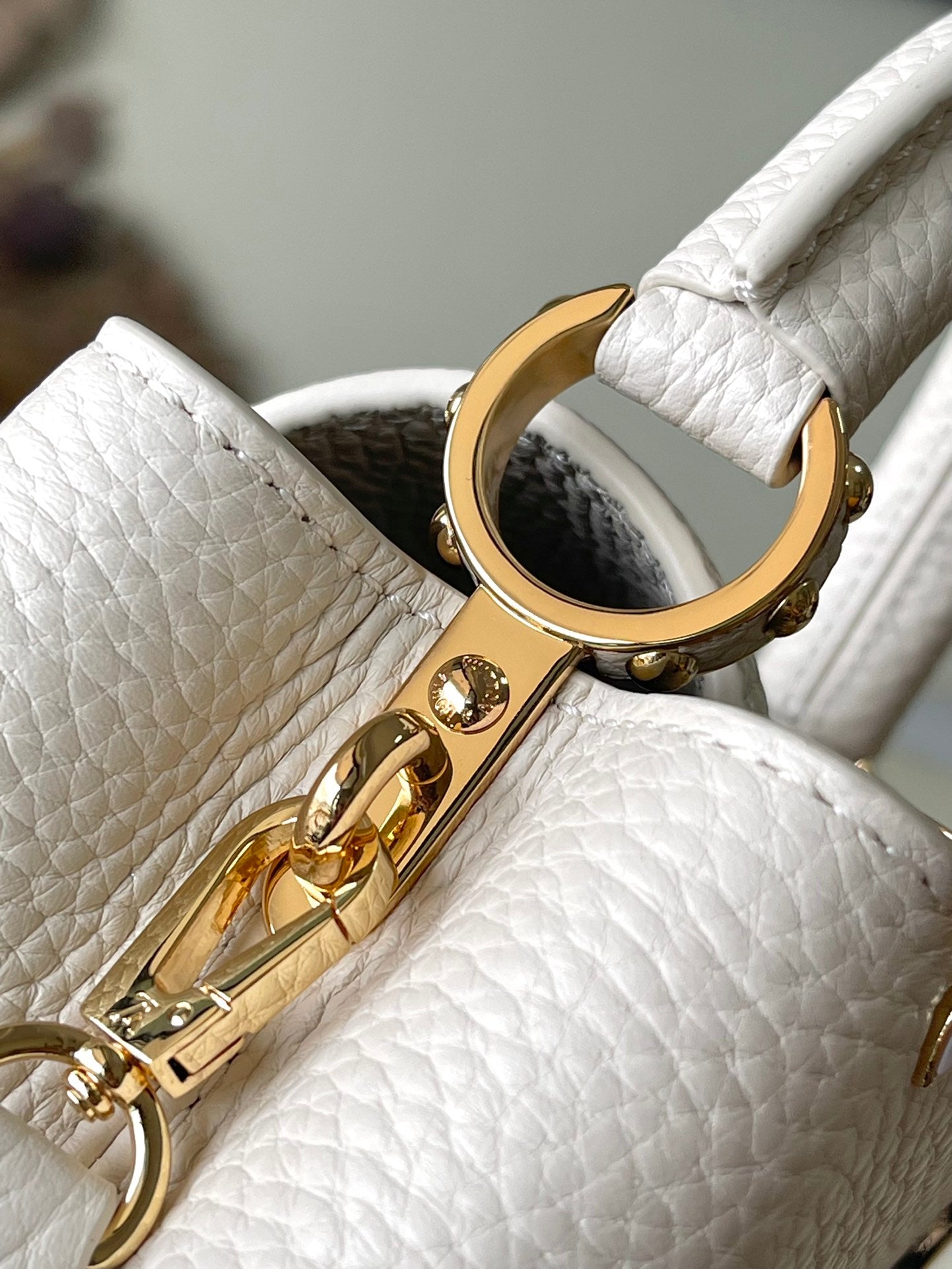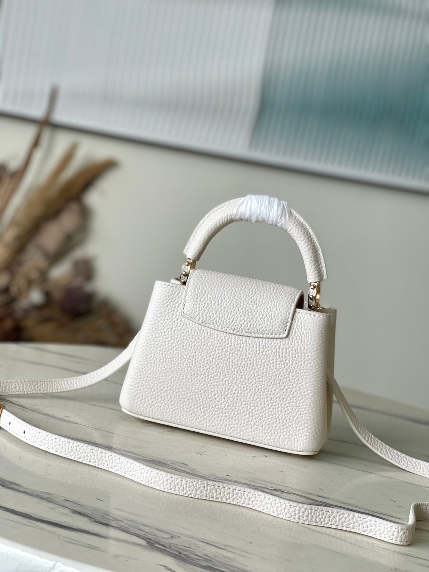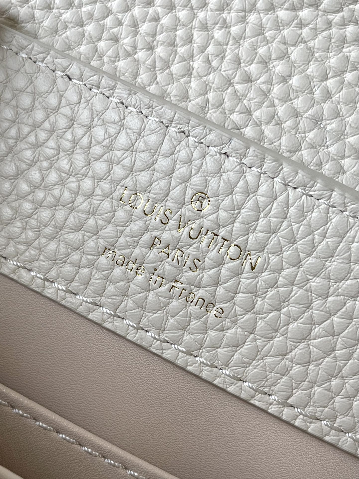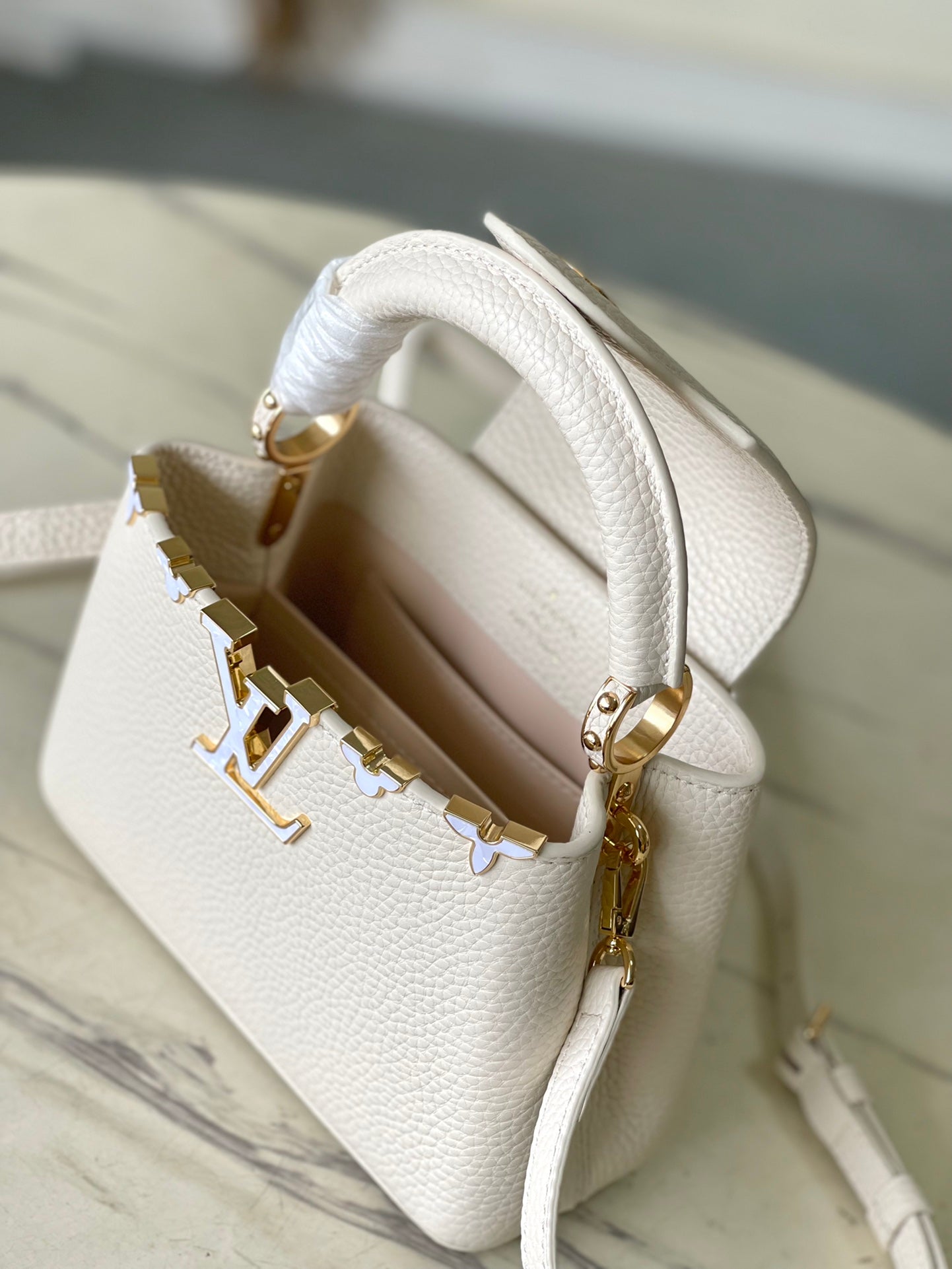 This Capucines Flower Crown Bag is crafted from full-grain Taurillon leather, adorned with Monogram flowers, each delicately shaped from mother-of-pearl. The LV logo complements the floral design, giving this elegant bag a jewel-like sheen. The detachable shoulder strap allows versatile wear—over the shoulder or crossbody at your convenience.