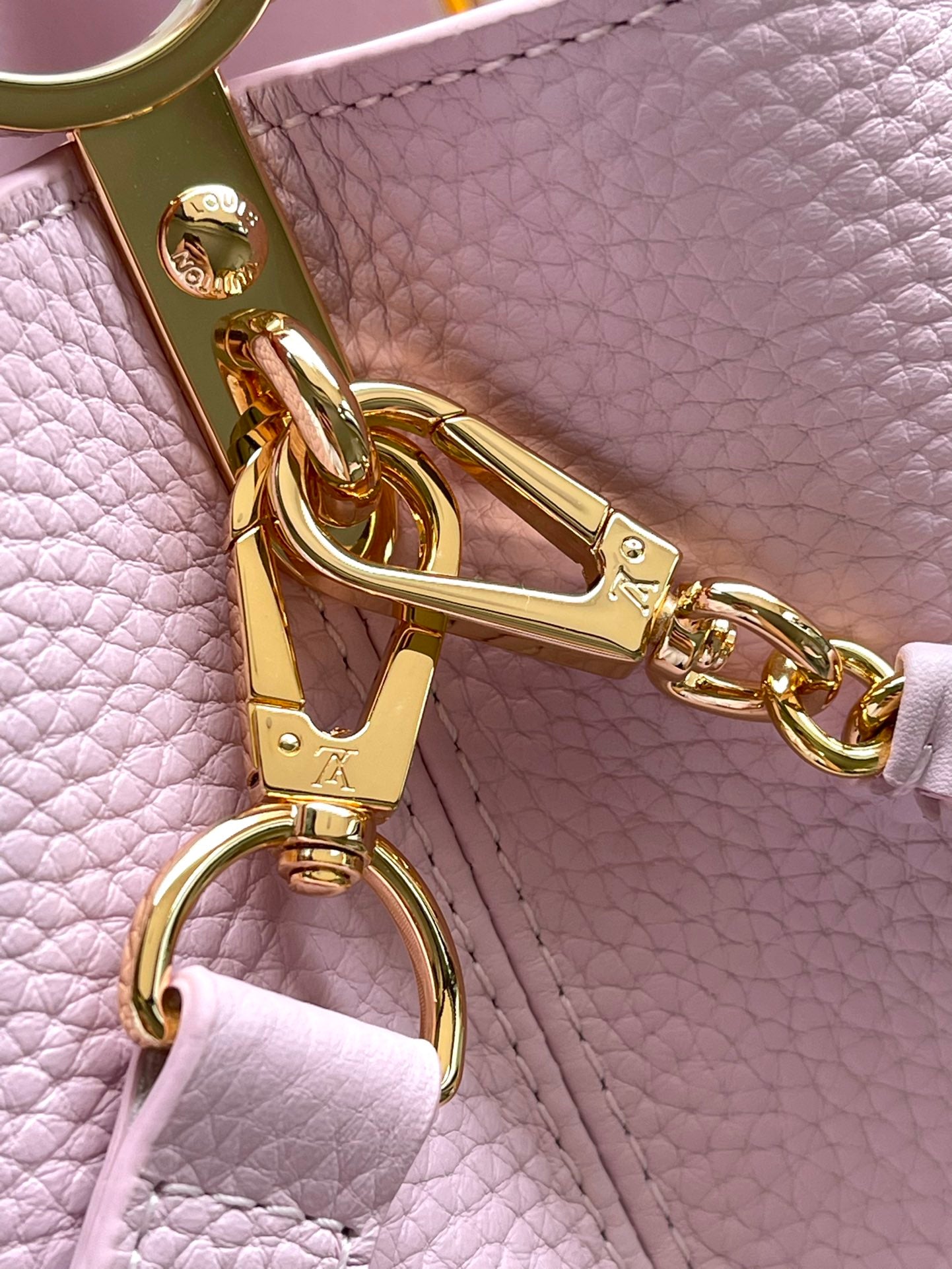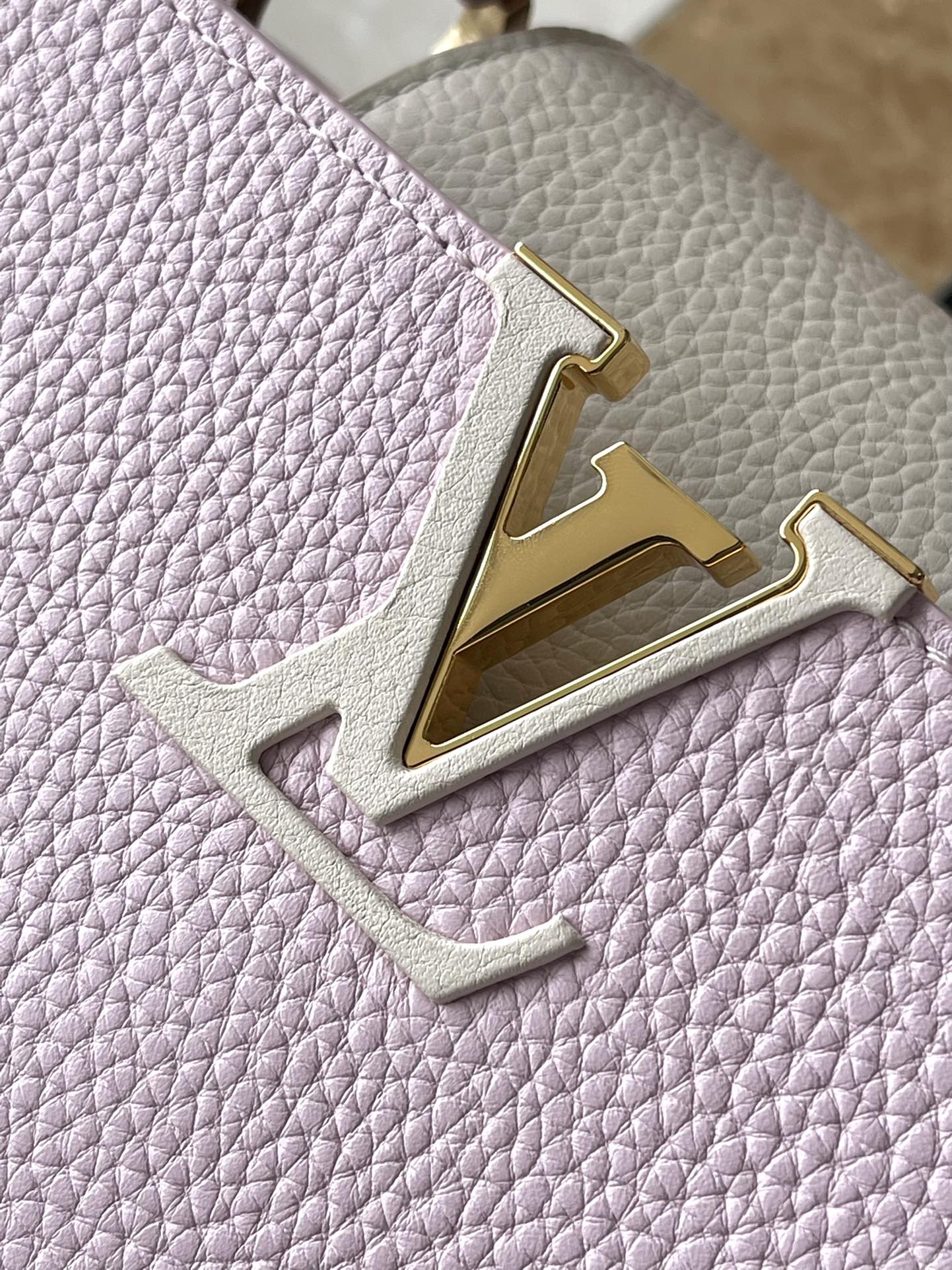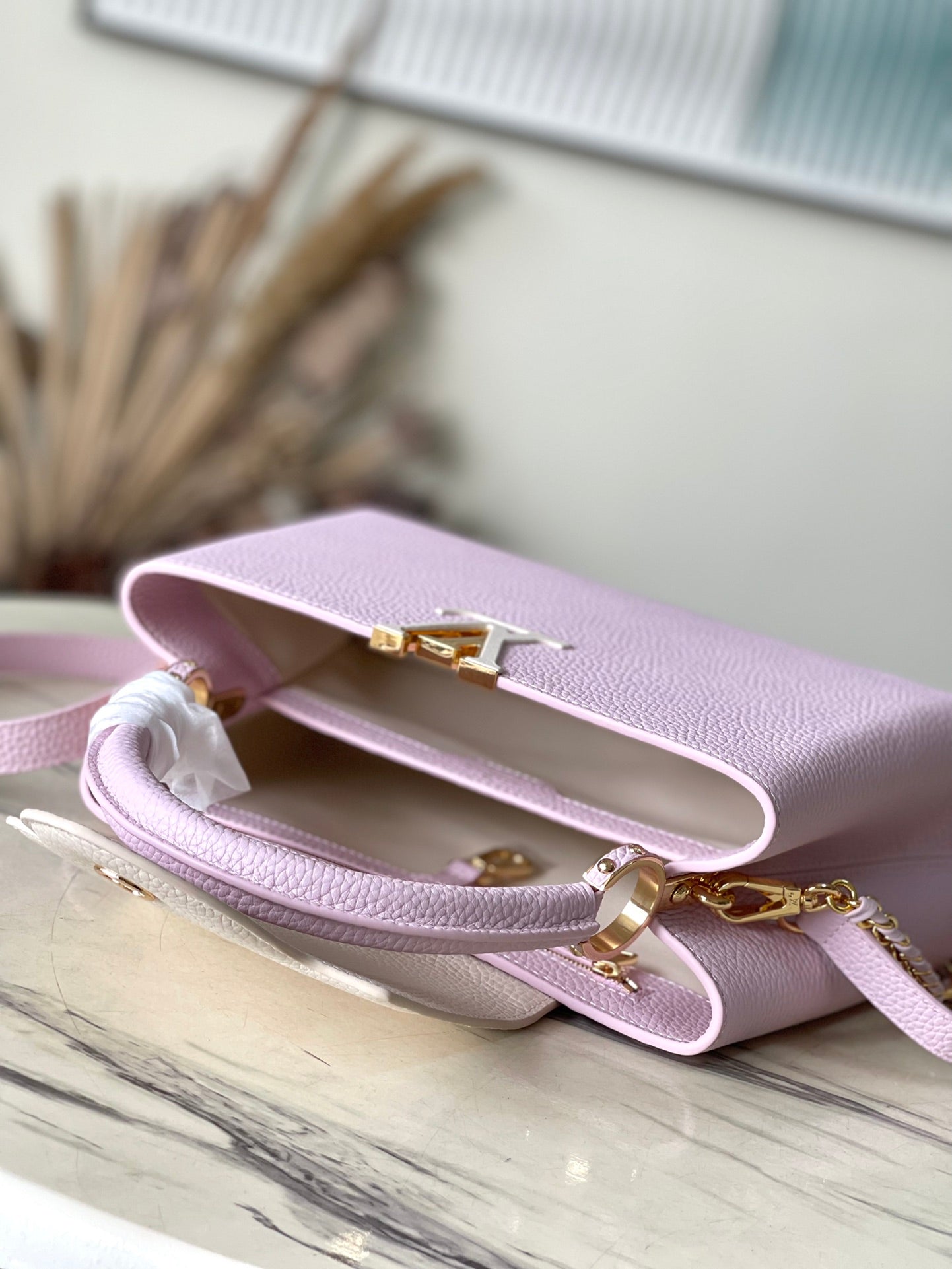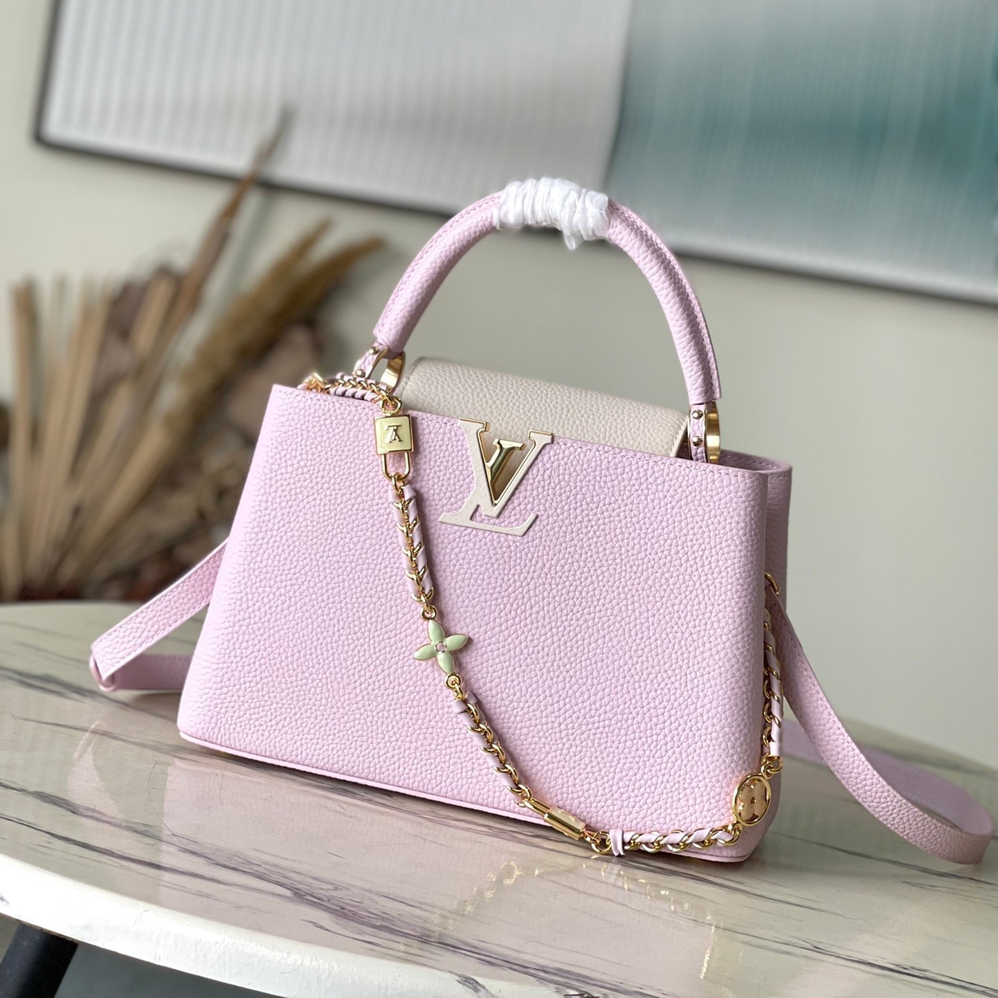 This Capucines medium handbag features a luxurious Lovelock woven chain, linking hand-painted Monogram elements with the LV engraved padlock. Contrasting leather forms the signature LV emblem, exuding understated elegance.