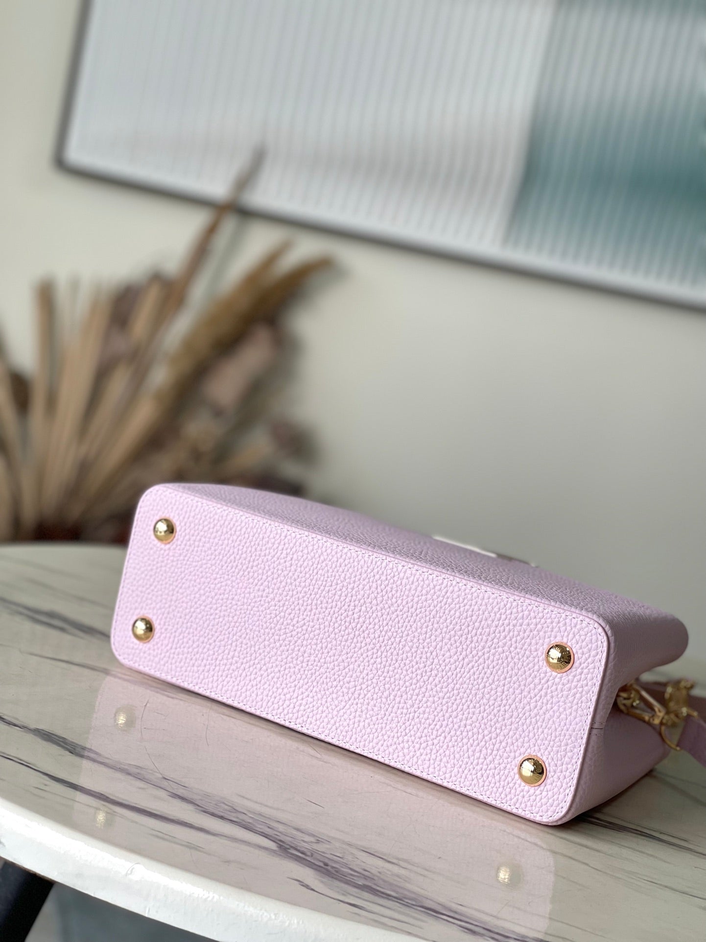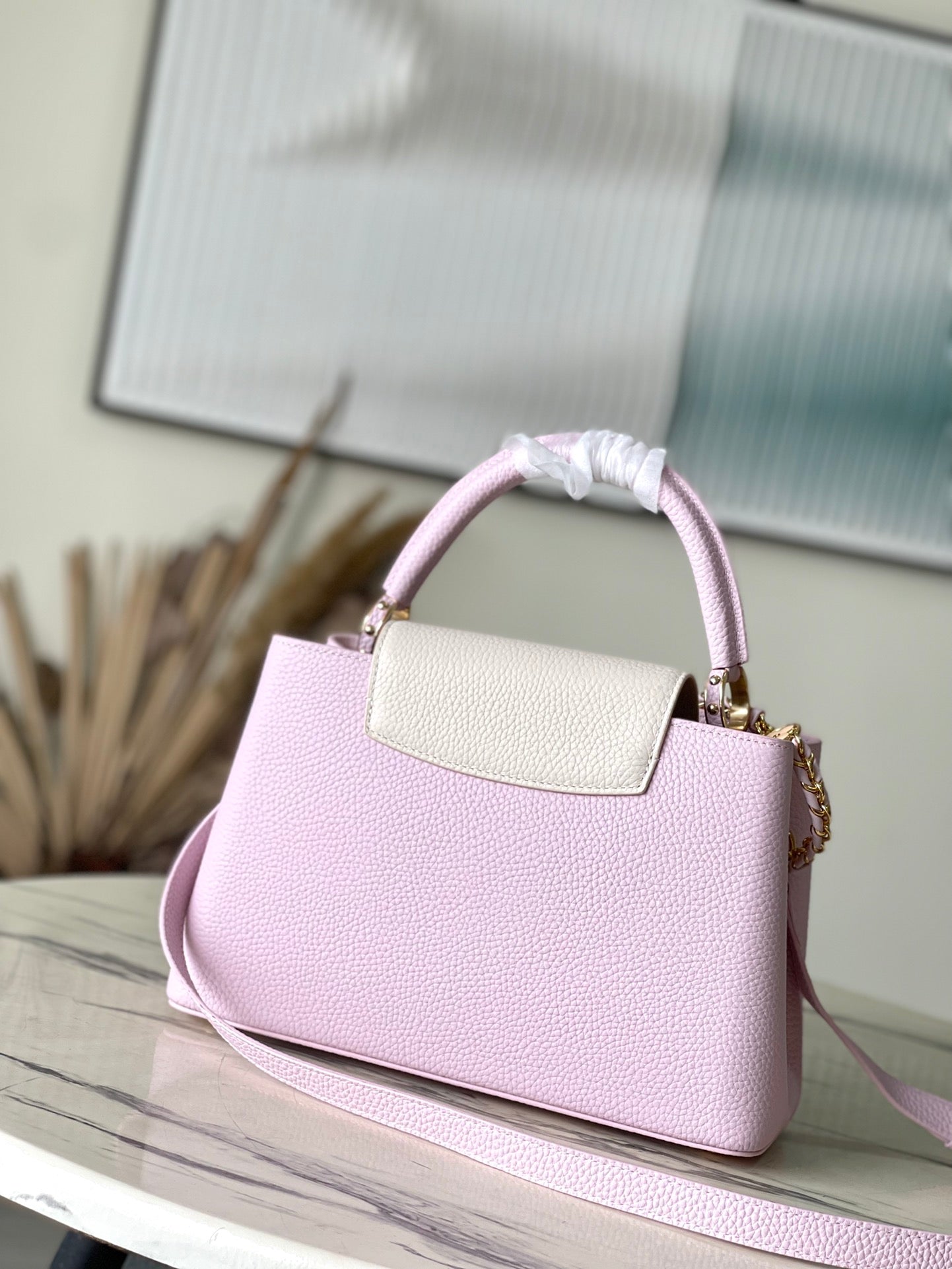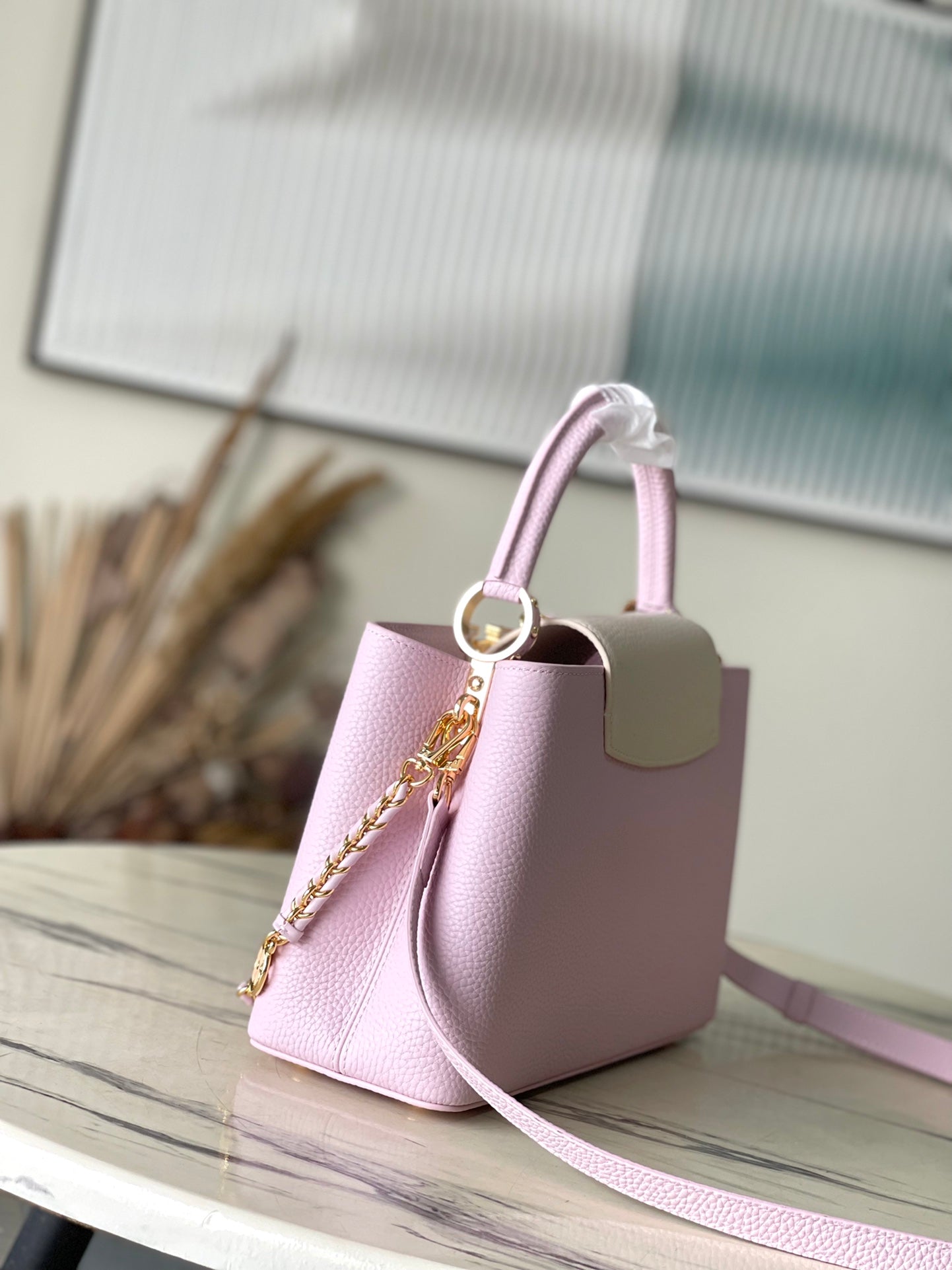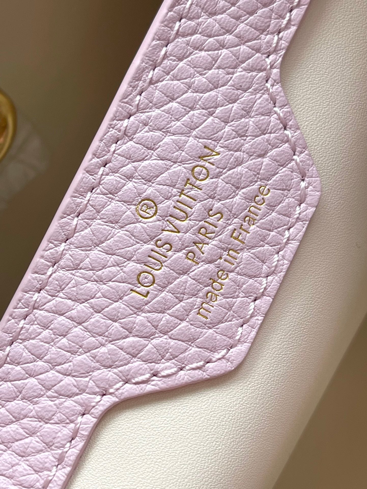 This Capucines medium handbag features a luxurious Lovelock woven chain, linking hand-painted Monogram elements with the LV engraved padlock. Contrasting leather forms the signature LV emblem, exuding understated elegance.