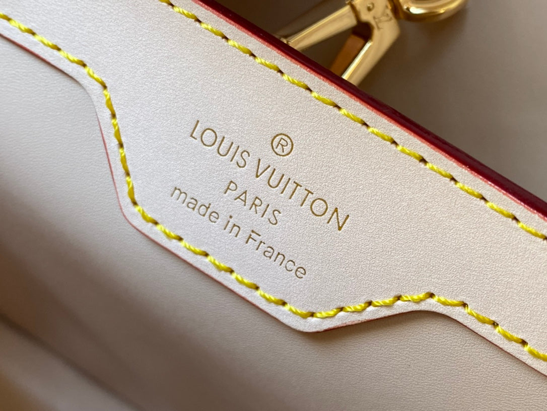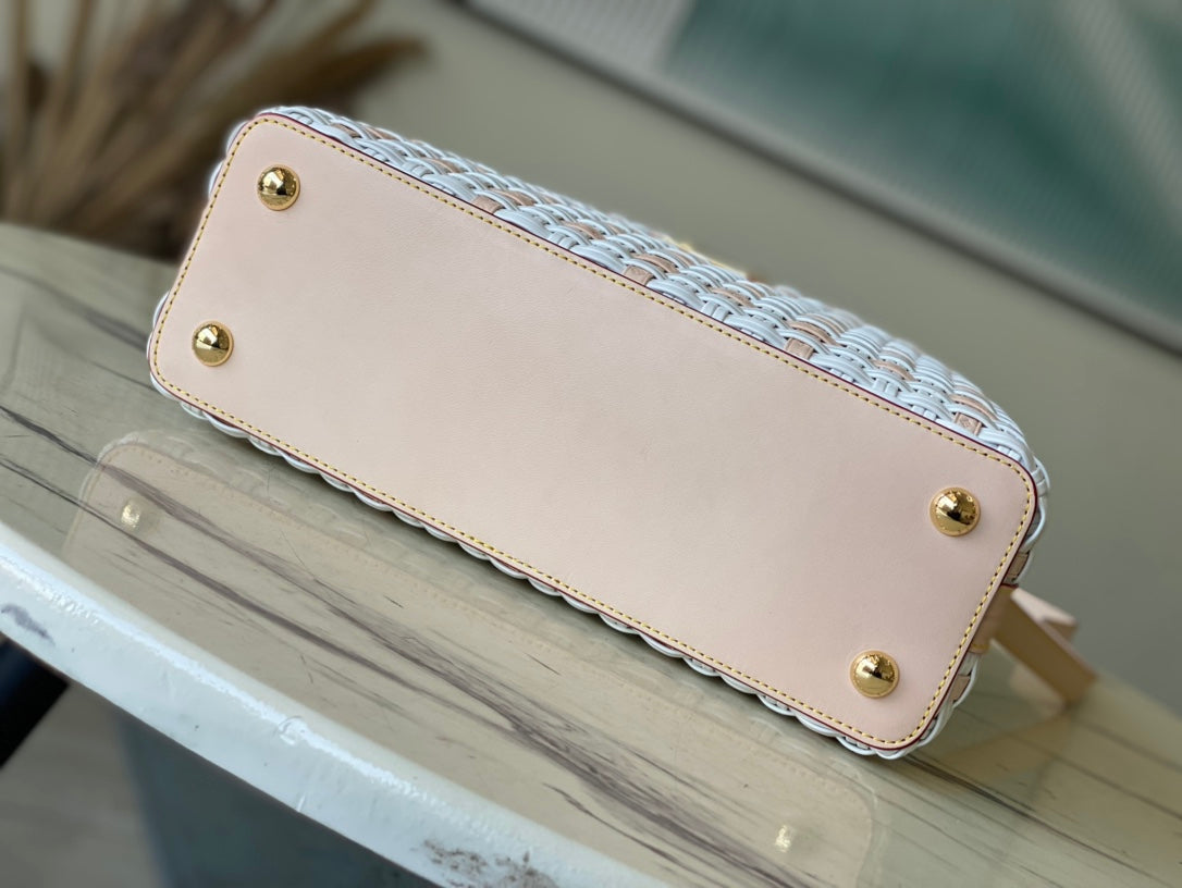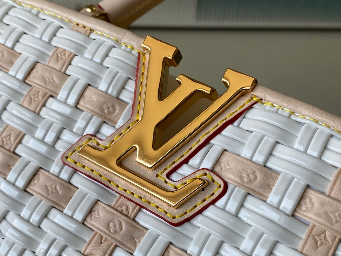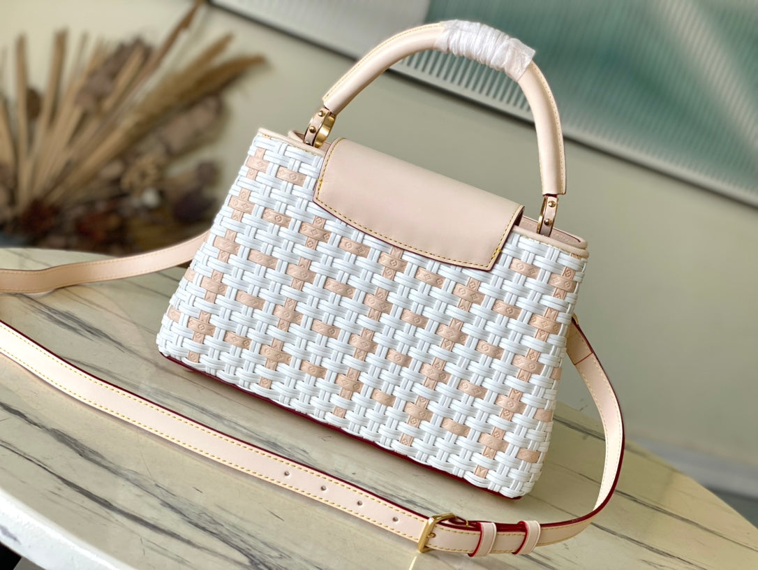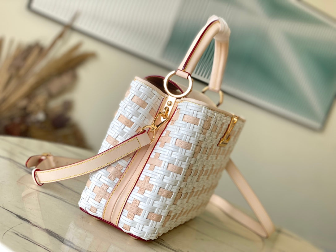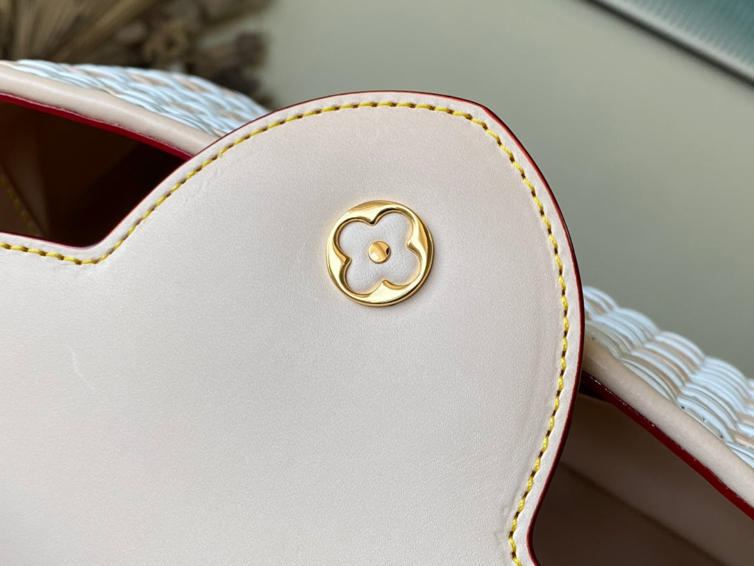 The LV Heavenly Capucines handbag from the Valentine’s Day limited edition collection is crafted with an intricate weave of canvas straps and LV-embossed leather. The top handle, flap, and adjustable shoulder strap are fashioned from smooth leather, while the leather-and-metal LV signature completes the design.