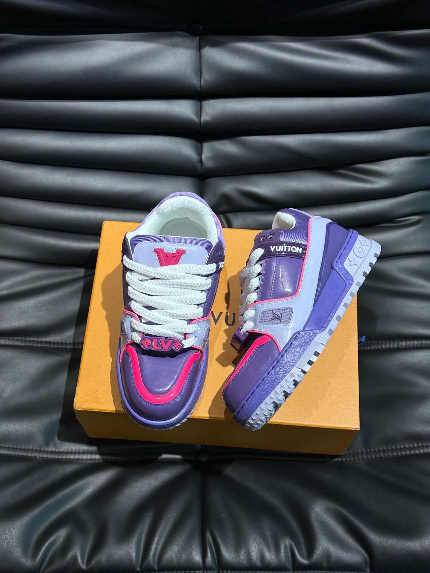 This design amplifies the classic LV Trainer sneakers and is inspired by the 2024 Spring/Summer men’s fashion show. Rubber LV logo accents on the tongue, sides, and heel. Wide fabric laces decorated with Louis Vuitton bead logo.